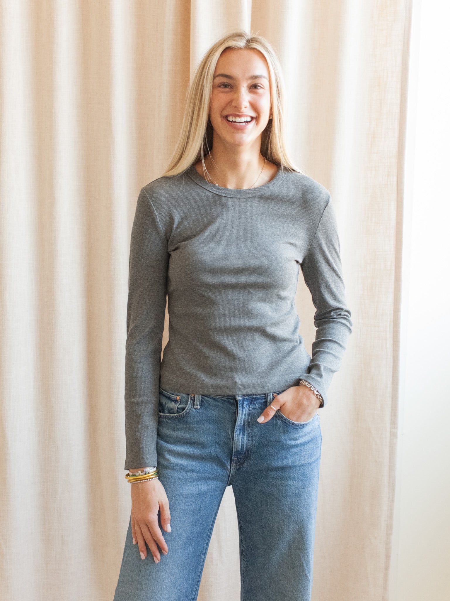 A basic long sleeve ribbed tee perfect for fall and winter layering. Features a crew neckline and fitted silhouette.
