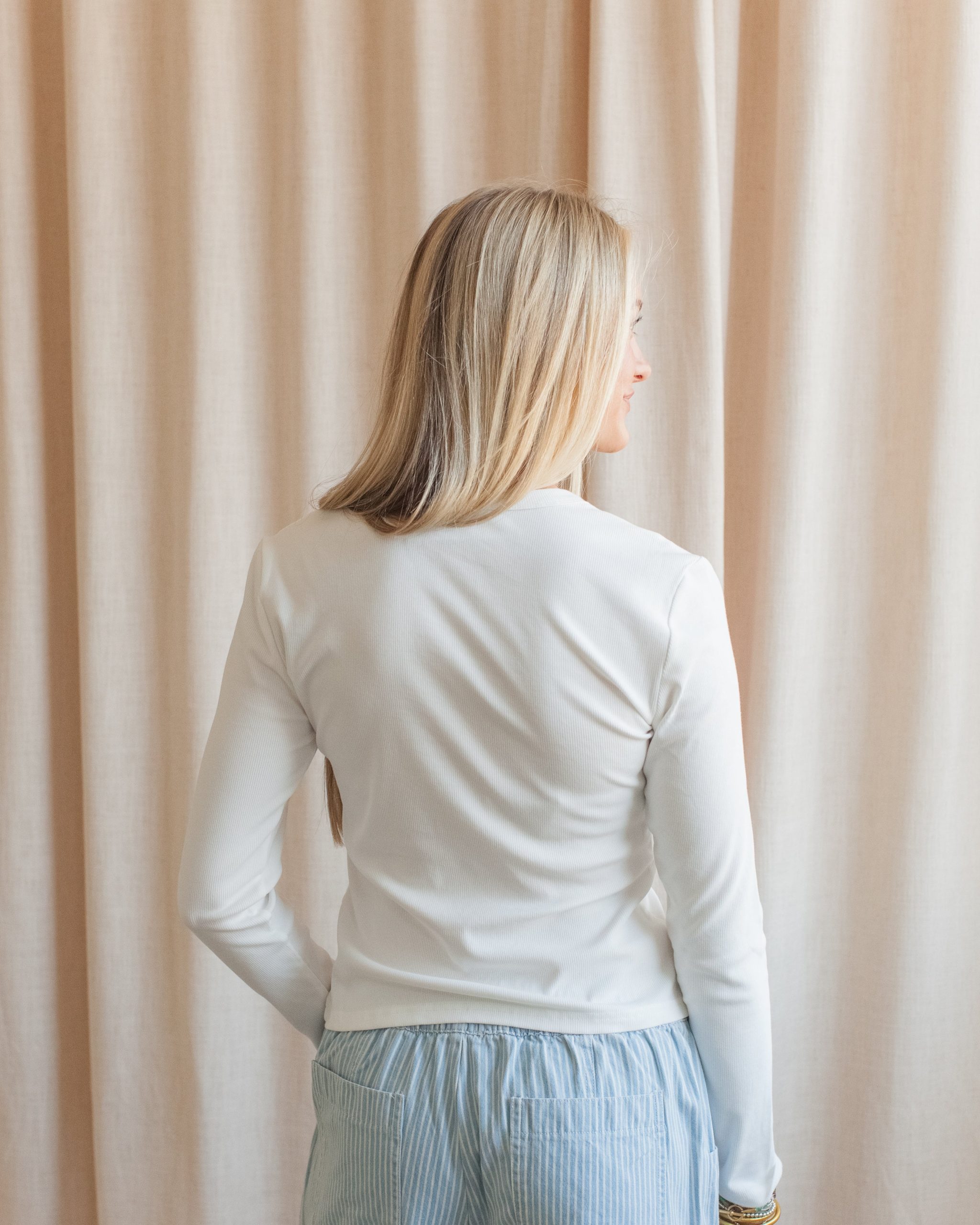 A basic long sleeve ribbed tee perfect for fall and winter layering. Features a crew neckline and fitted silhouette.
