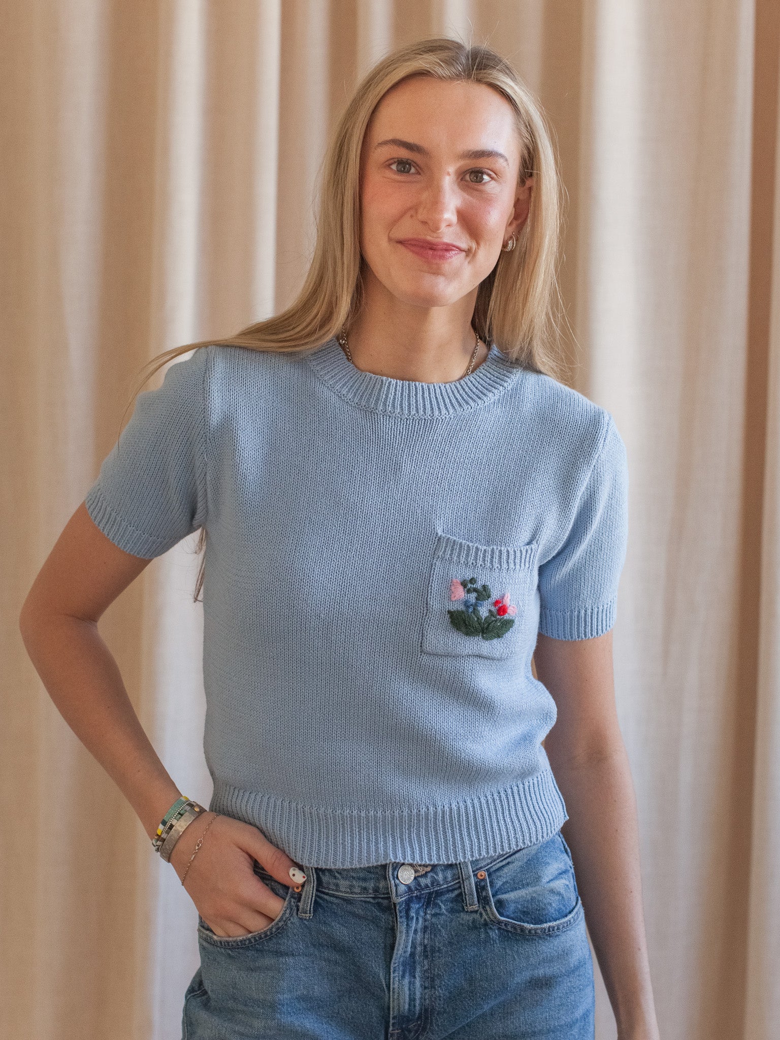 This short sleeve knit top features a small front pocket with floral embroidery. a crew neckline. and ribbed trim. Pair with denim or a skirt for an easy spring look.