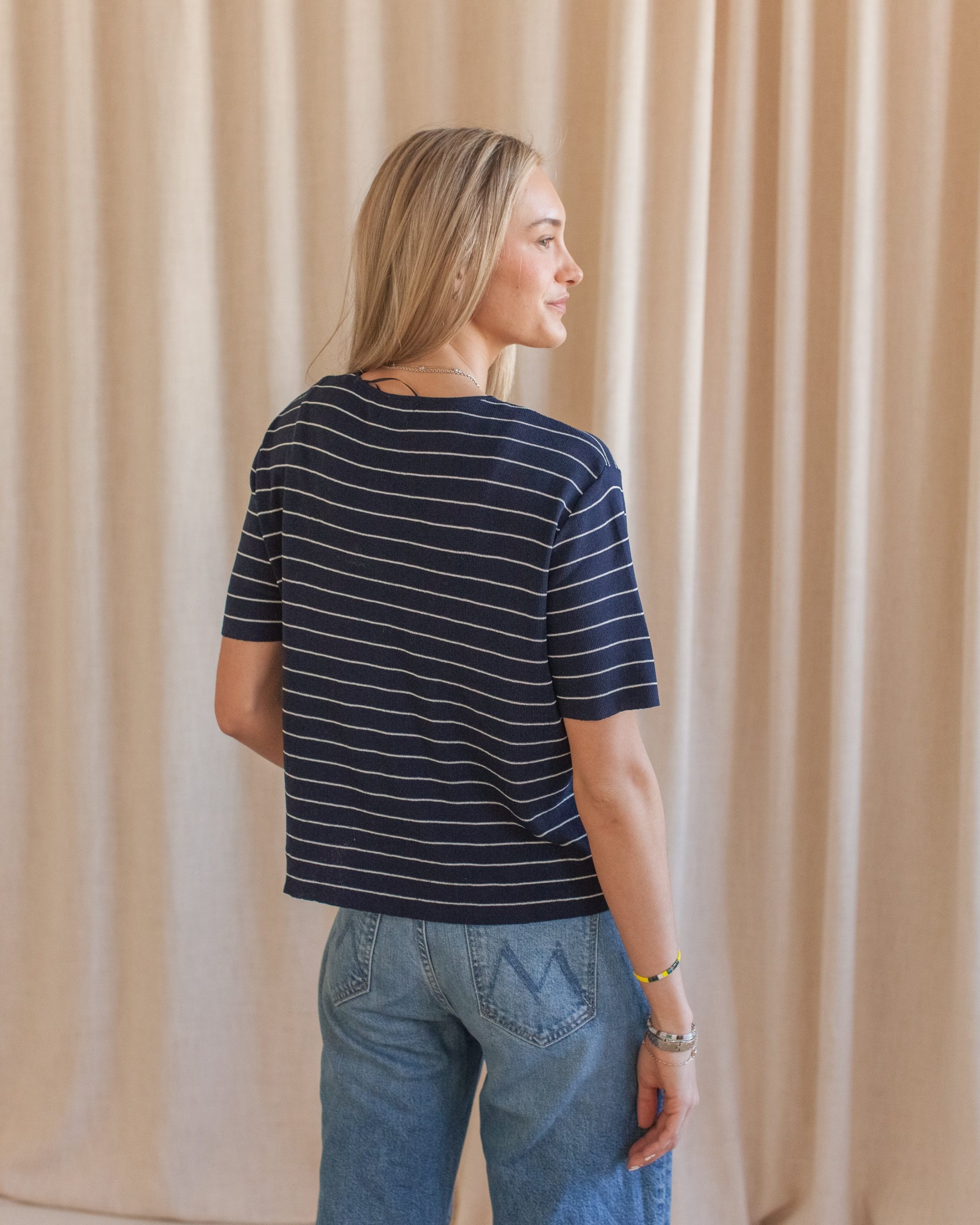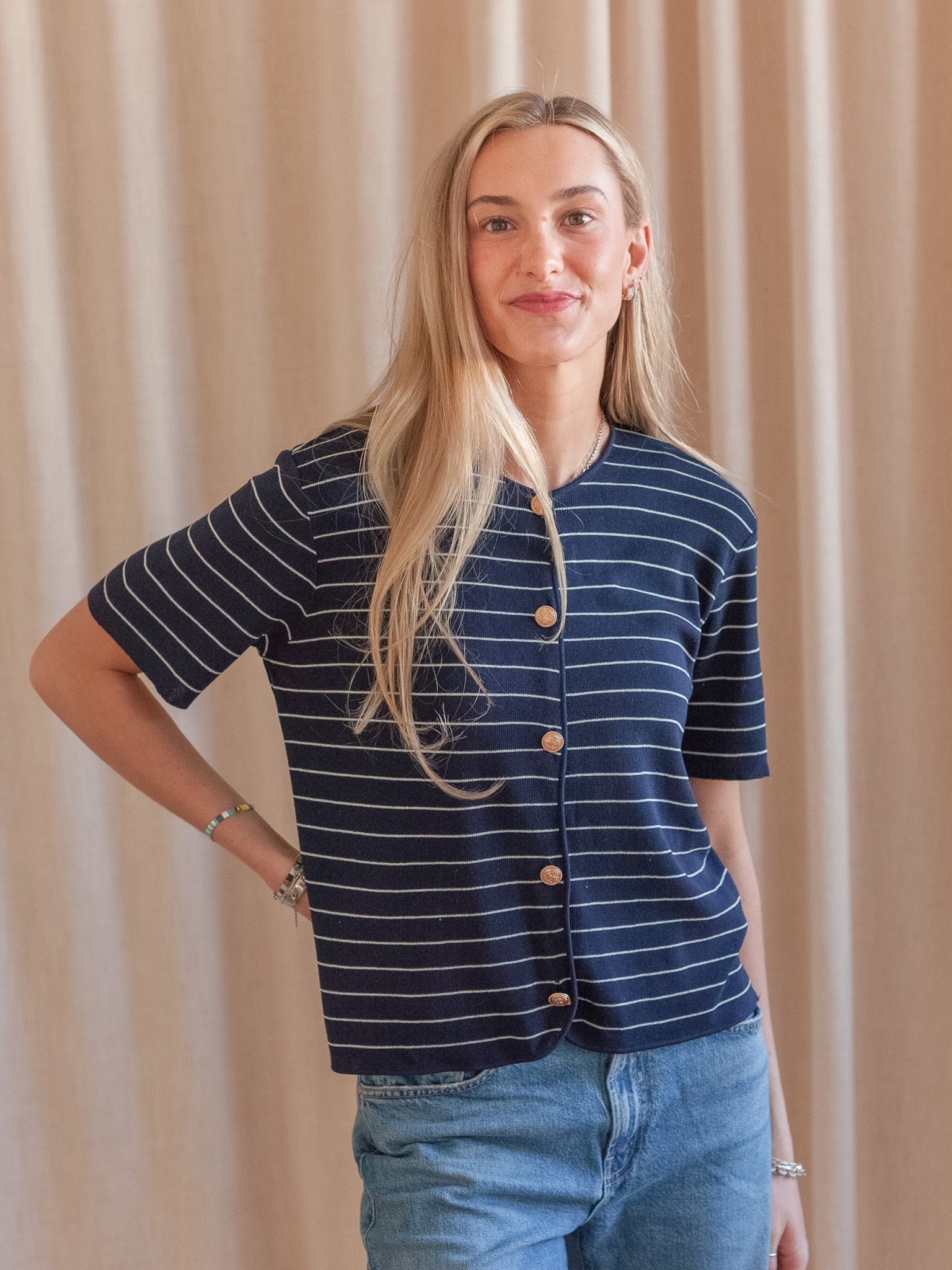 A lightweight knit short sleeve cardigan style top with contrasting gold buttons and a crew neckline. Pair with denim or white pants for spring.