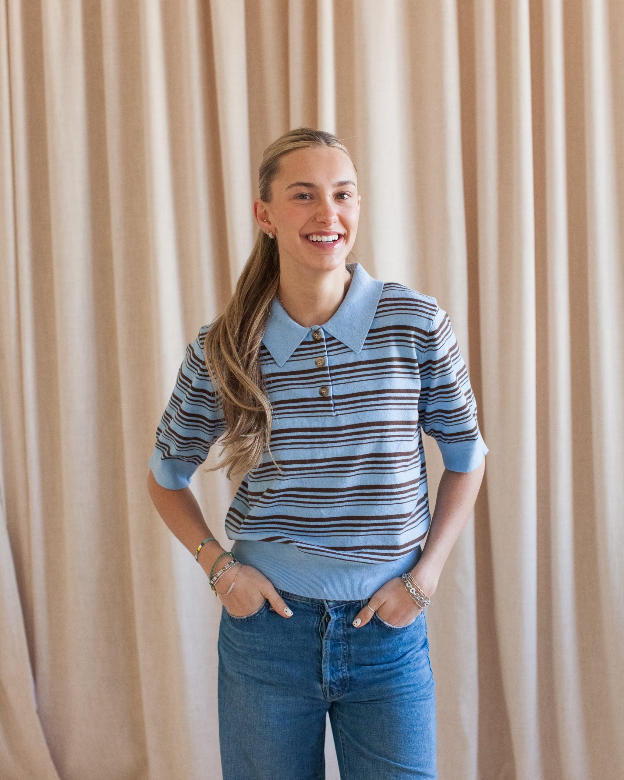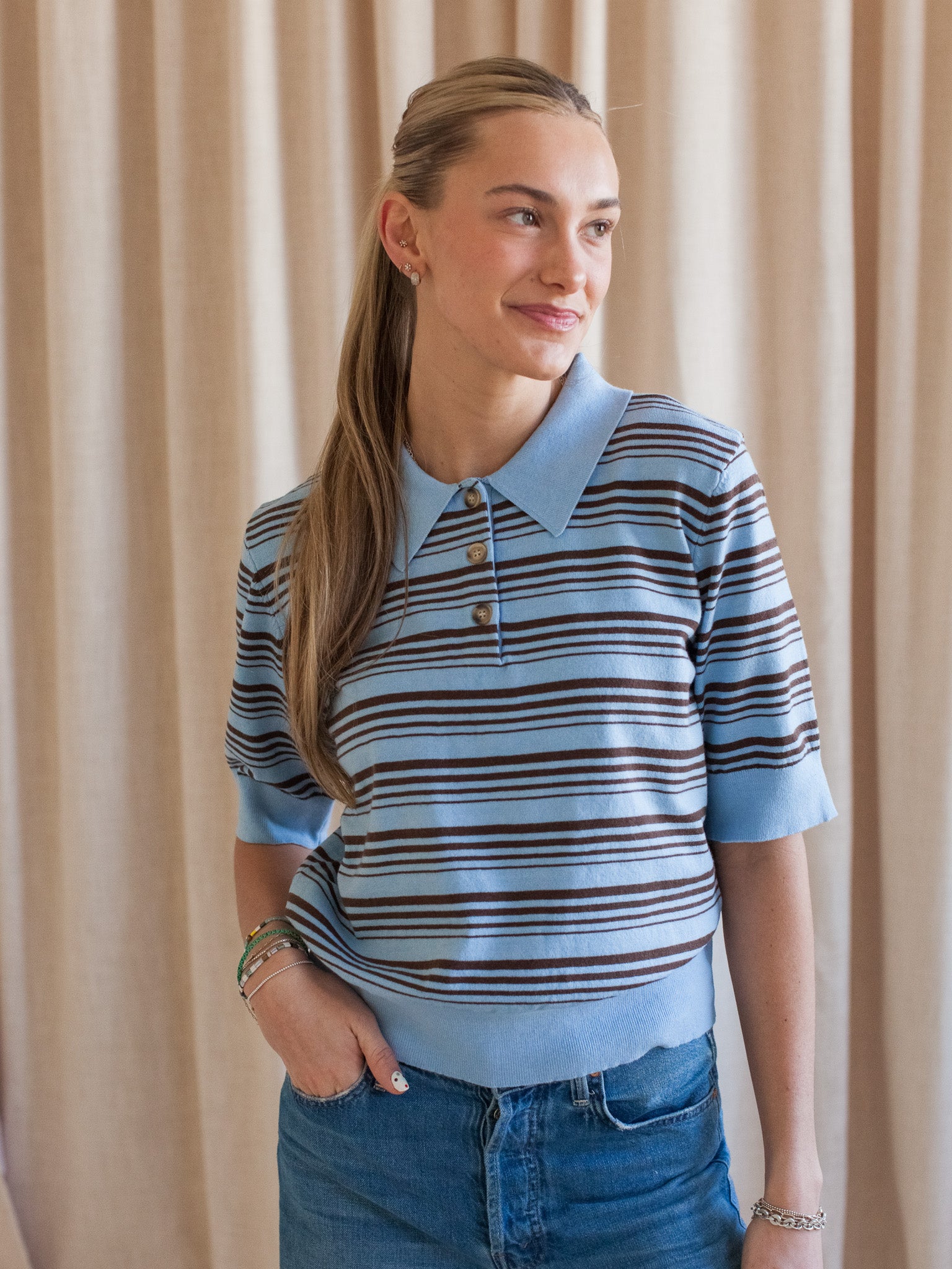 A knit short sleeve striped polo top with contrast collar. cuffs. and waistband. Also features buttons at neckline. Pair with denim or trousers this spring.