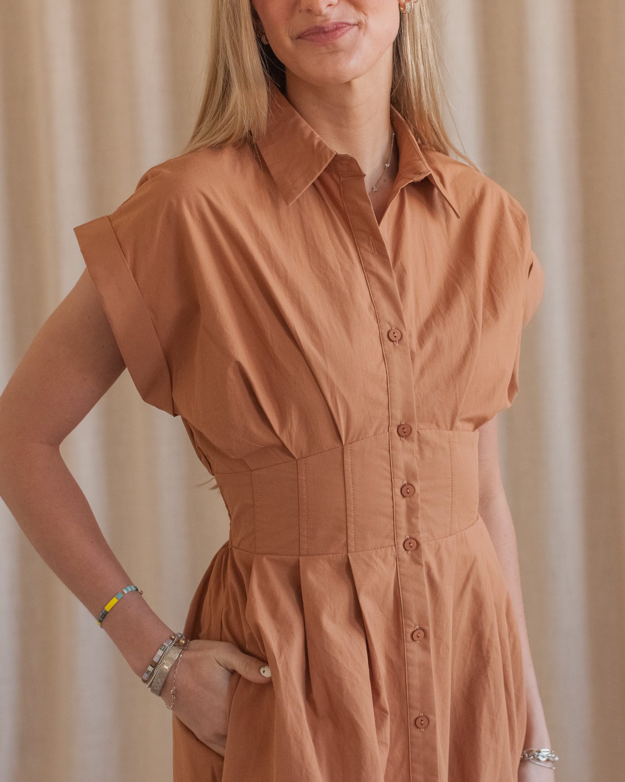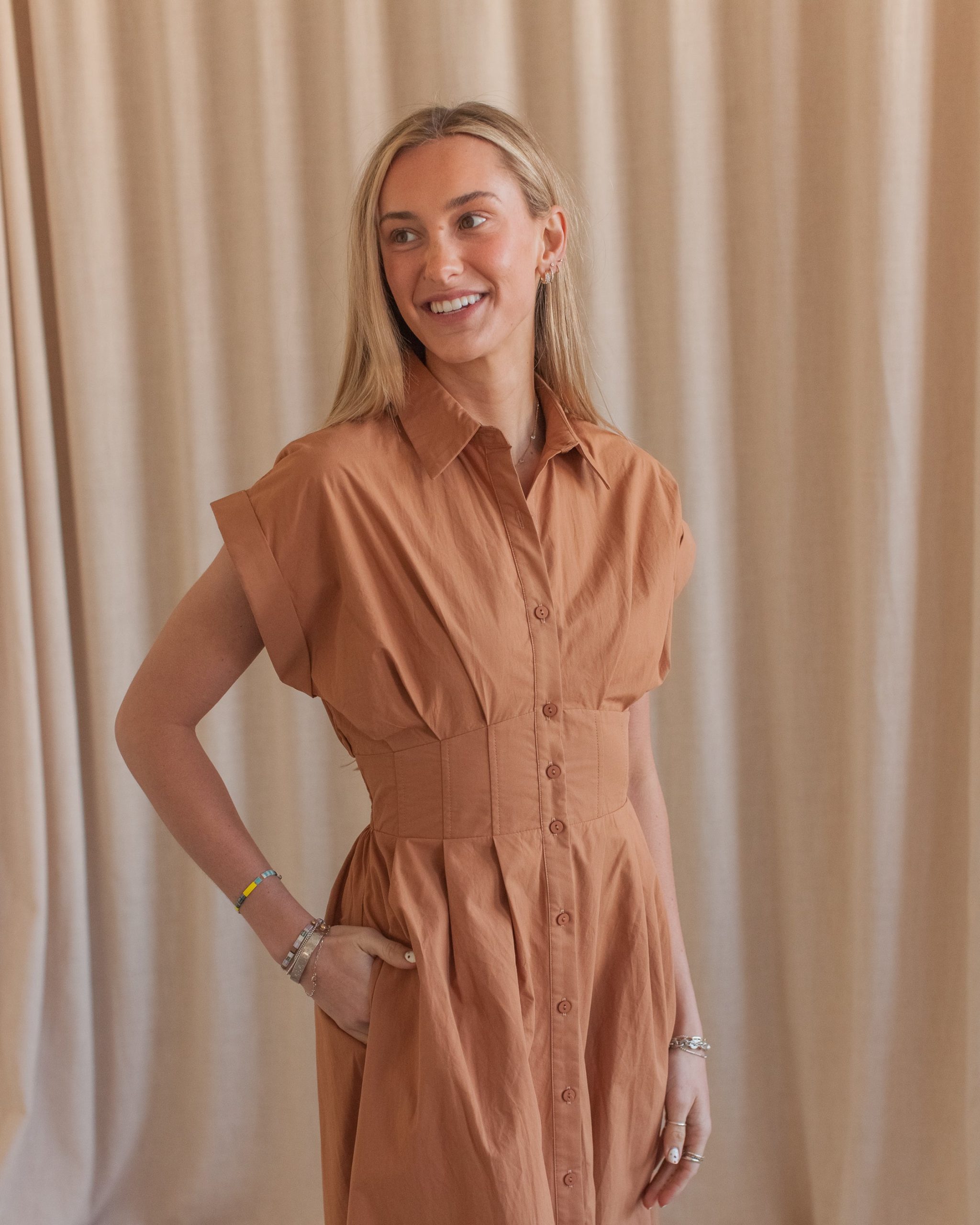 A classic button front shirt dress with short sleeves. pockets. and a wide fitted waistband. Pair with sandals or white sneakers to complete the look.