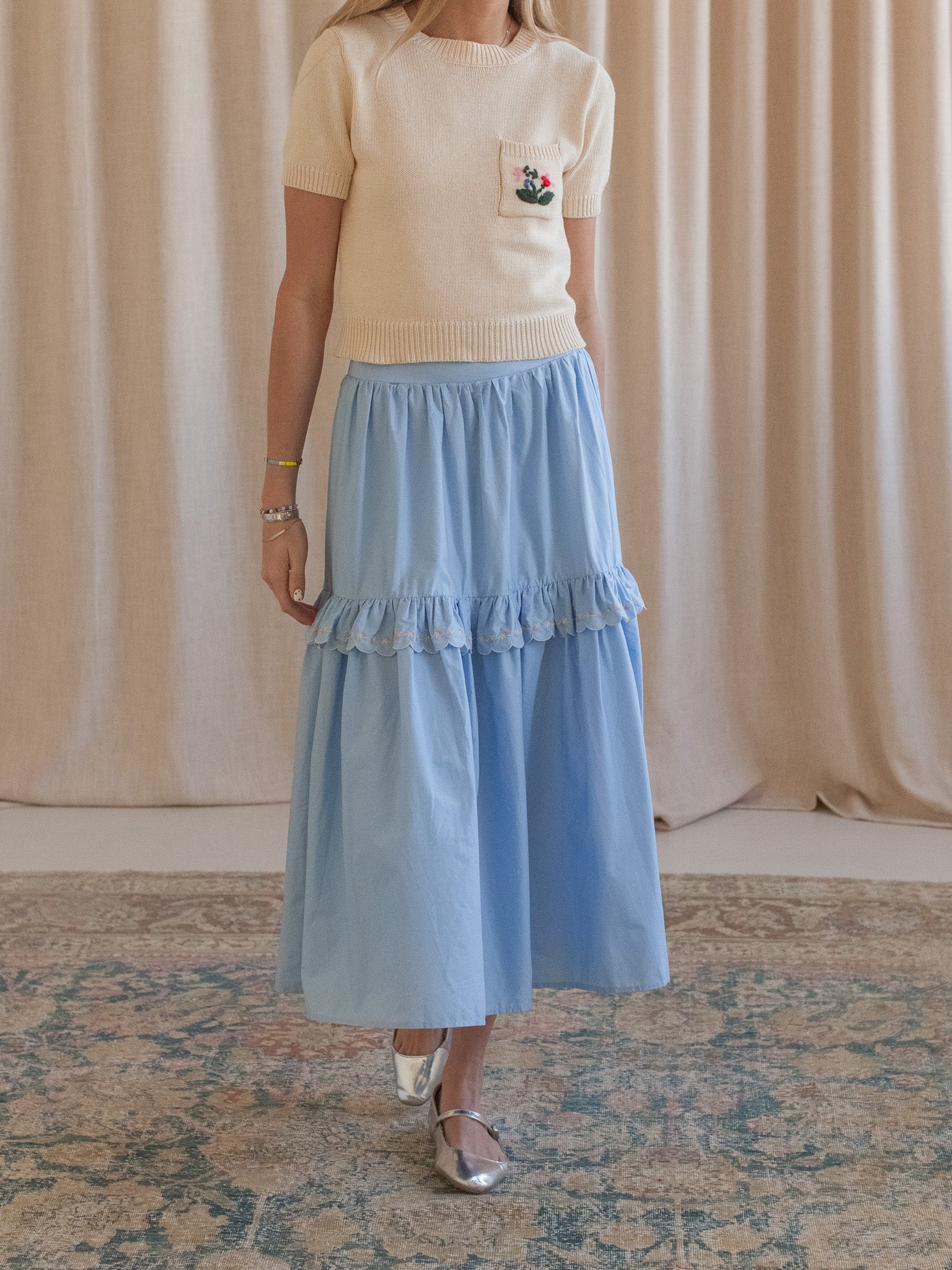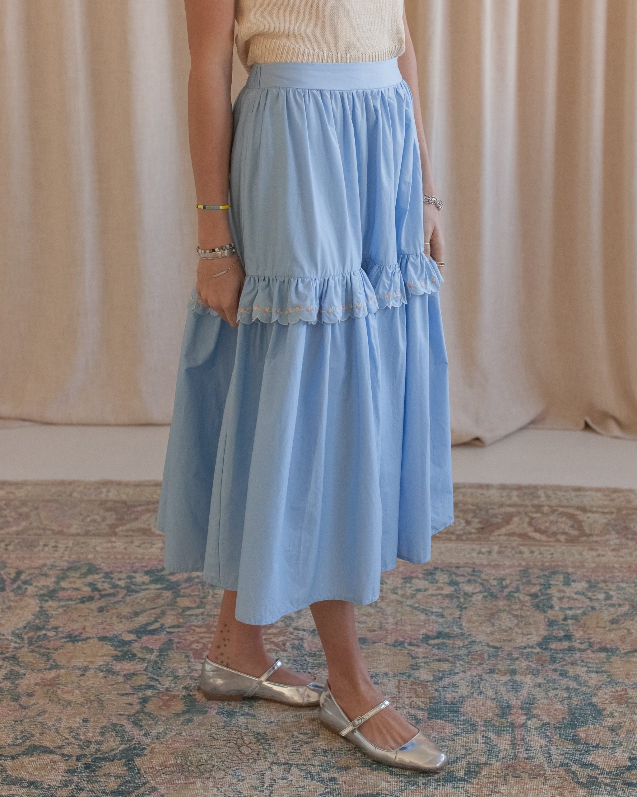 This tiered cotton midi skirt features a center ruffle with floral embroidery details. Skirt is lined and has a partially elasticized waistband for comfort.