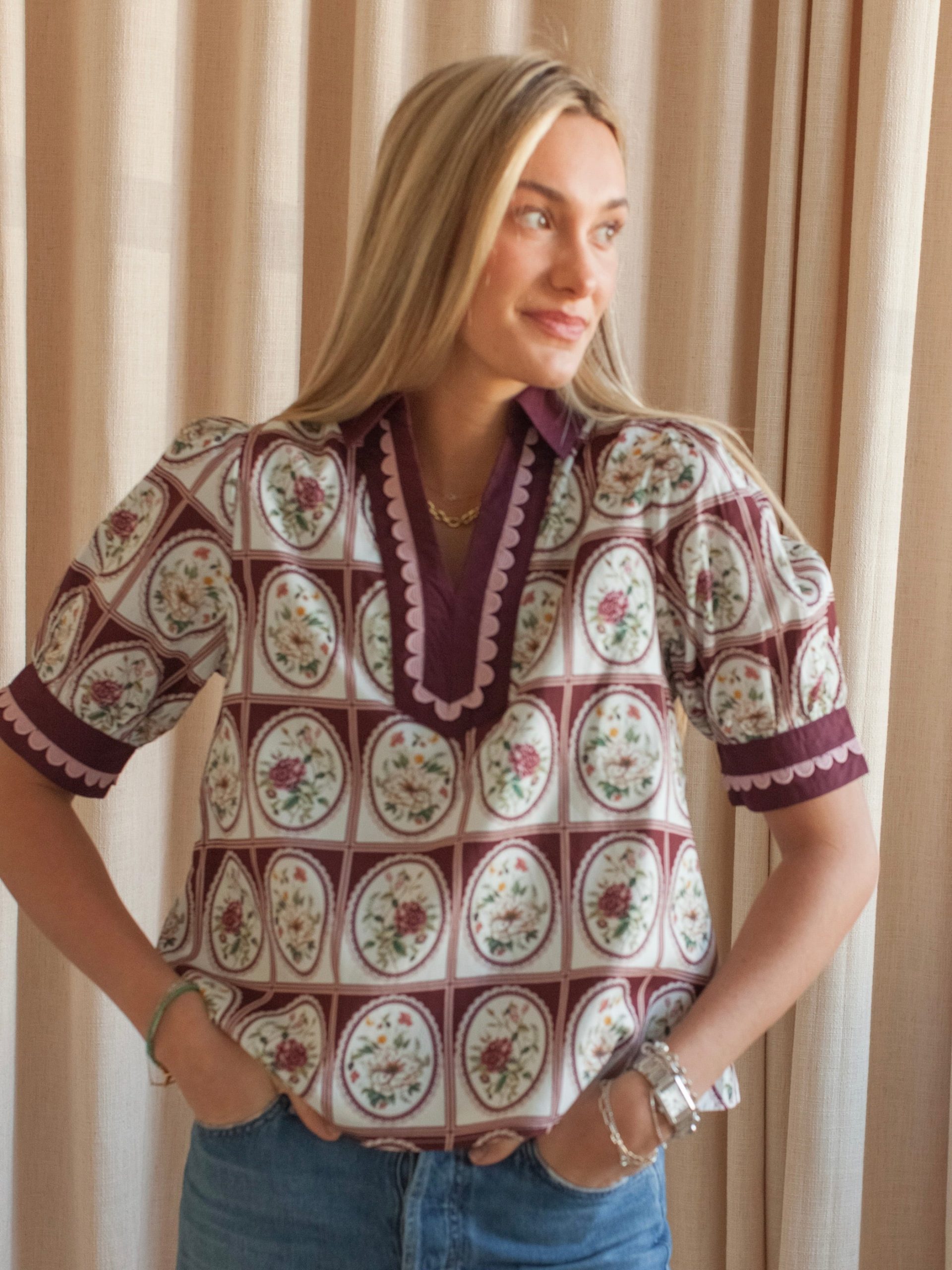 A charming vintage-inspired blouse featuring an intricate floral medallion print in burgundy and soft cream tones. Designed with a structured collar. scalloped trim. and contrast detailing along the neckline and sleeves. Pair with dark denim and boots this season.