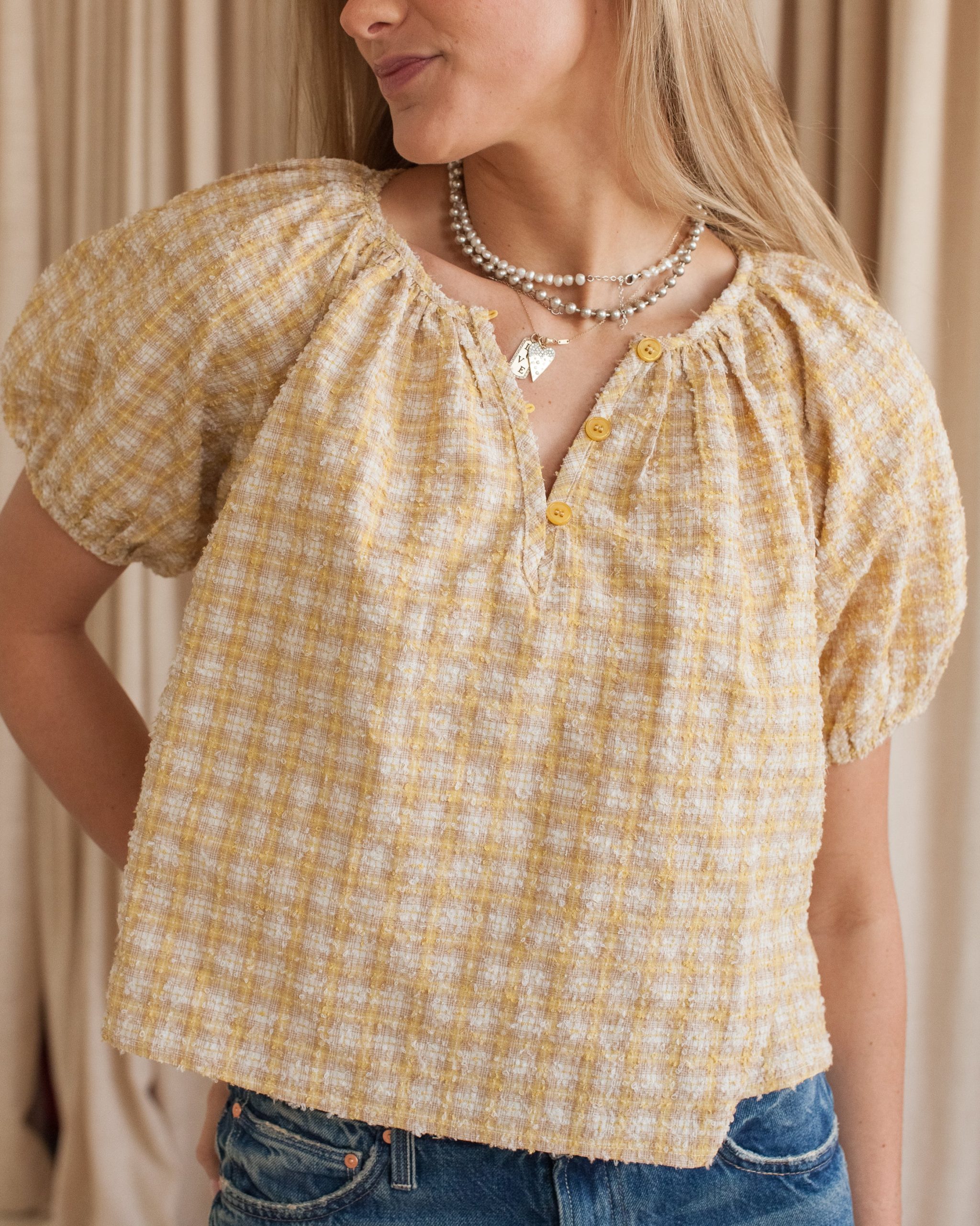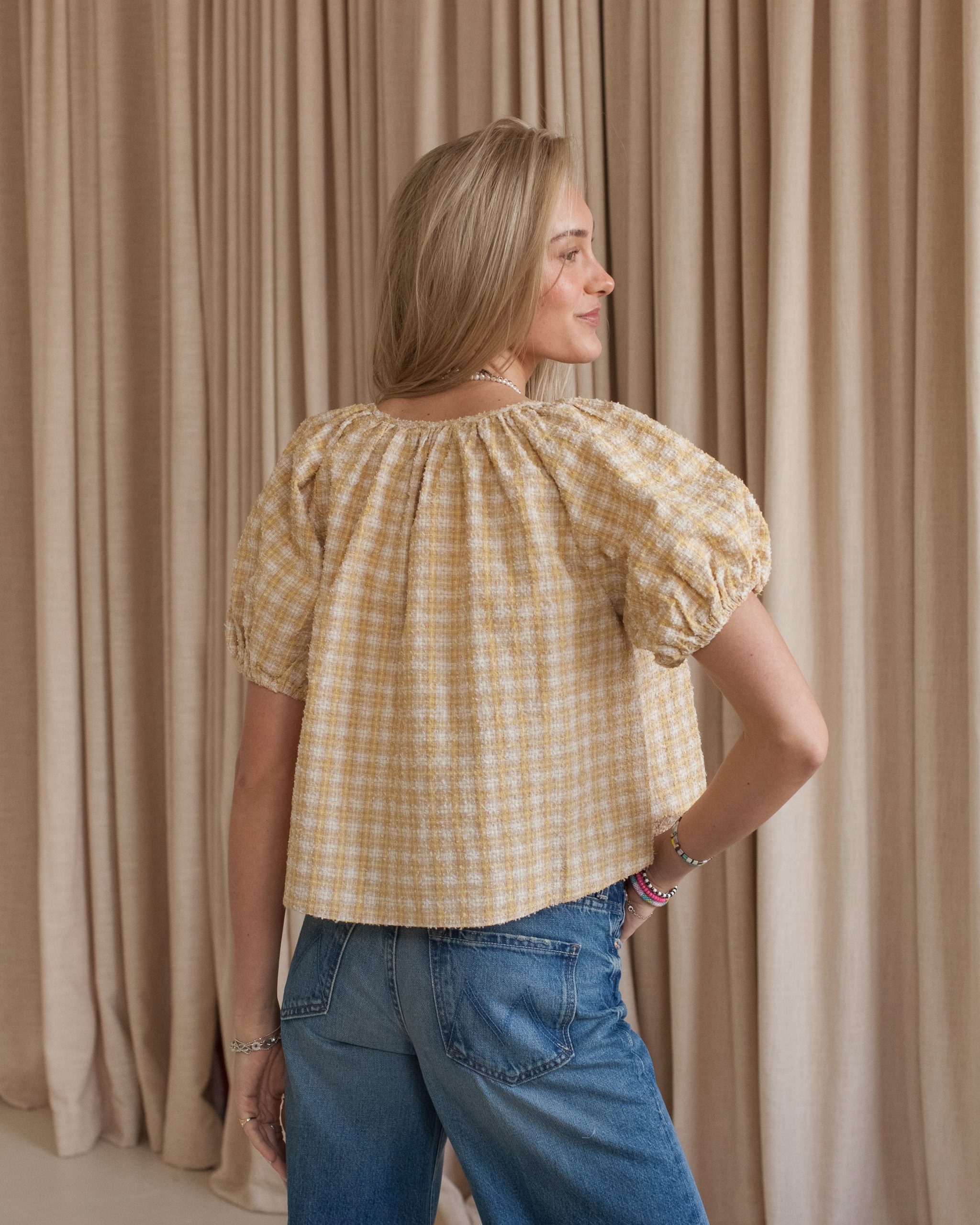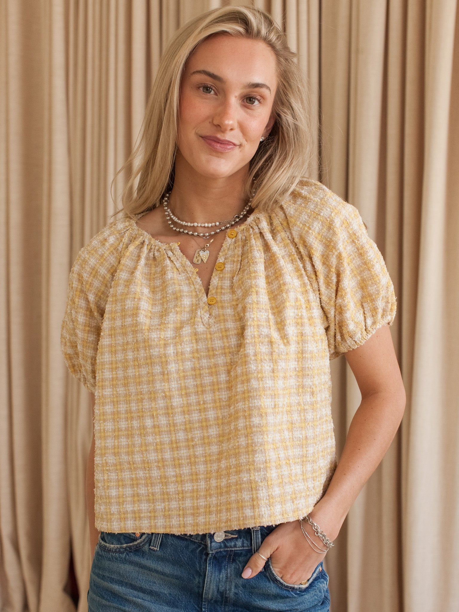 A plaid blouse with puff sleeves and a relaxed fit. Featuring a soft textured fabric and button front detail. Pair with denim and sneakers.
