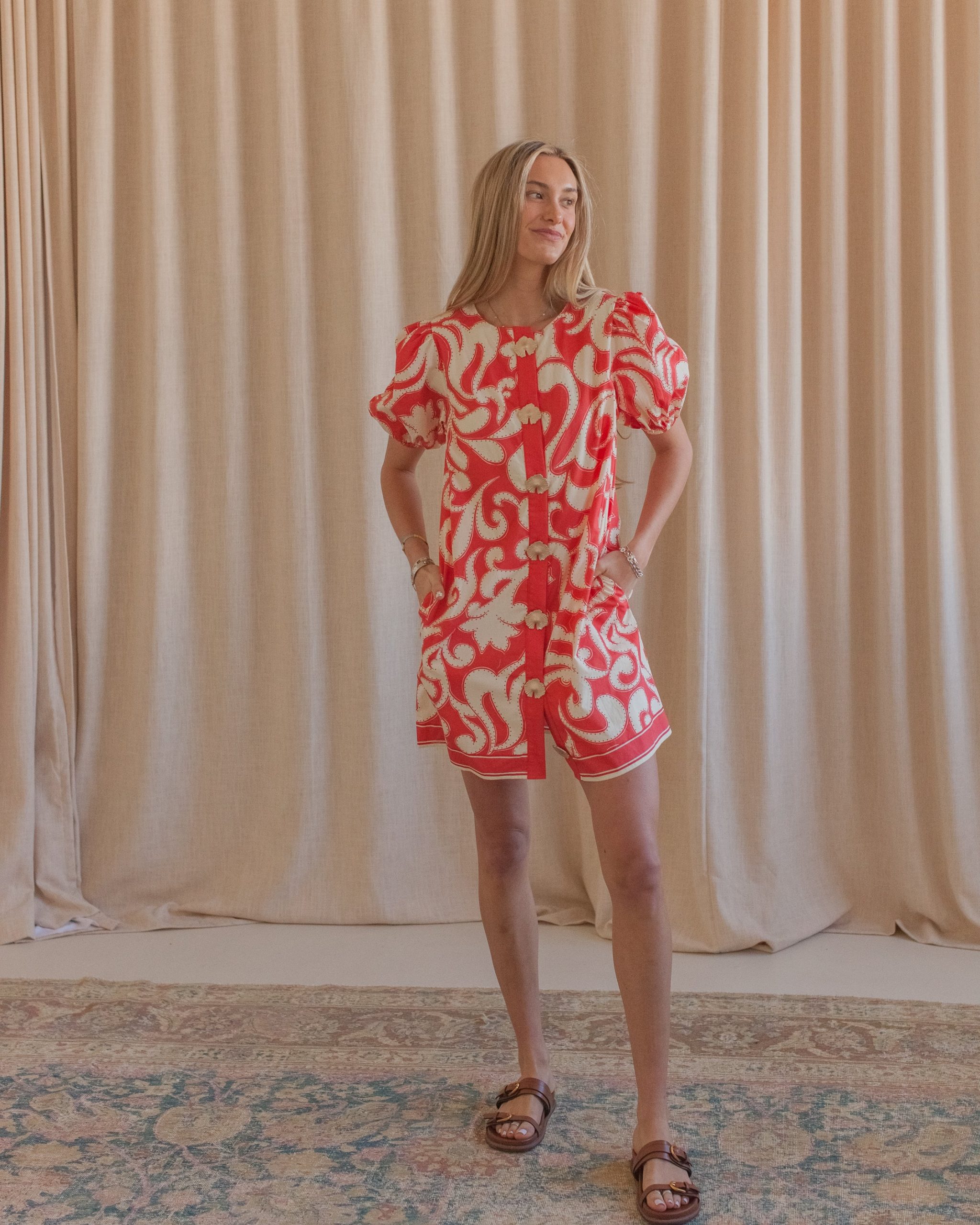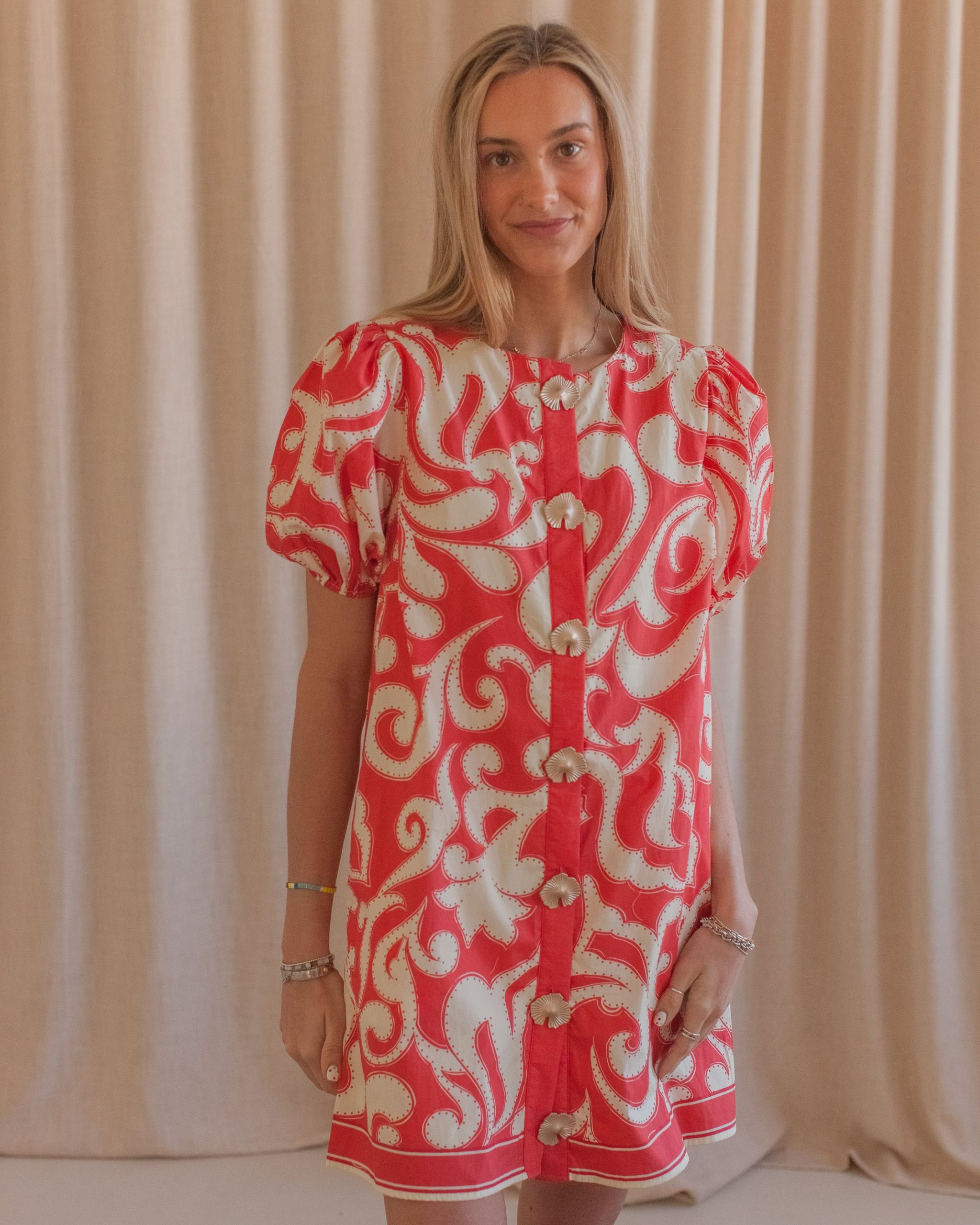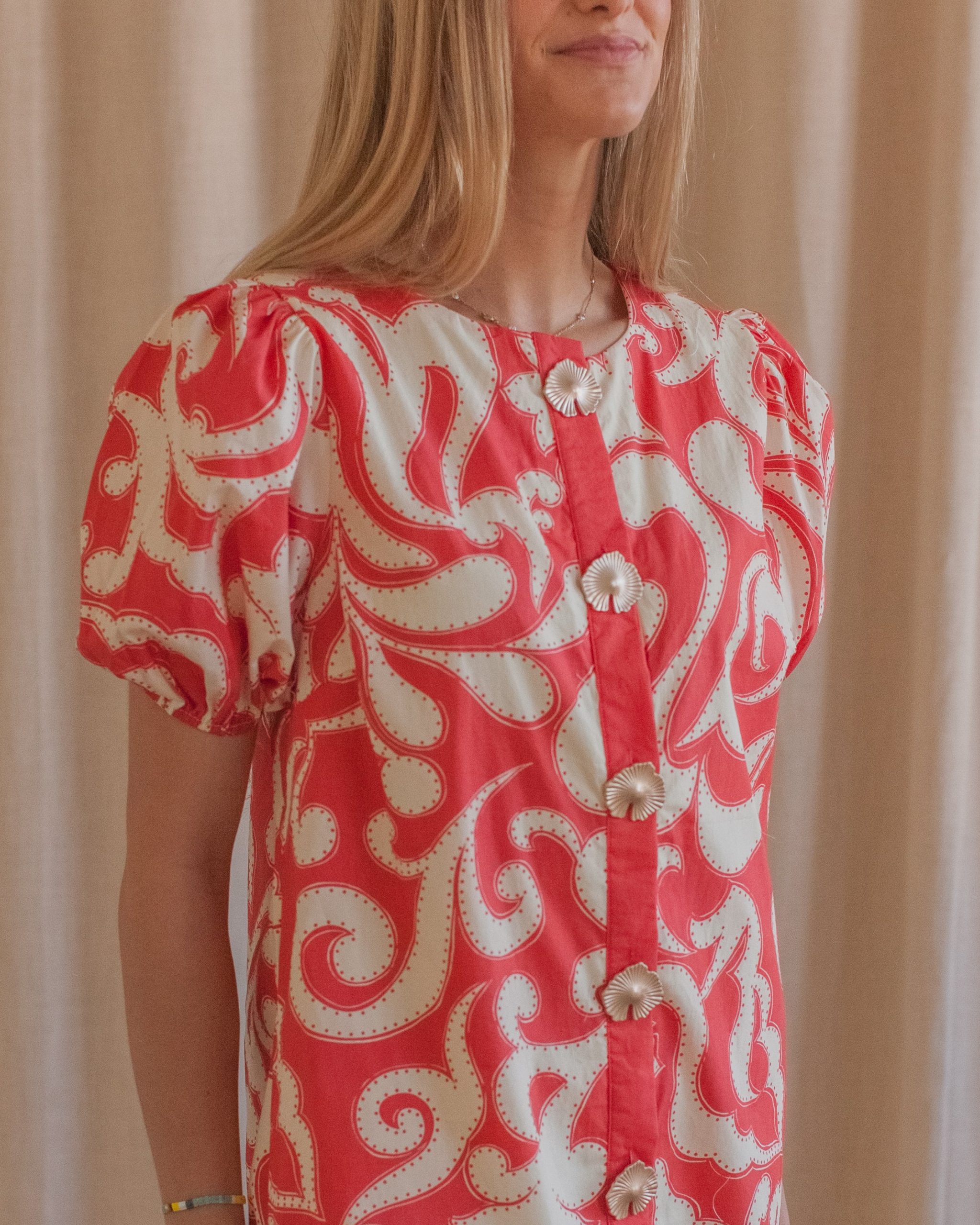 A colorblock printed mini shift dress with short puff sleeves and gold statement button details on the front.
