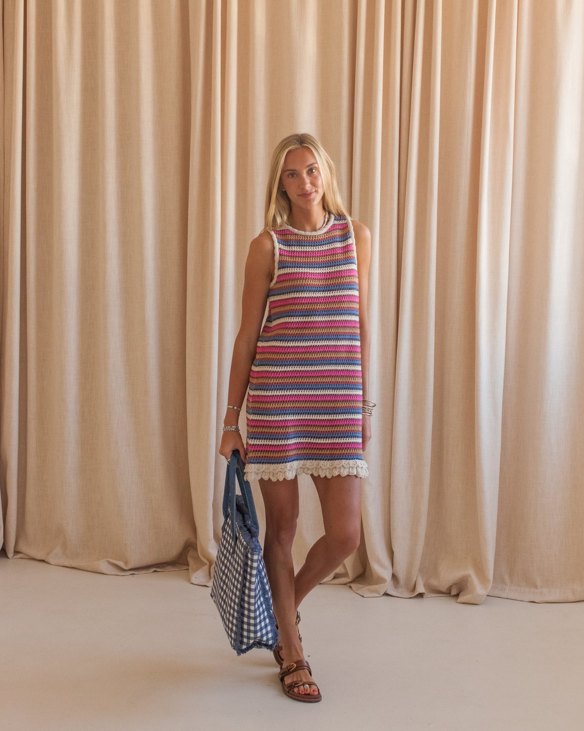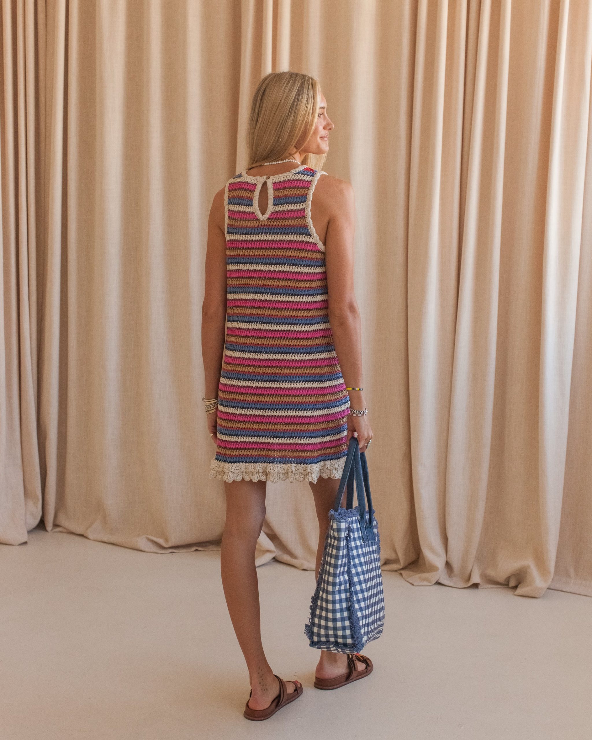 A vacation must have. this multicolor striped crocheted mini dress makes the perfect beach cover up or casual dinner outfit. Pair with sandals and a sunhat.