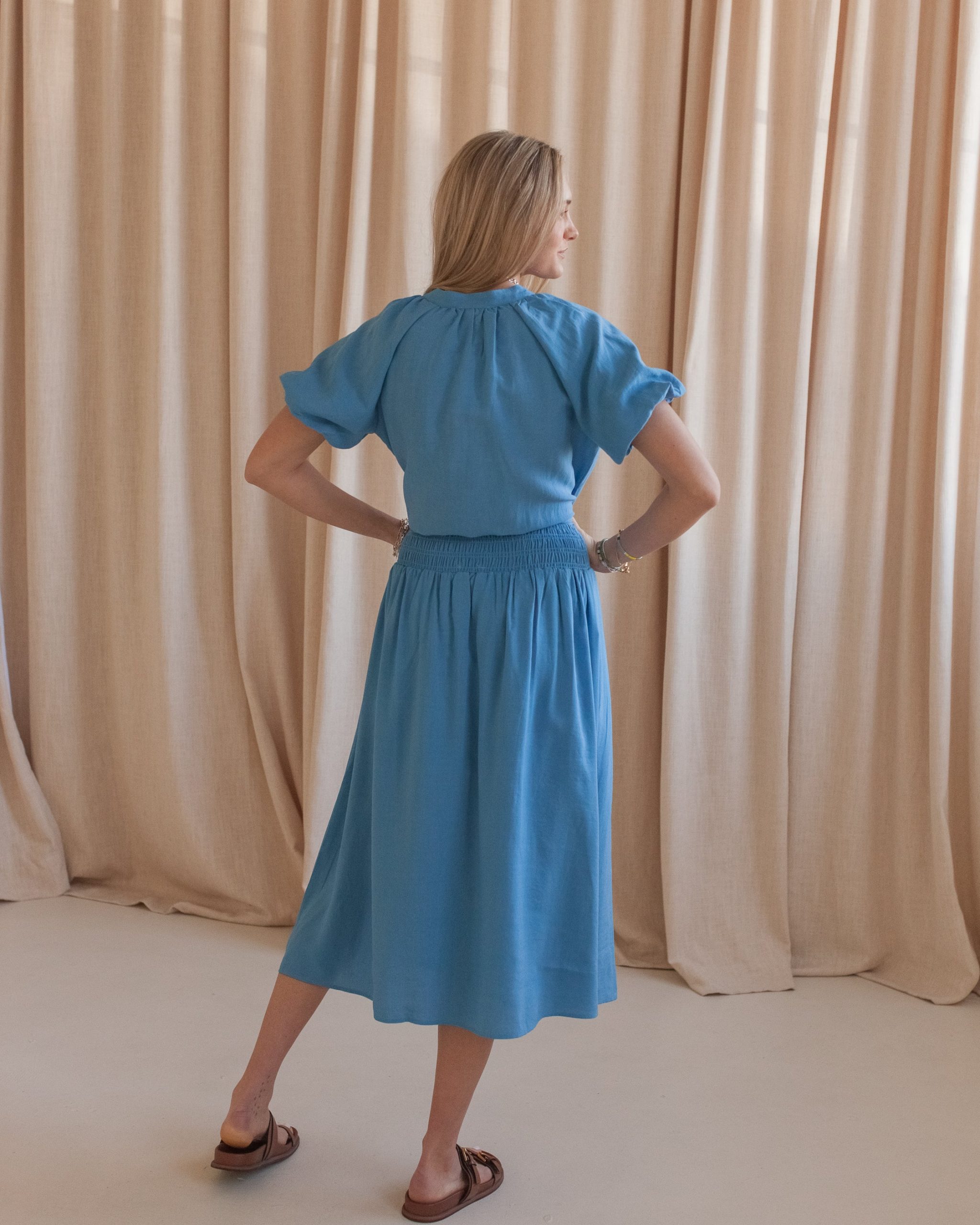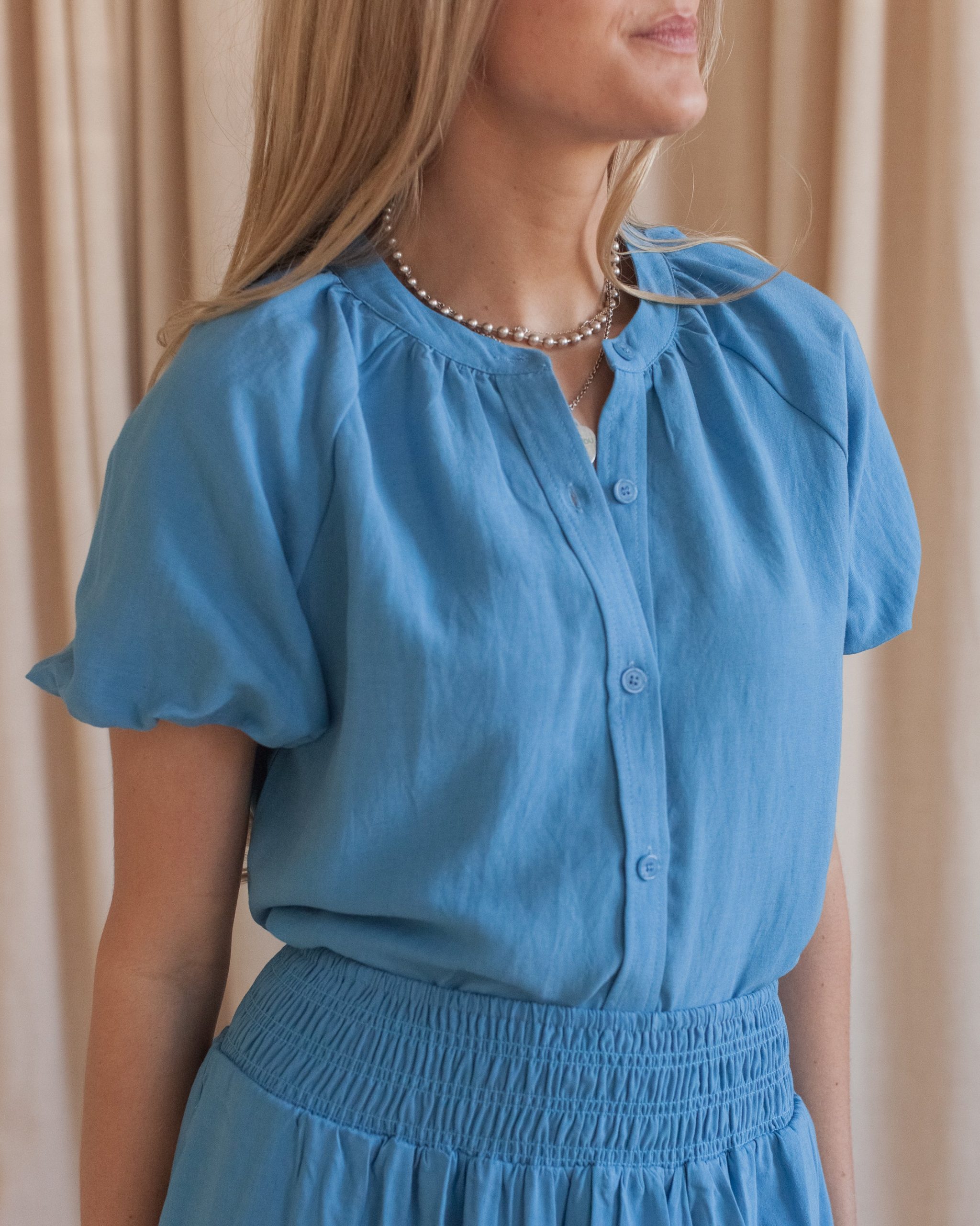 A two-piece set featuring a relaxed button-front blouse with soft puff sleeves and a matching skirt. Designed for easy. everyday wear. this effortless set can be worn together or mixed and matched with your favorite basics.