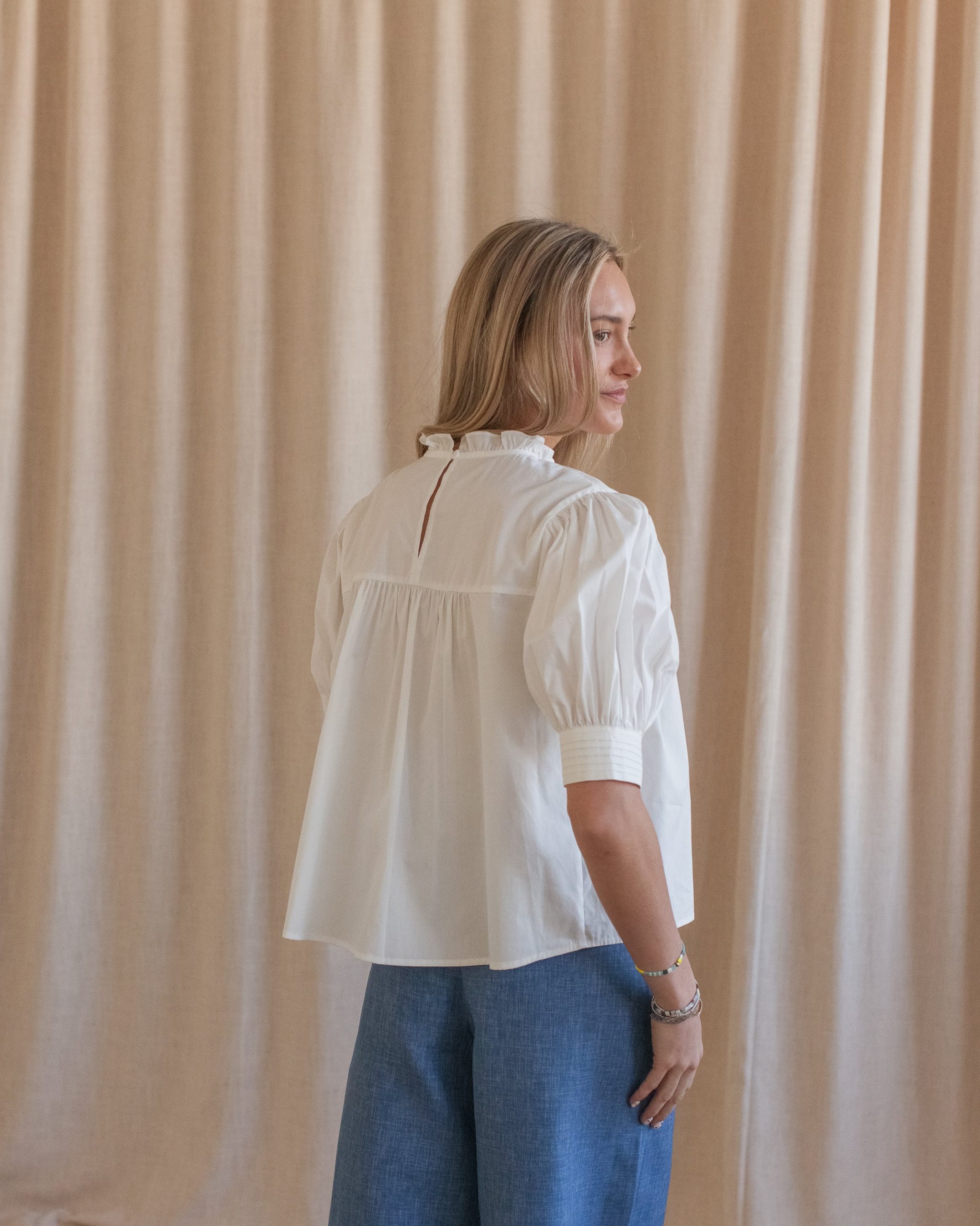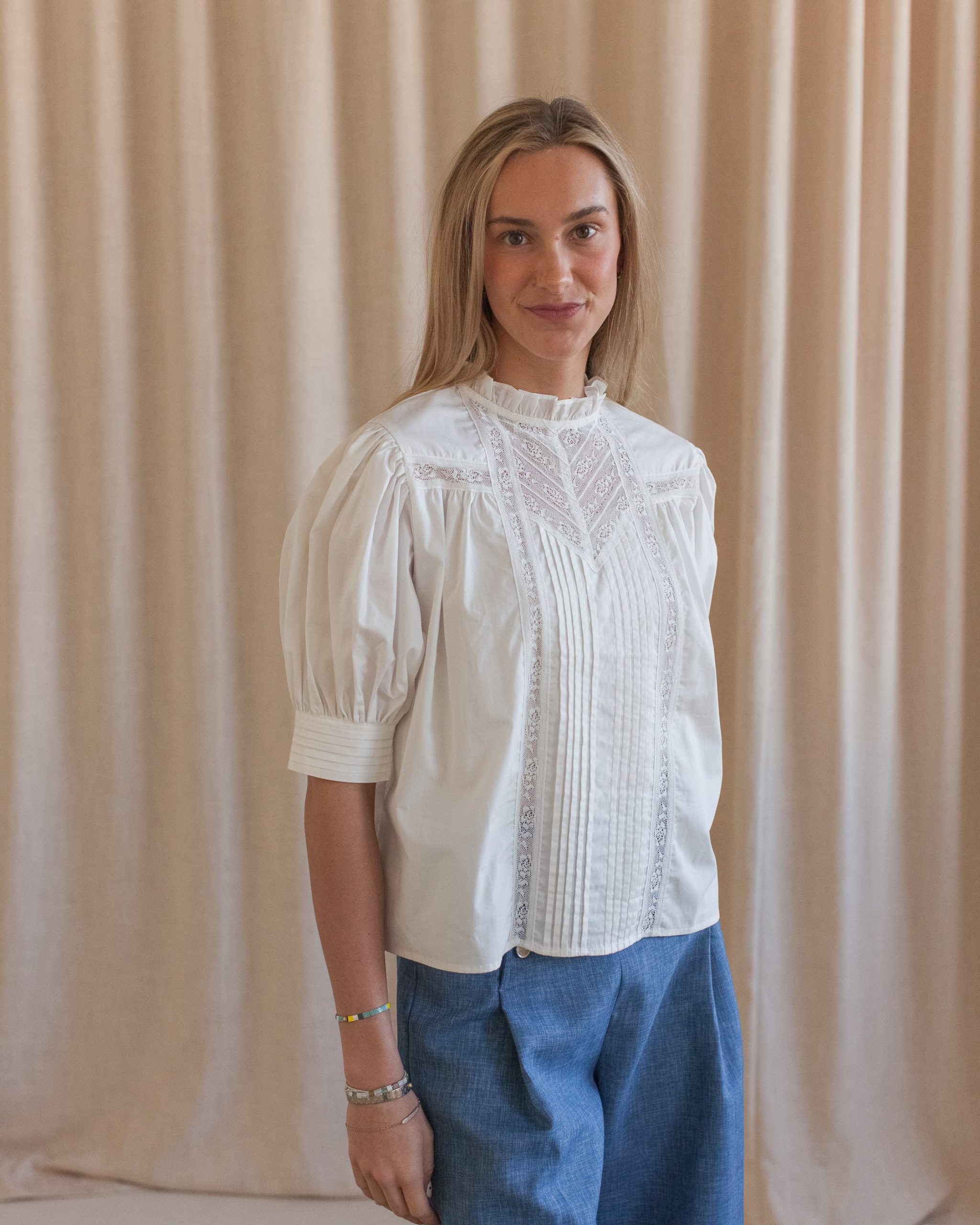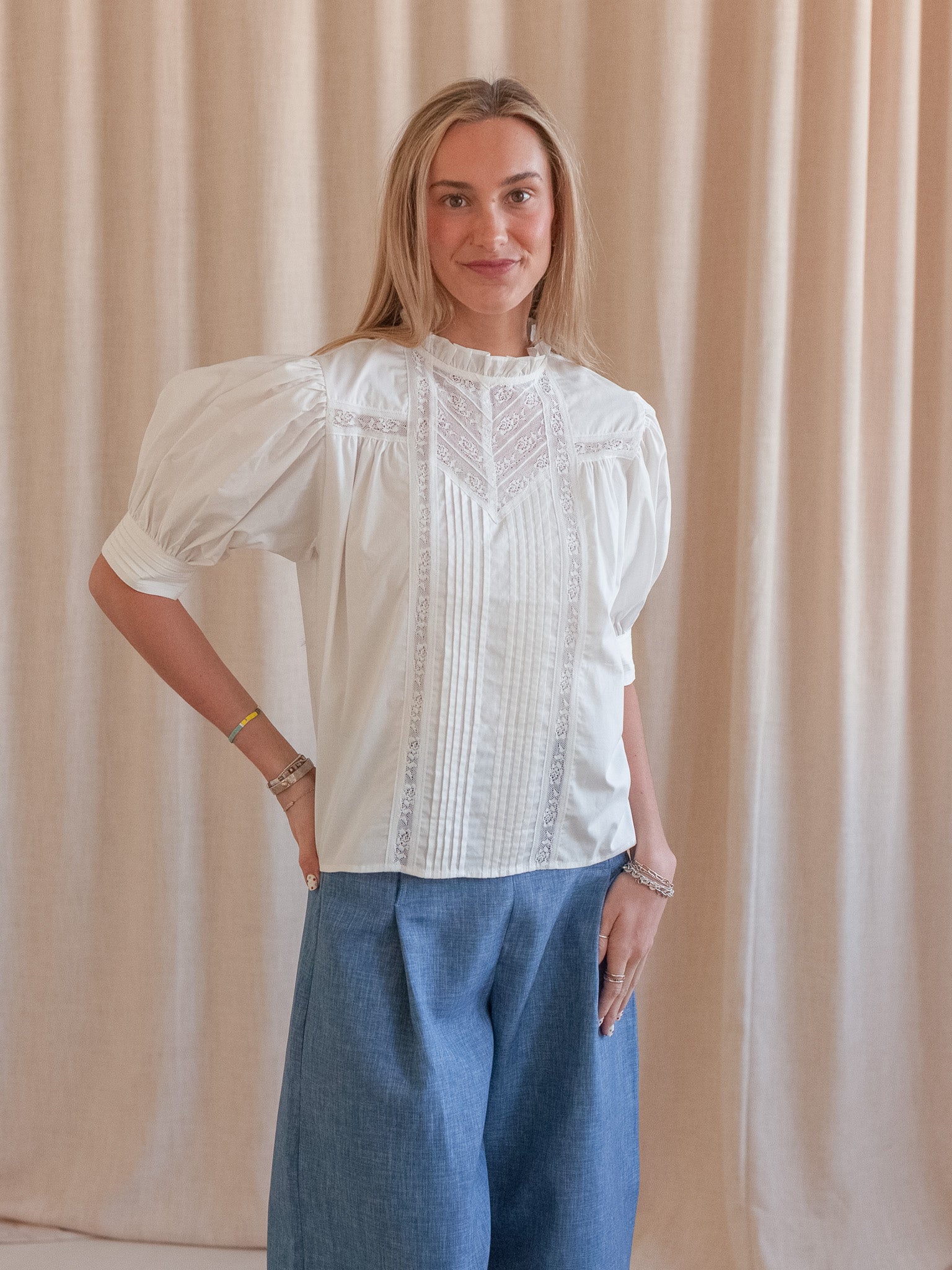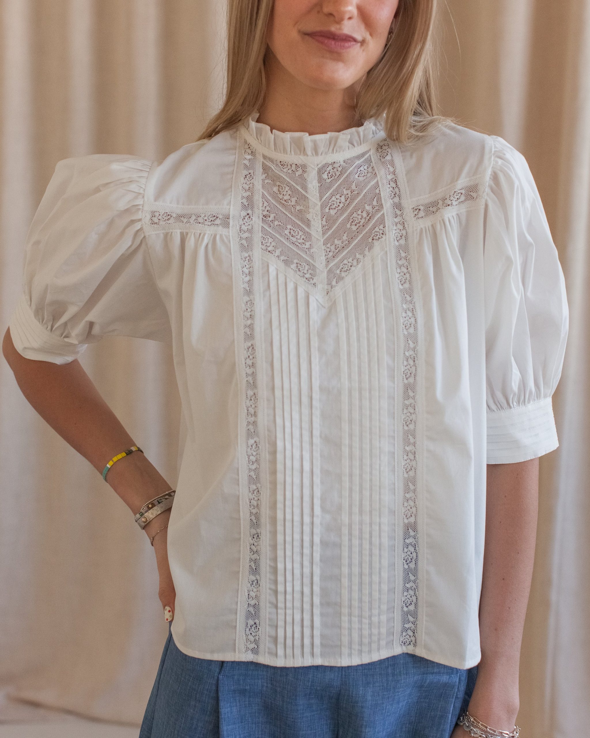 This feminine Edwardian-style blouse features short puff sleeves. front lace. micro pleating. and a subtle ruffled collar. Pair with denim or a skirt.