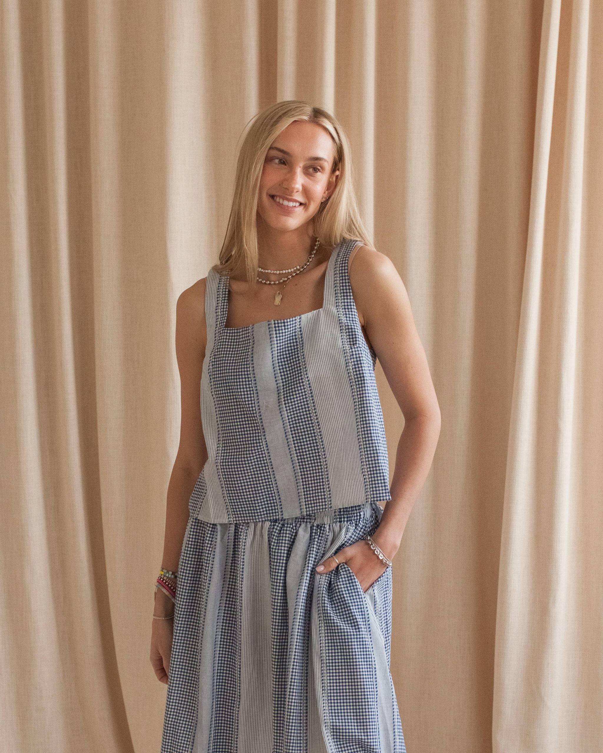 A 100% cotton two piece set featuring a sleeveless top with adjustable back ties and matching skirt with an elastic waistband for easy comfort. Perfect worn together or styled separately.
