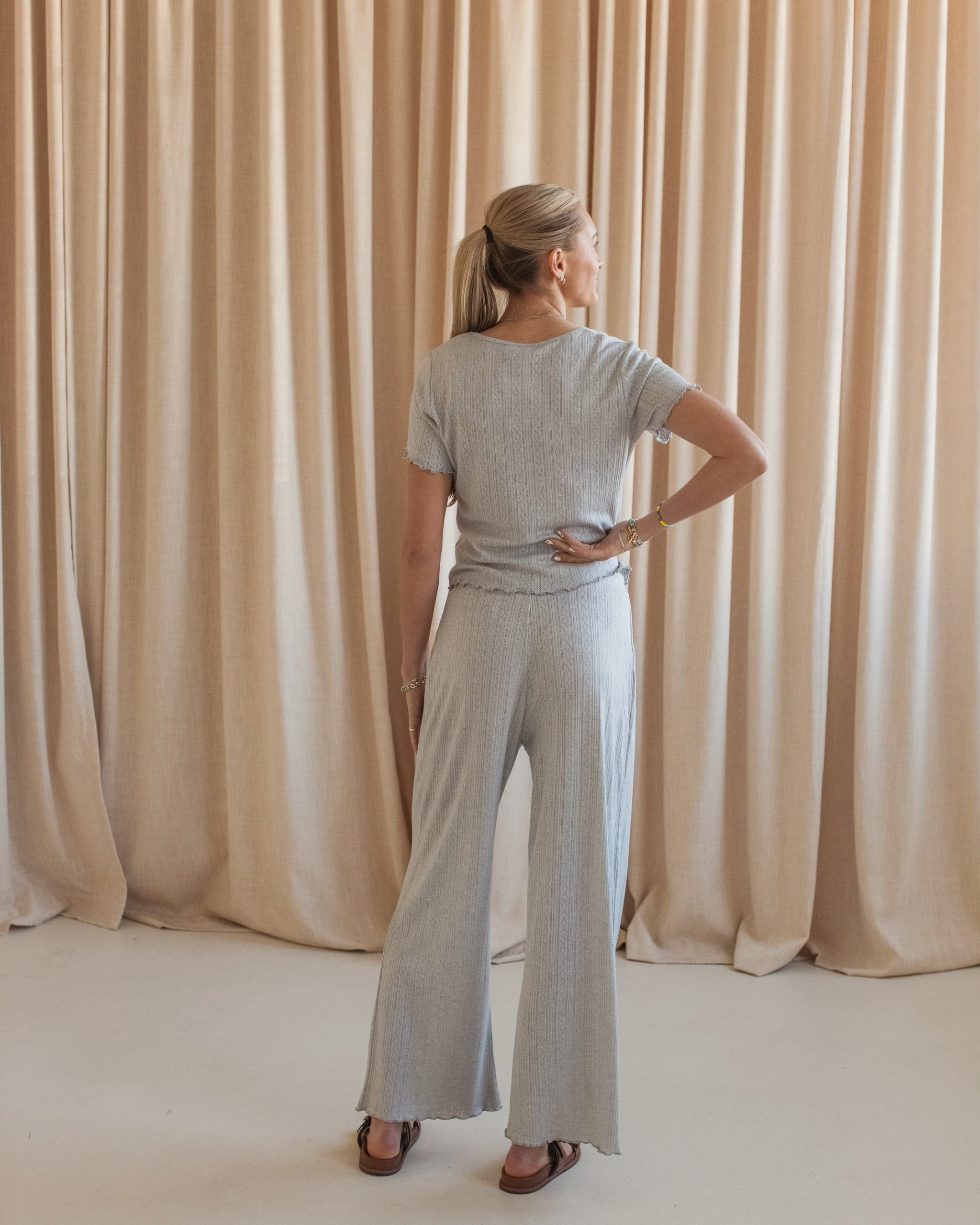 100% cotton. lightweight drawstring pants designed for everyday comfort. Featuring an adjustable waist. relaxed fit. and a ruffled hem for a subtle feminine touch. Pair with the Grey Pointelle Tee for a complete set.