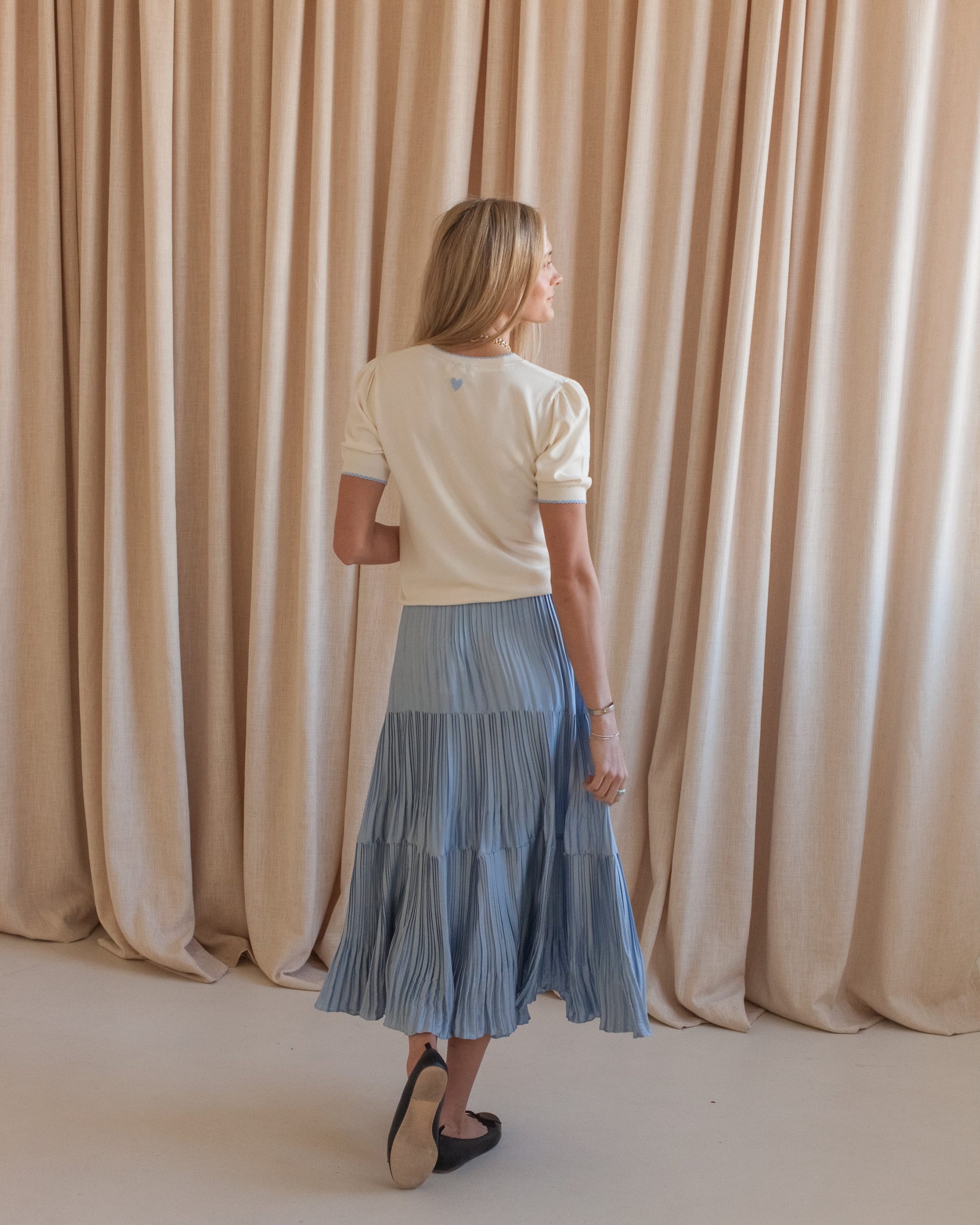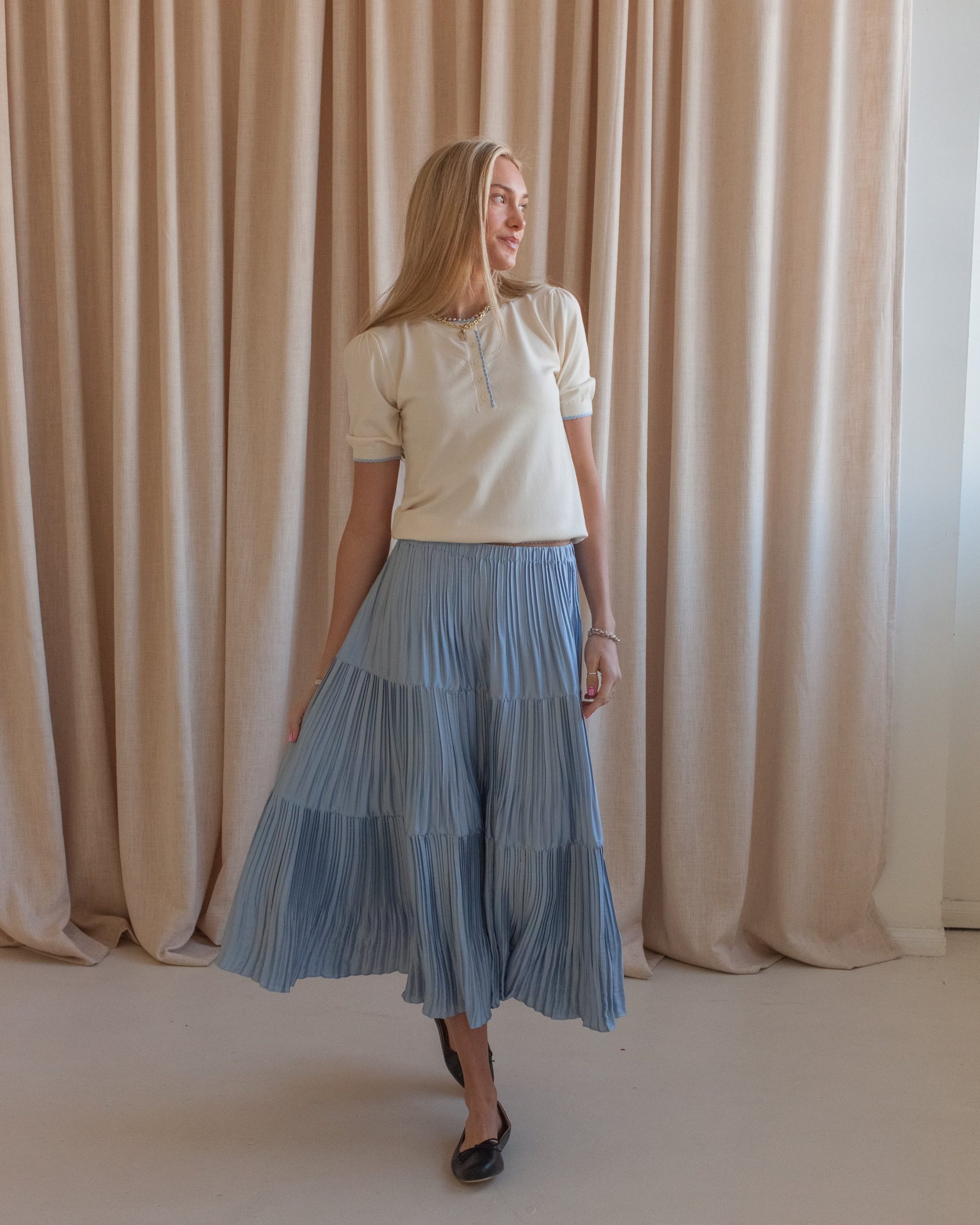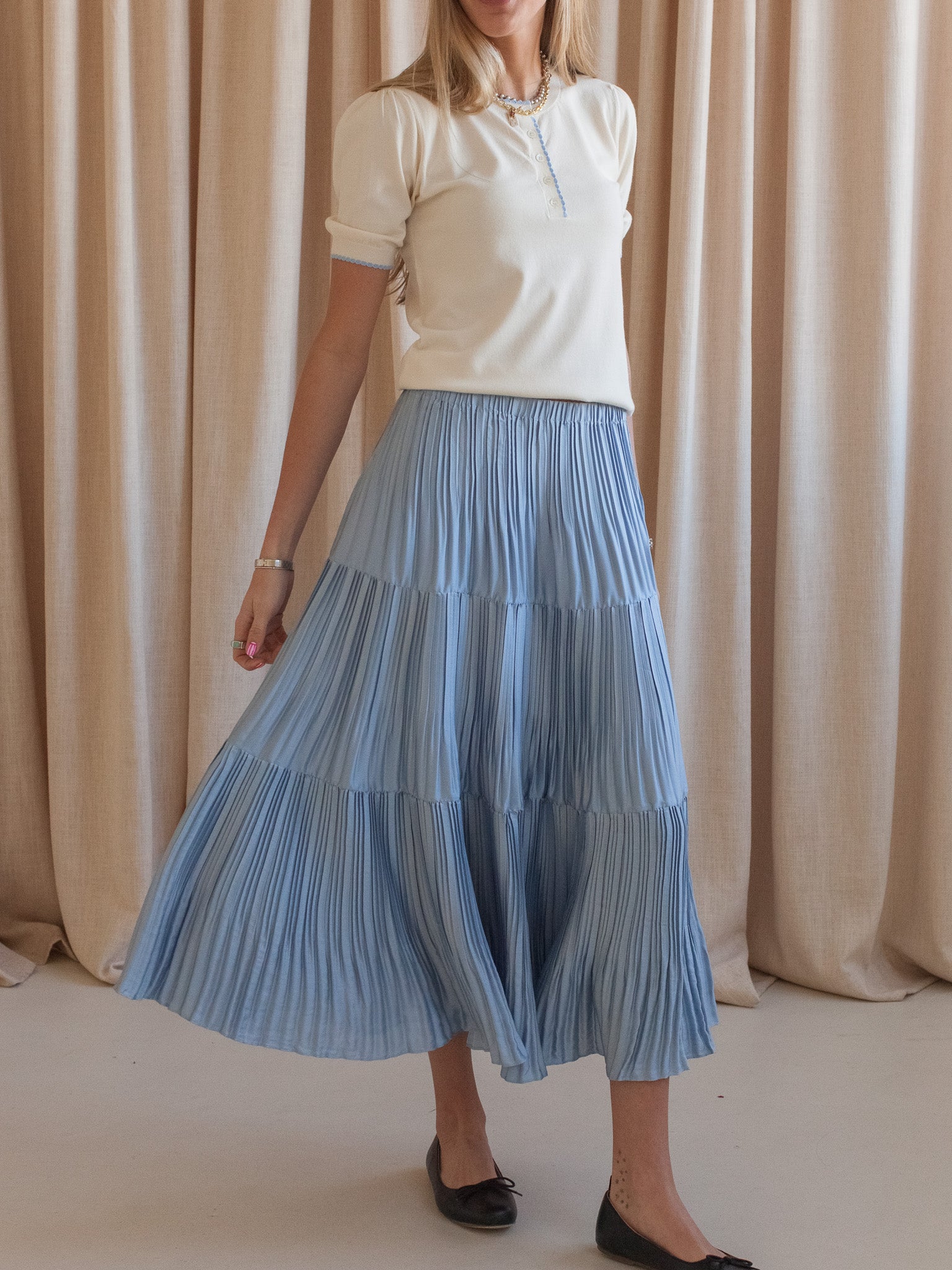 This flowy tiered midi skirt features knife pleats and an elastic waistband. Pair with a white blouse and sandals for spring.