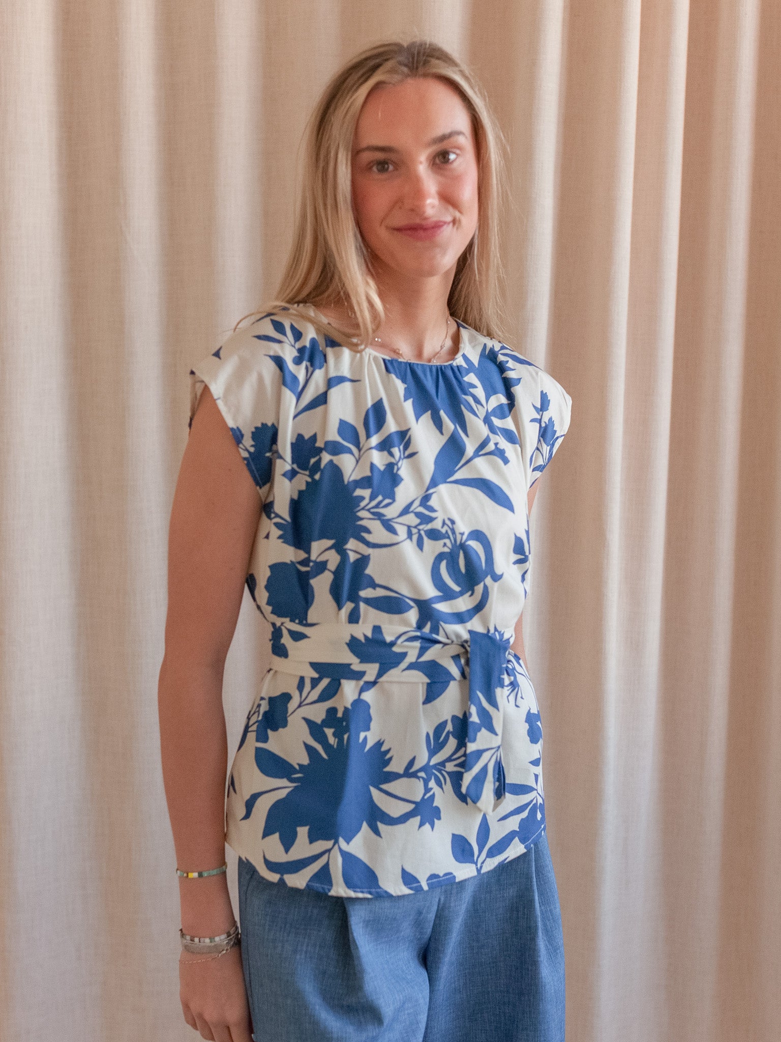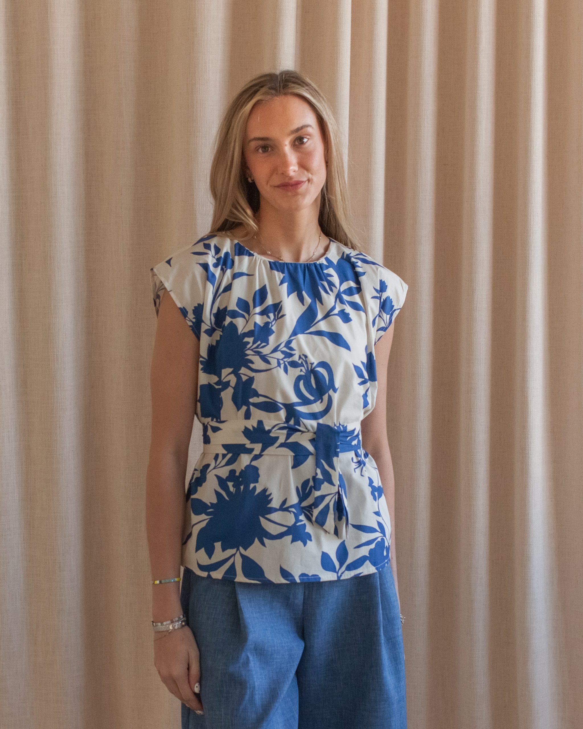 This printed blouse features cap sleeves. a longer silhouette. and a tie at the waist. Pair with denim or white pants for spring and summer.