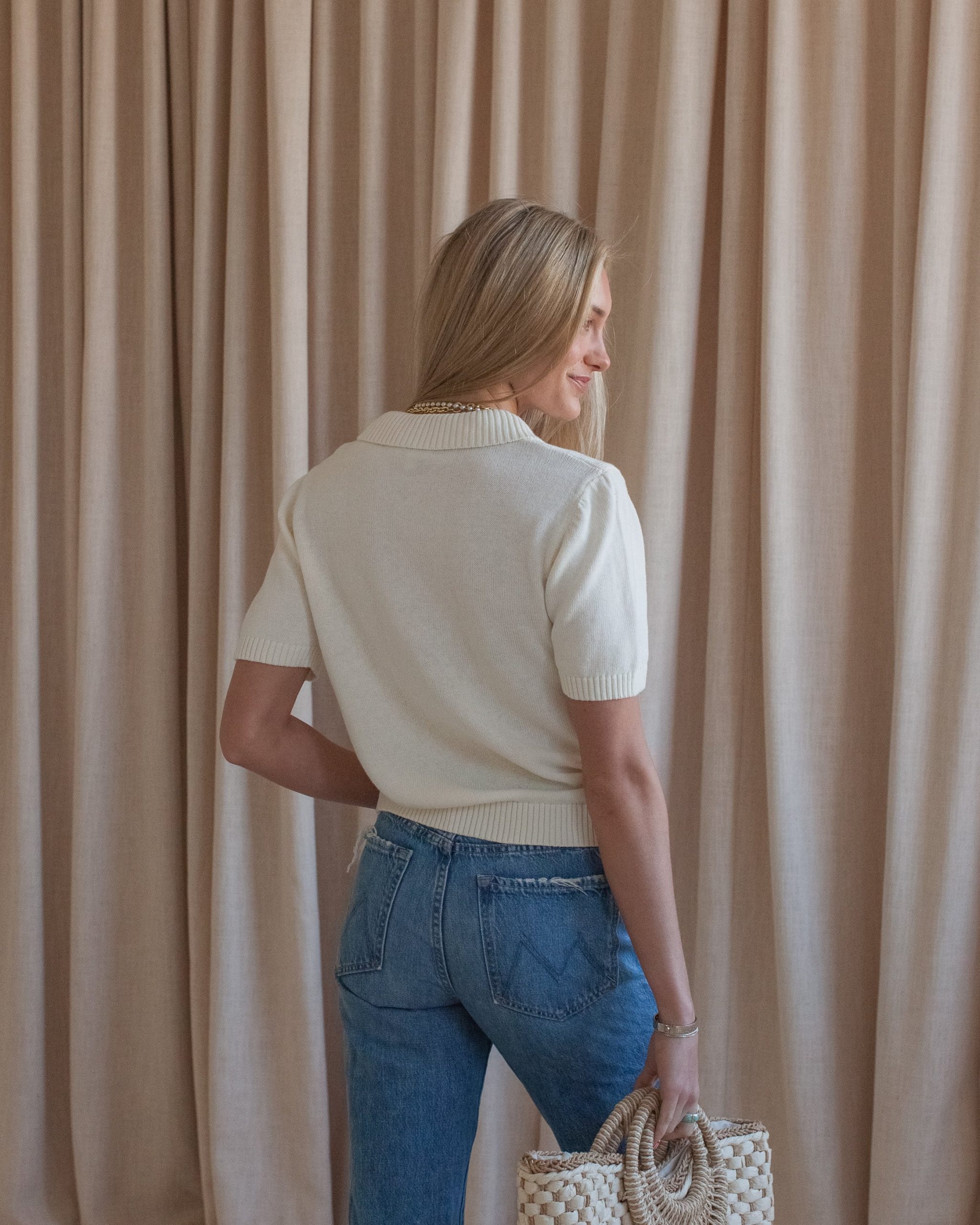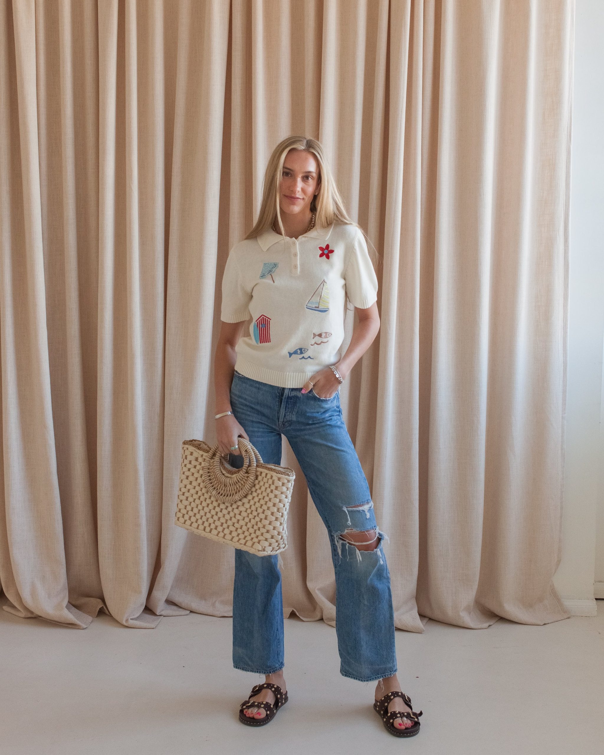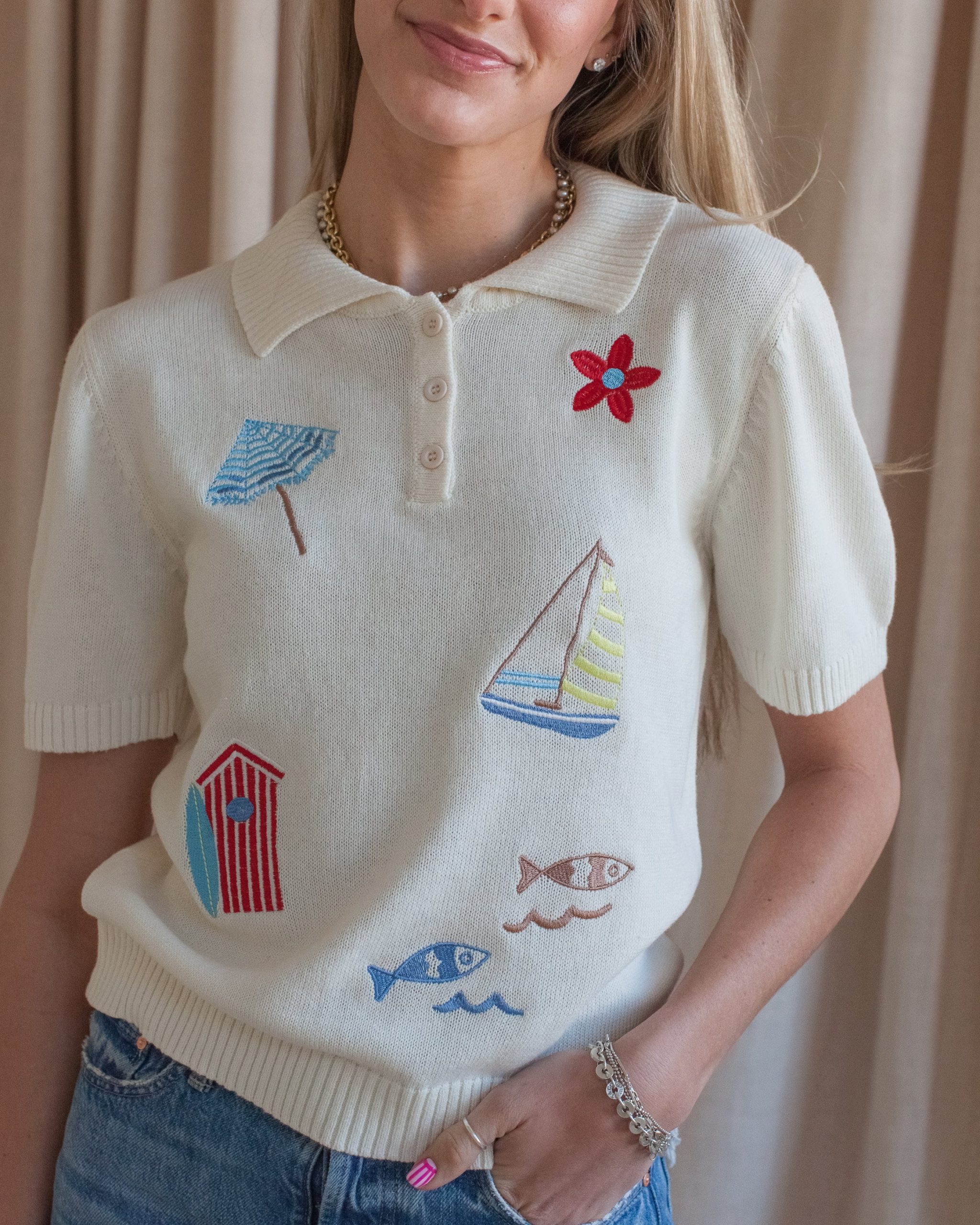 This knit cotton short sleeve top features beach themed embroidery and front buttons at the collar. Pair with jeans or shorts and sandals.