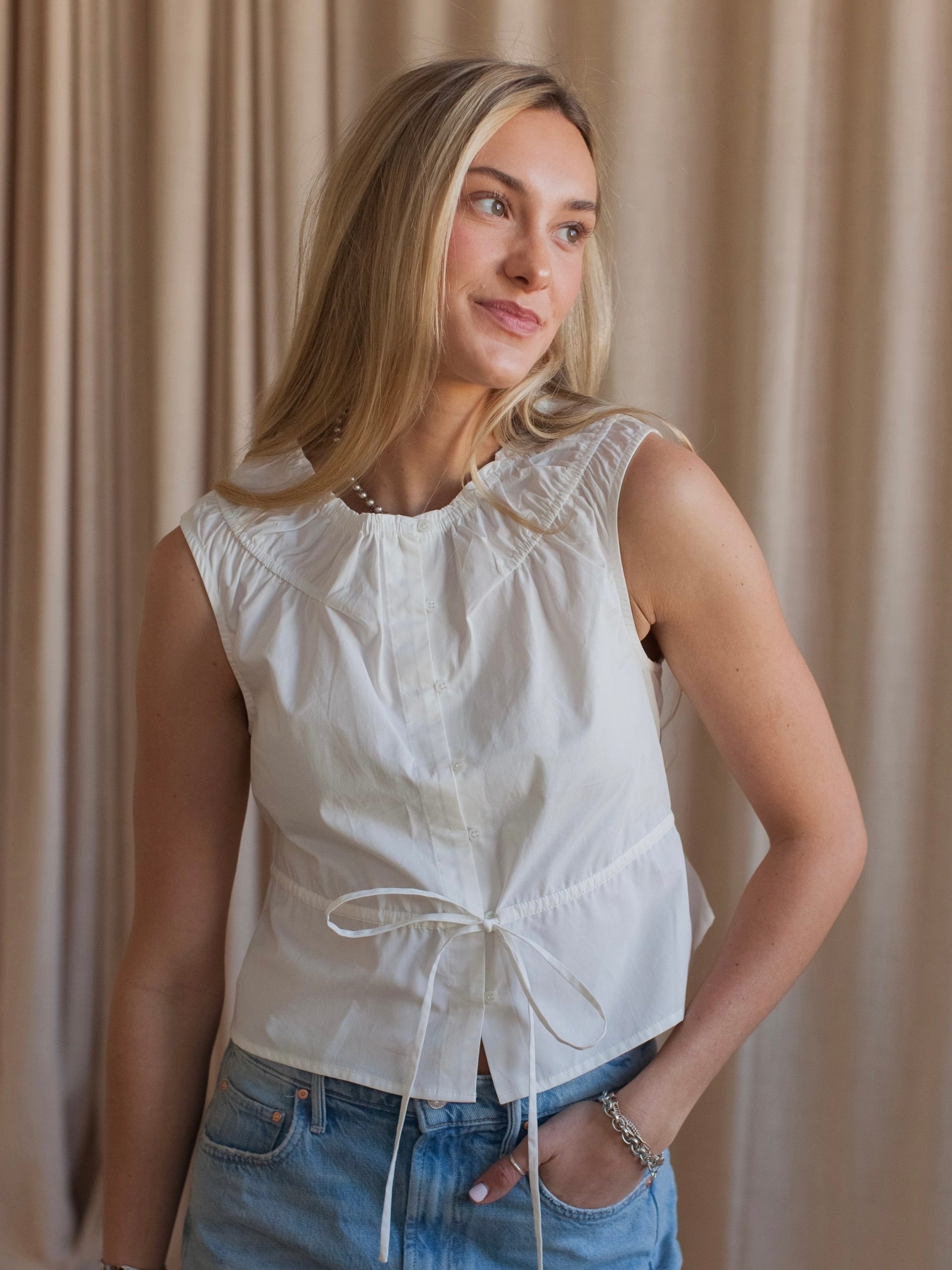 This sleeveless cotton blouse features a button front. shirred detailing at neck. and tie at the waistline. Pair with dark denim and red flats.