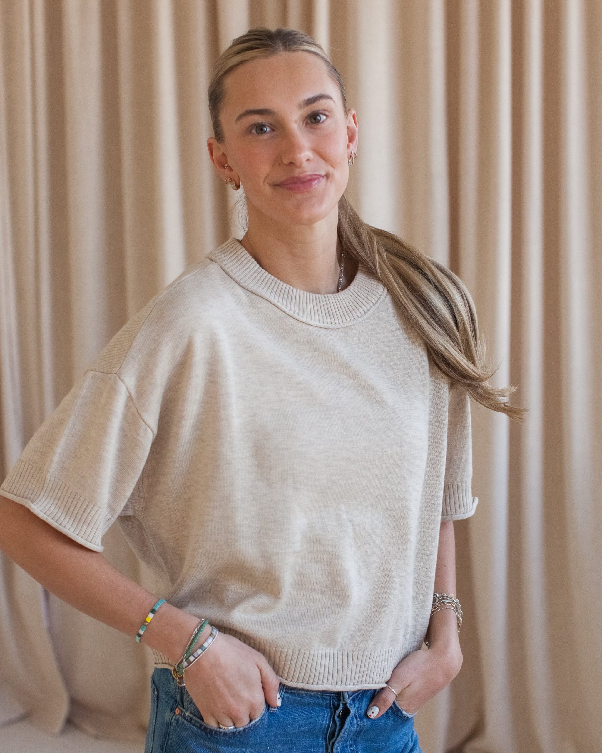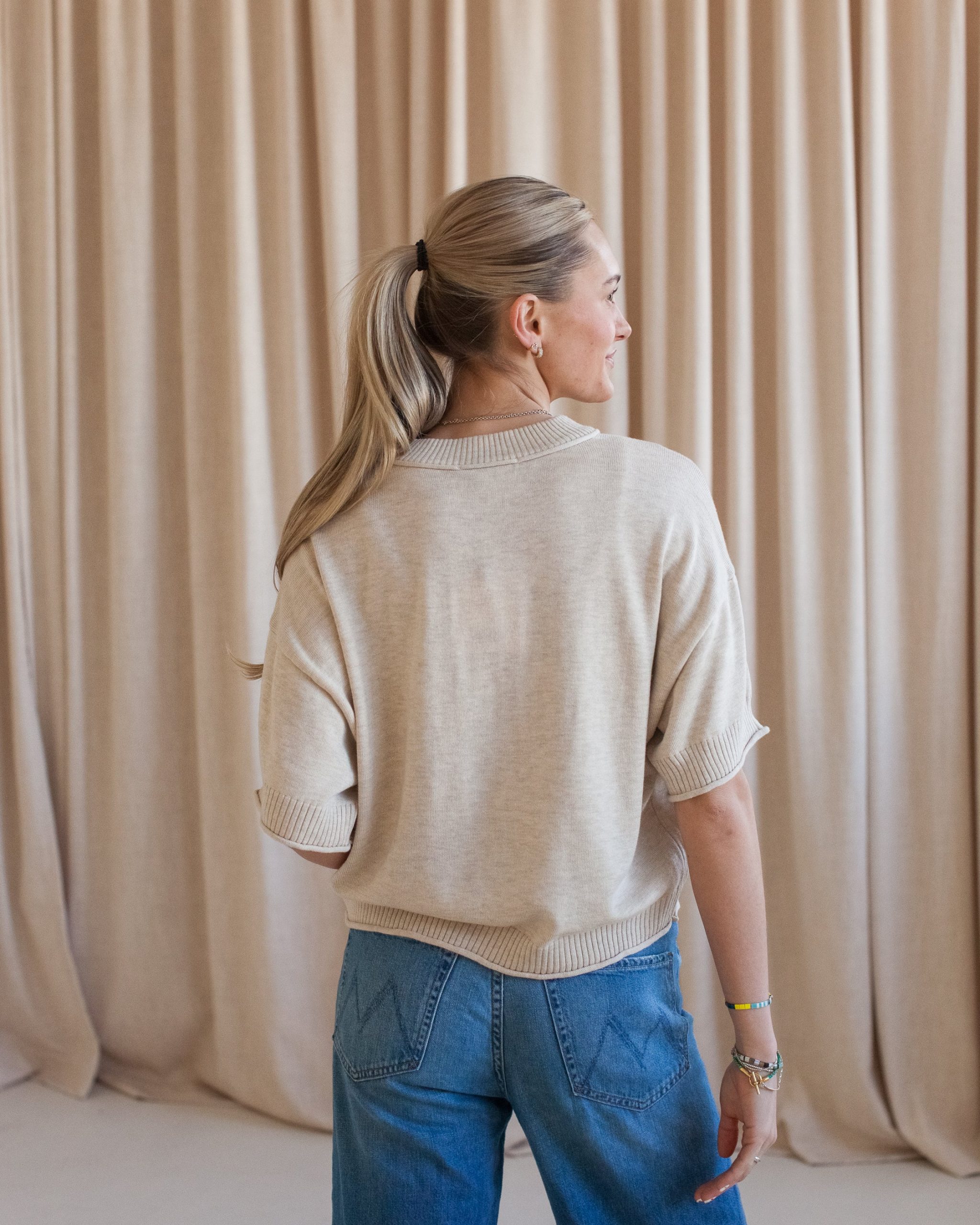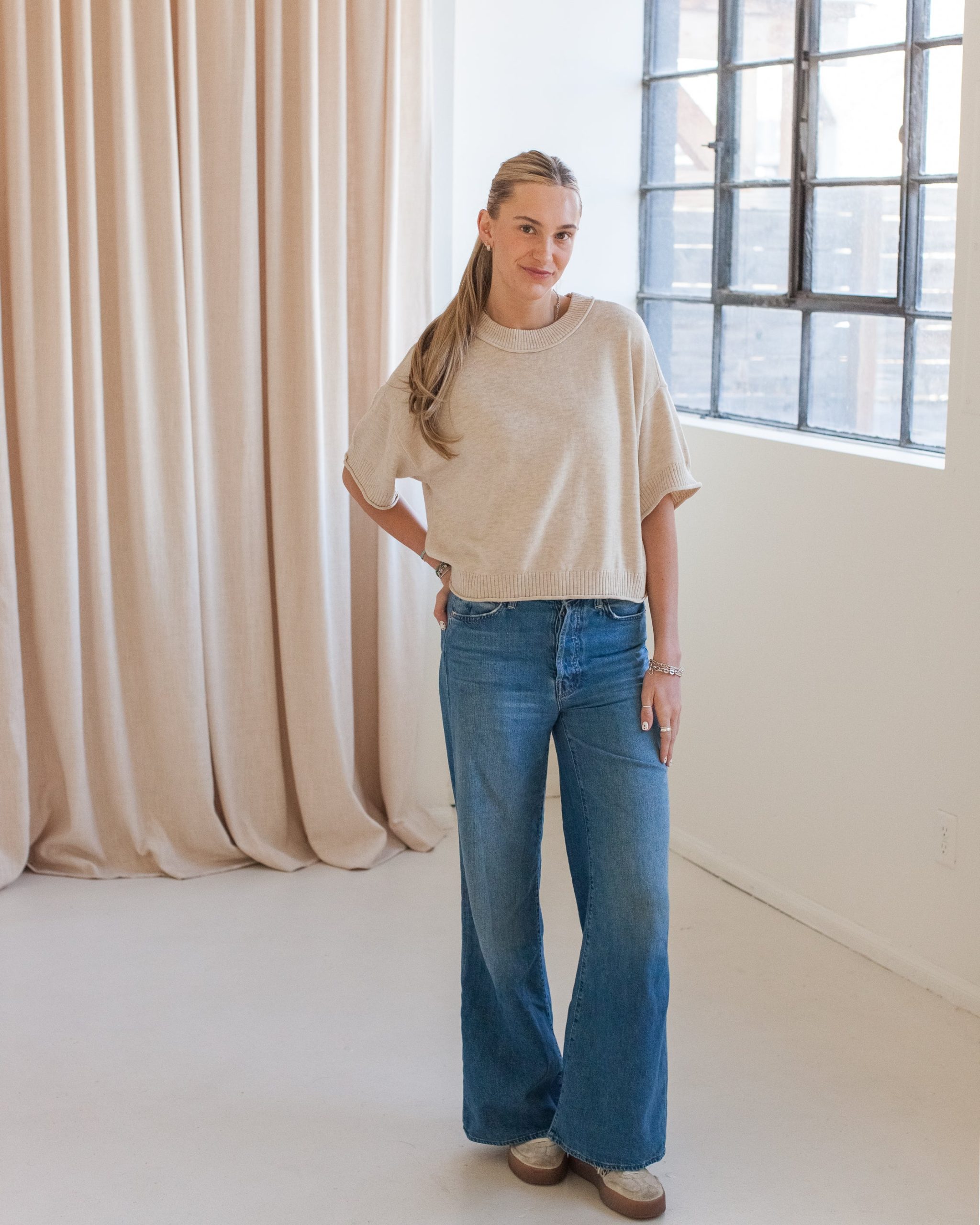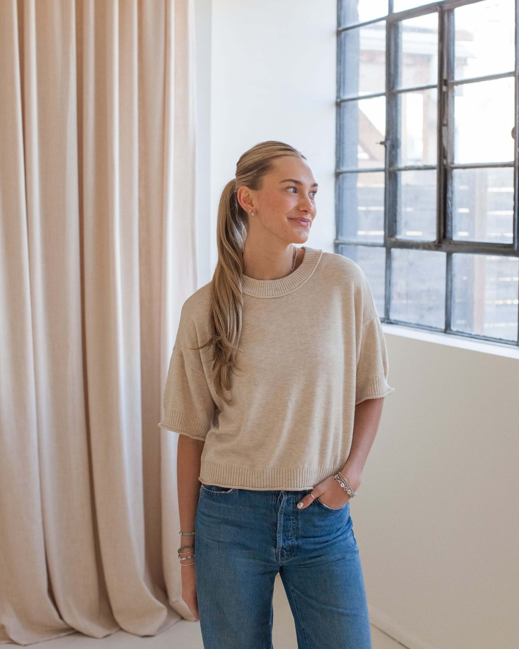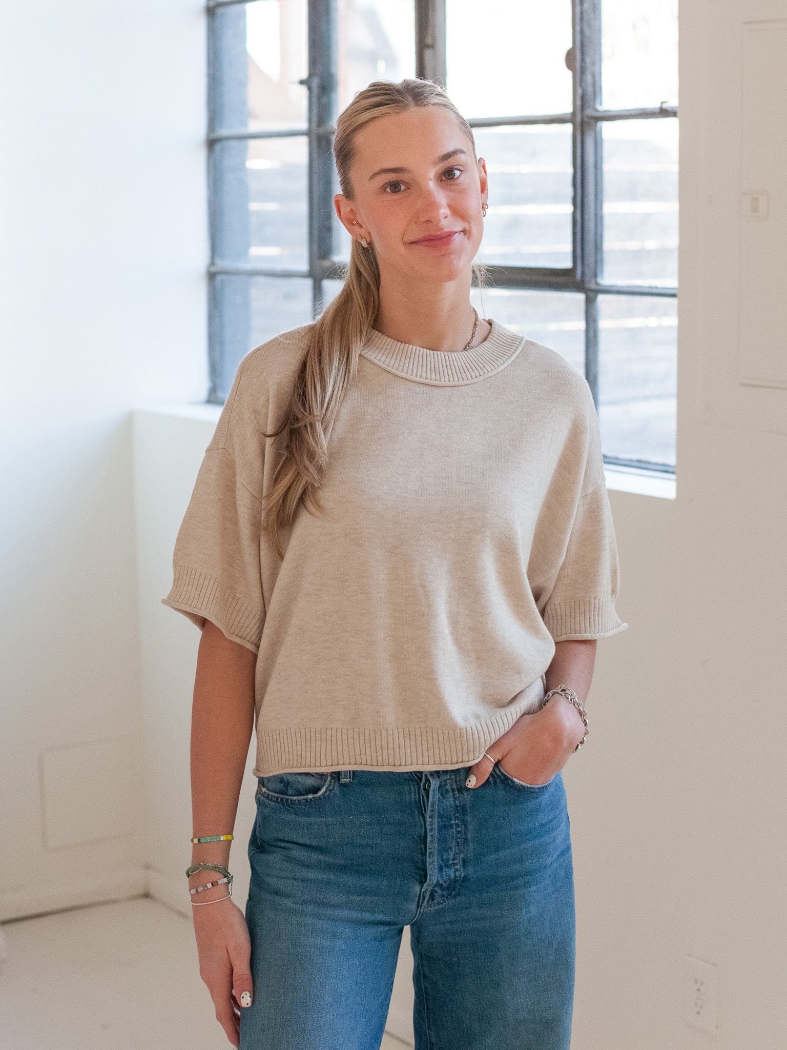 A boxy short sleeve knit sweater top with contrasting ribbed collar. cuffs. and hem. Wear on its own in place of a tee shirt or layer under your favorite jackets with jeans.