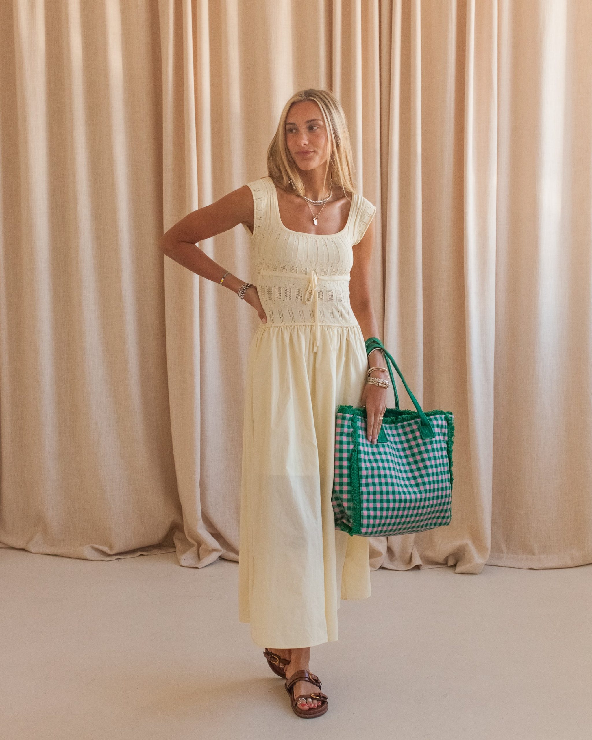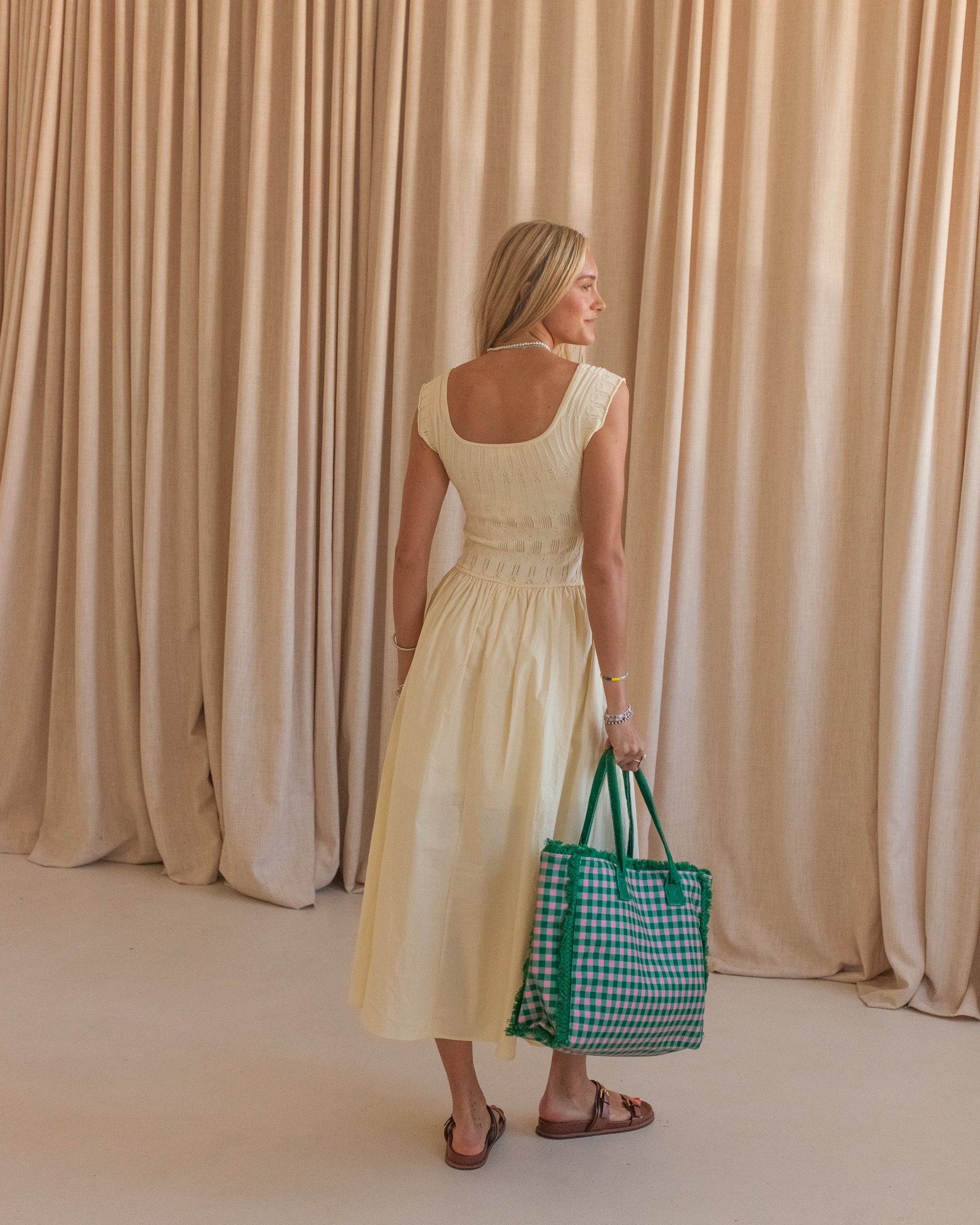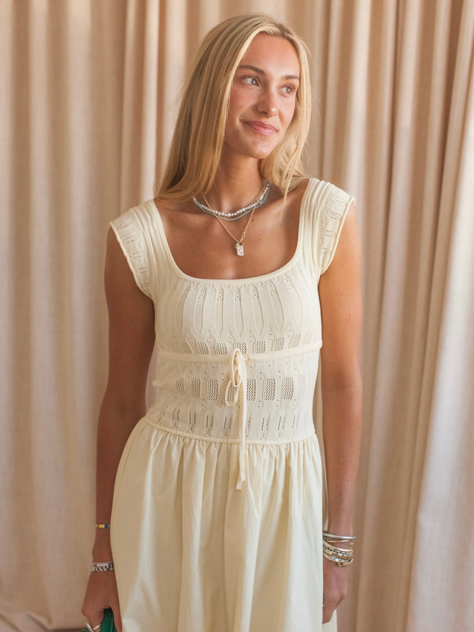A spring dream. this butter yellow midi dress features a delicate knit bodice with drawstring waist and a full poplin skirt. Pair with a sunhat and sandals on a sunny day.