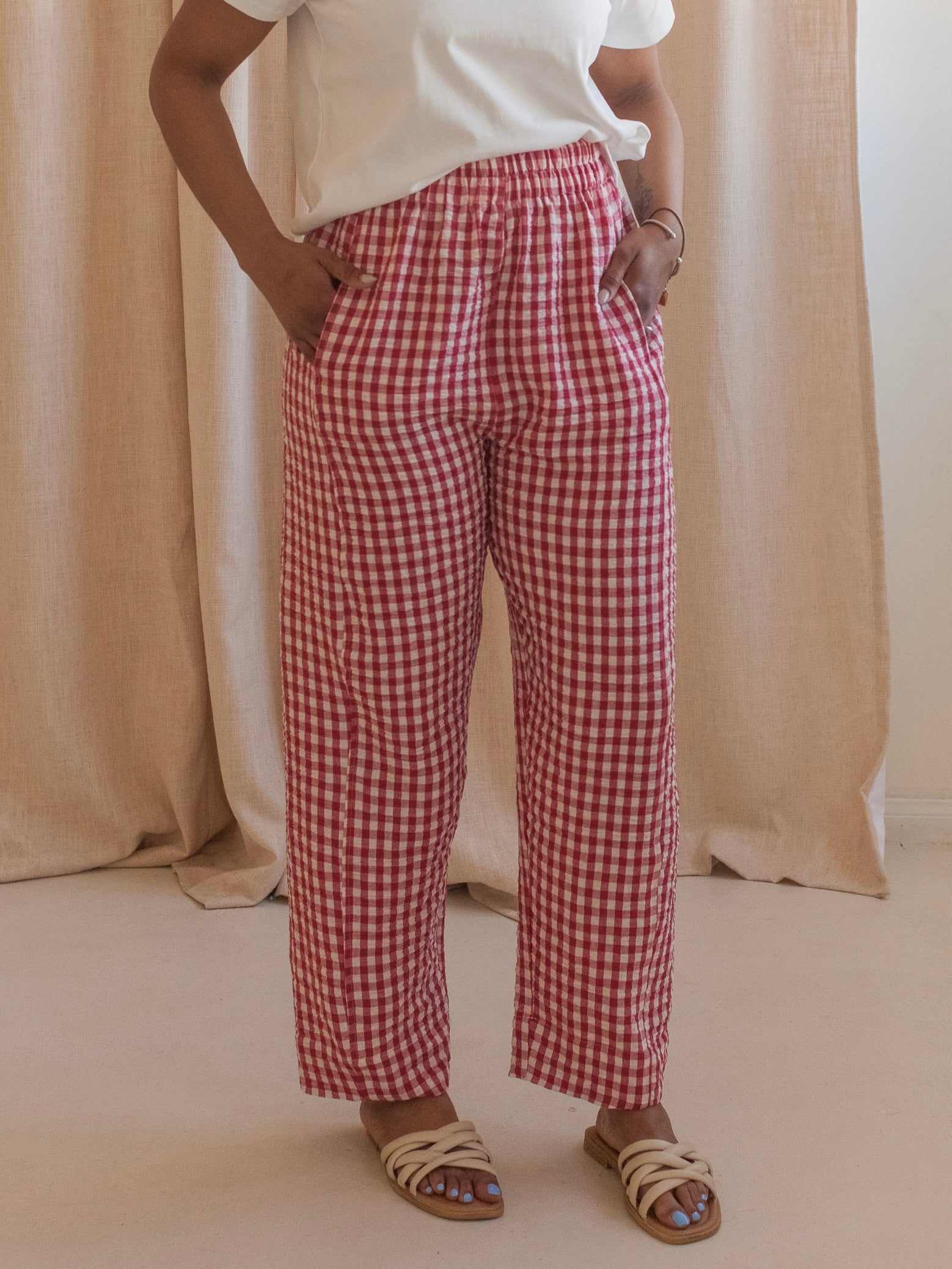 These lightweight cotton pull on pants feature a gingham pattern. elastic waistband for comfort. slightly tapered leg. and pockets. Pair with a white tee and sandals for an easy spring look.