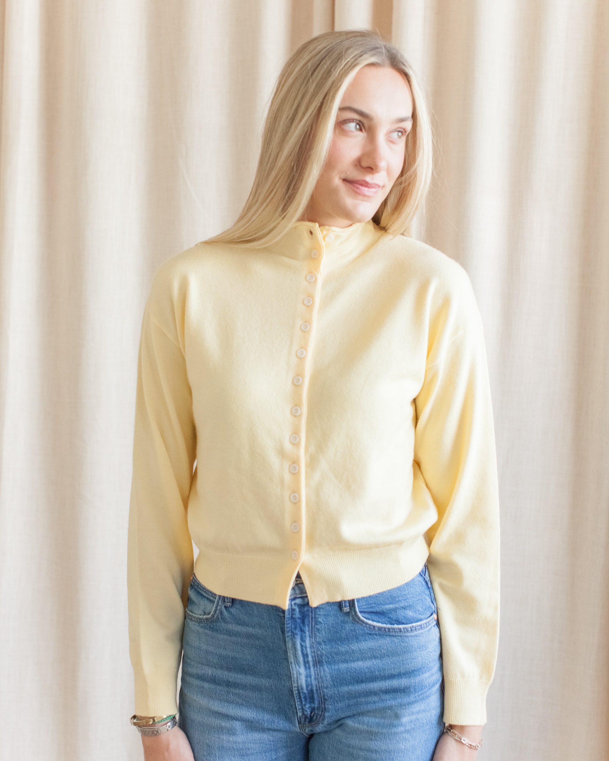 Elevate your fall wardrobe with this knit cardigan featuring a refined high neckline and a full front button closure. Crafted from a cozy. lightweight fabric. it offers a relaxed fit and ribbed hem for a timeless look. Perfect for layering or wearing on its own.