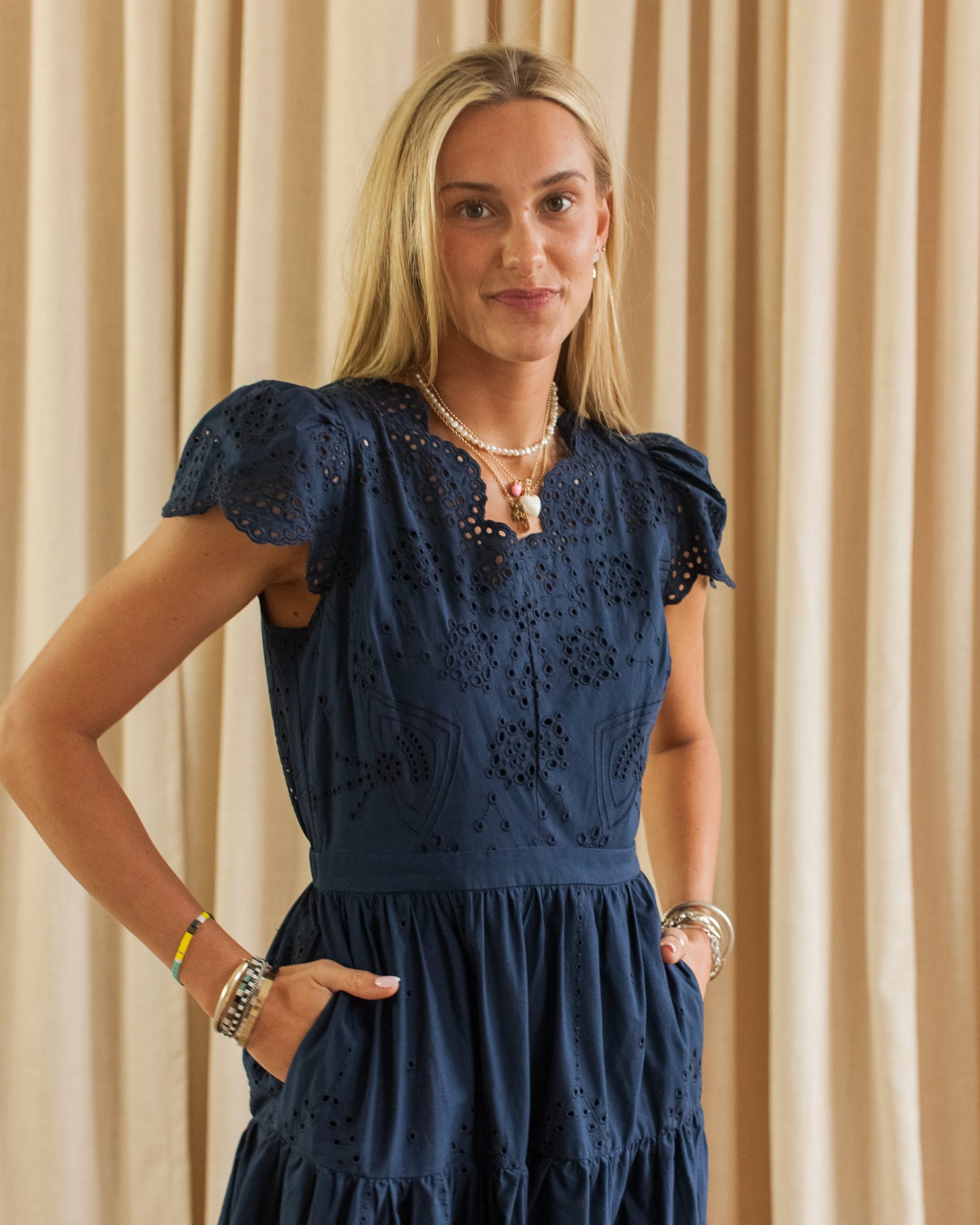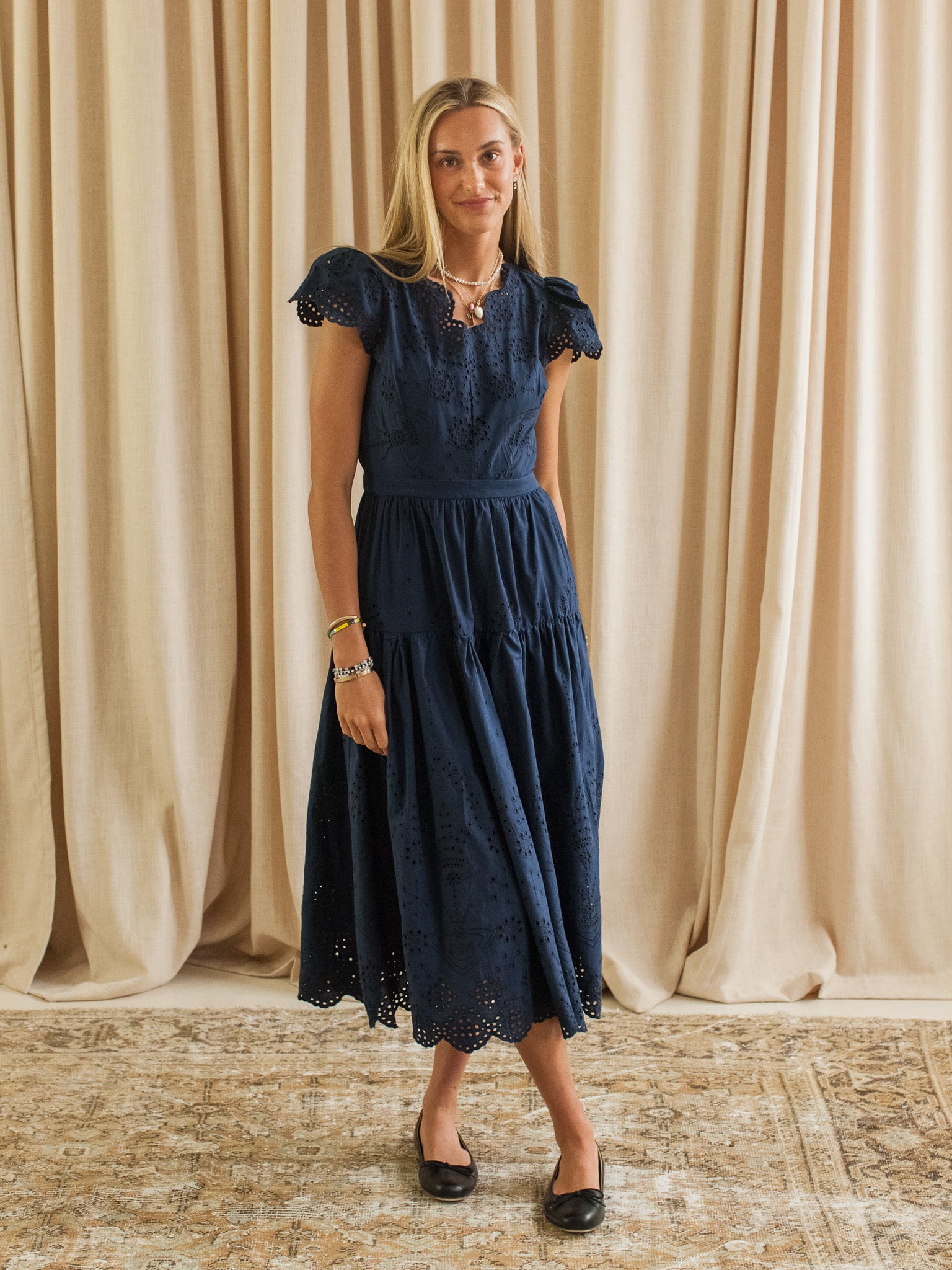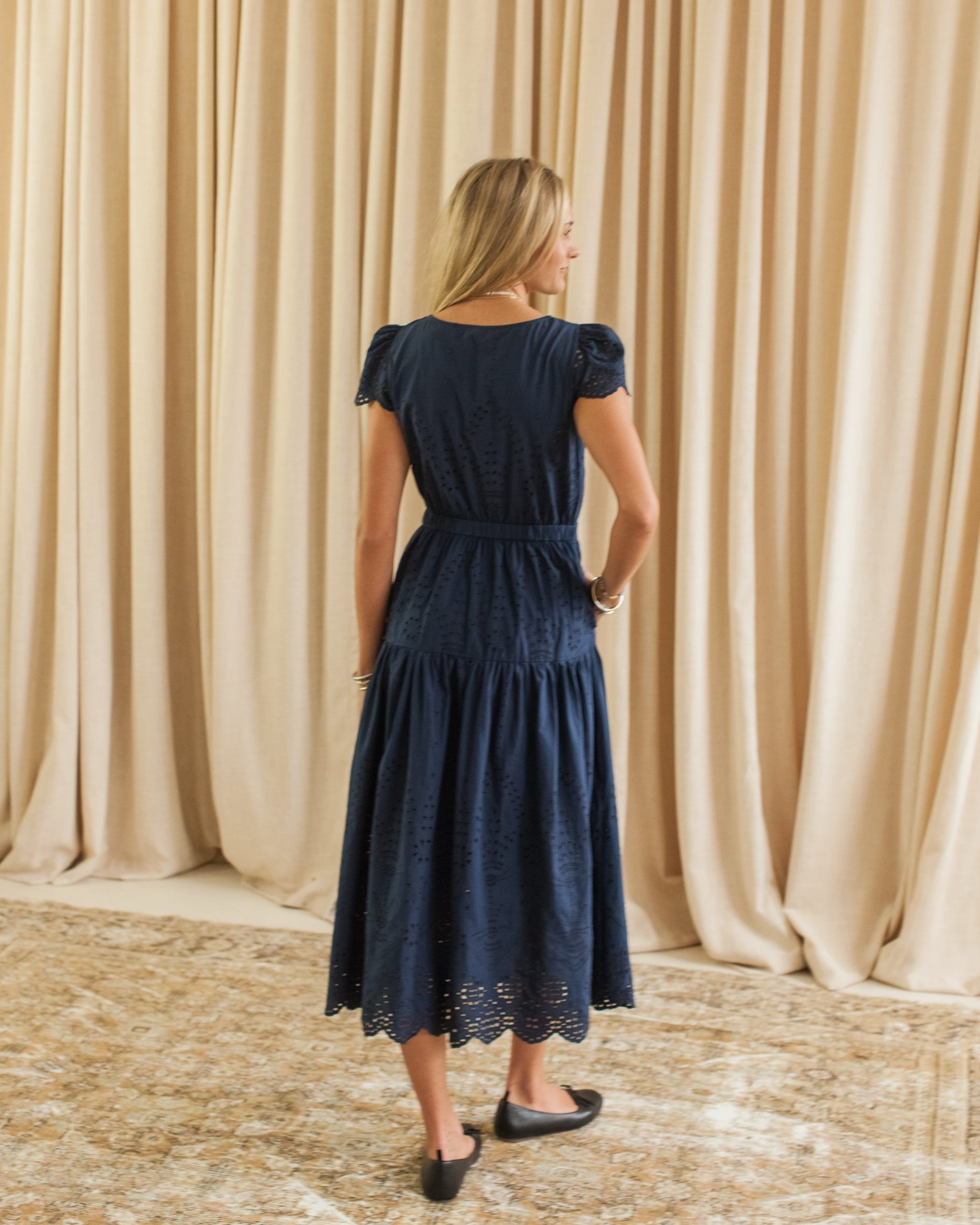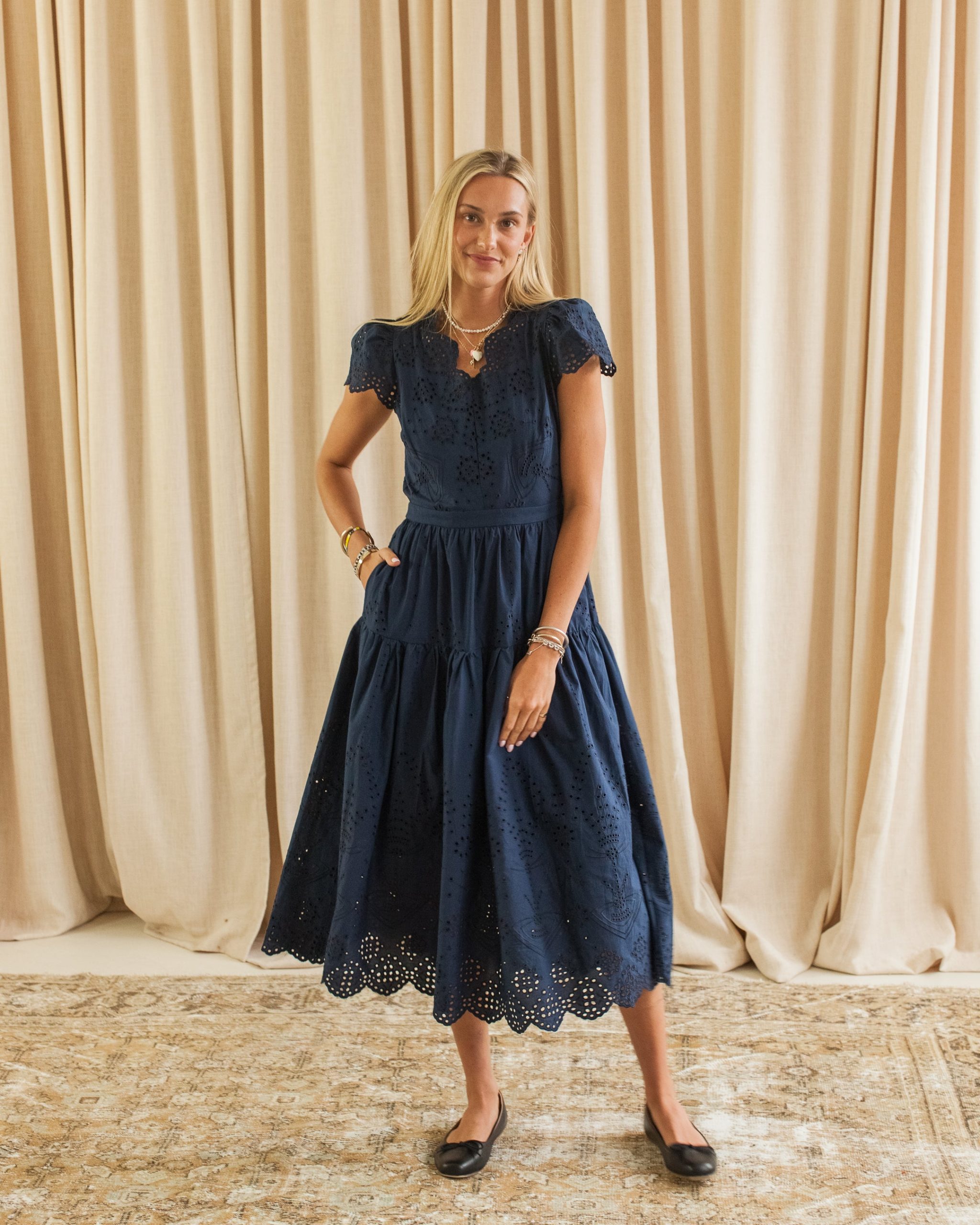 A 100% cotton midi dress featuring a scalloped neckline. cap sleeves. an elastic waistband for added comfort. and is complete with two side pockets. Perfect for warmer days ahead.