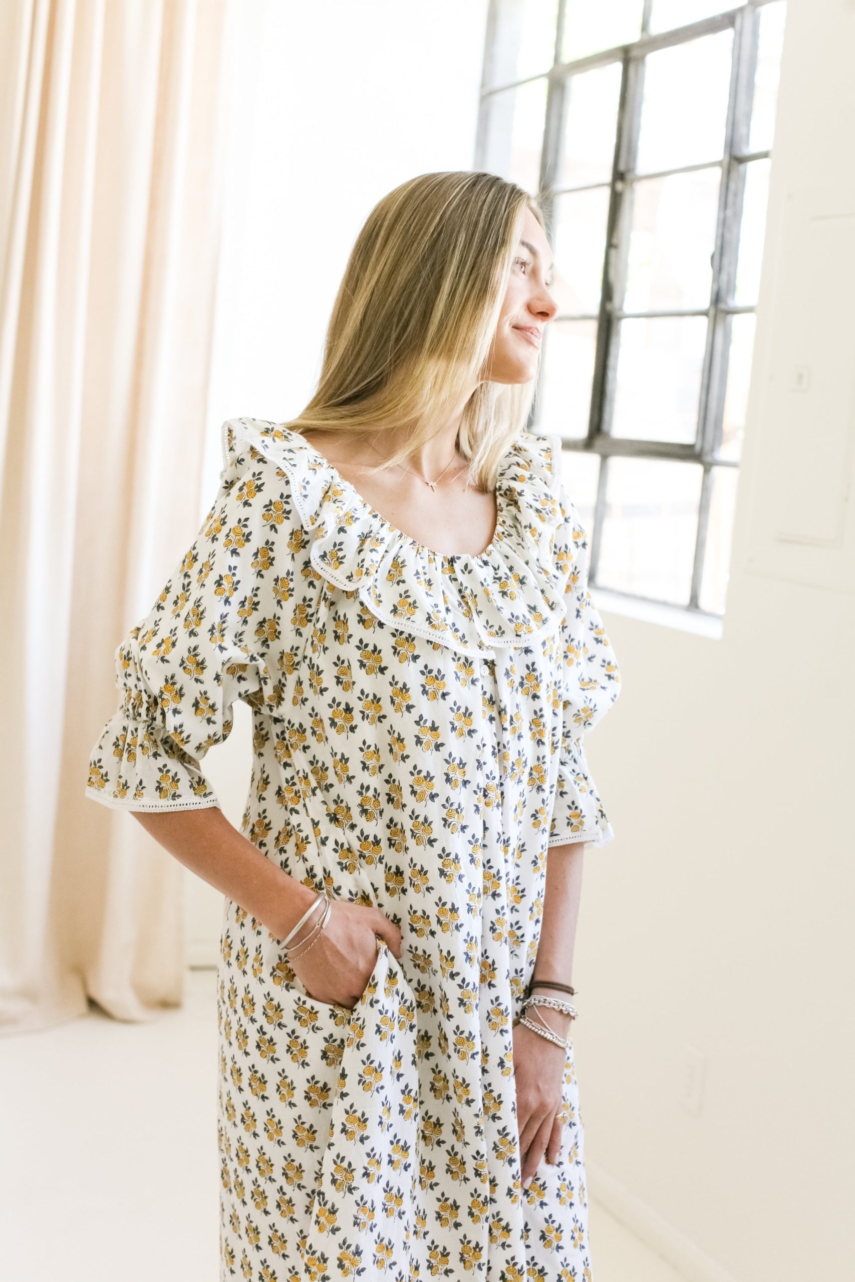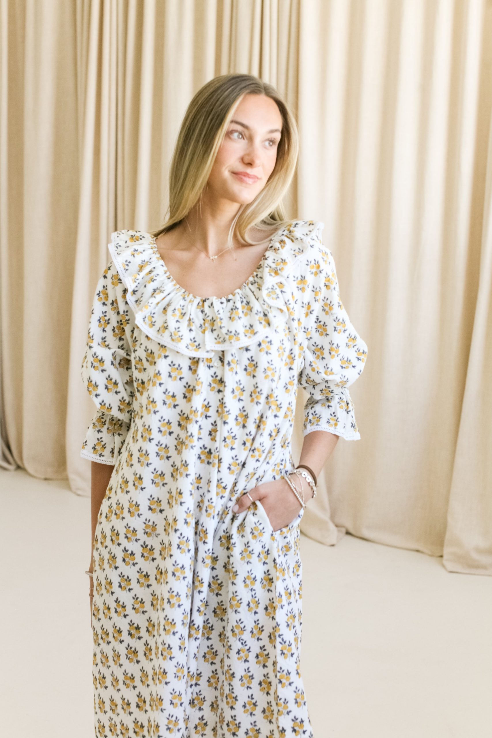 A beautiful long sleeve house dress that is fully lined with eyelet lace detailed ruffles at the neckline and cuffs. Dress is complete with pockets and a button detail at the neckline.