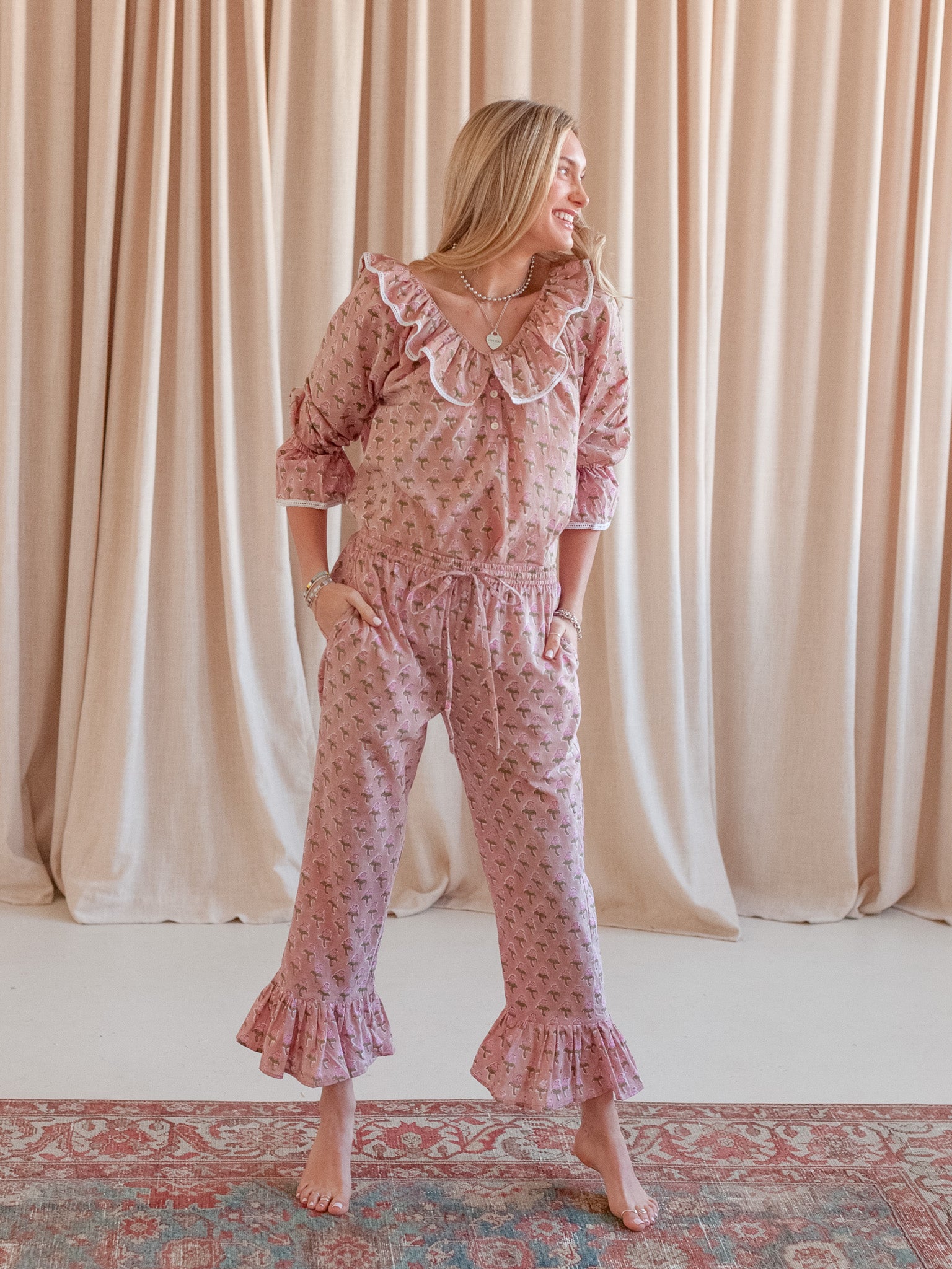 Our pajamas are what dreams are made of. made by the same female owned factory in India that produces our home collection. The fabric is hand block printed and each set made by hand. Pullover top with delicate ruffle details and drawstring pant with pockets. Comes with a sweet pouch.