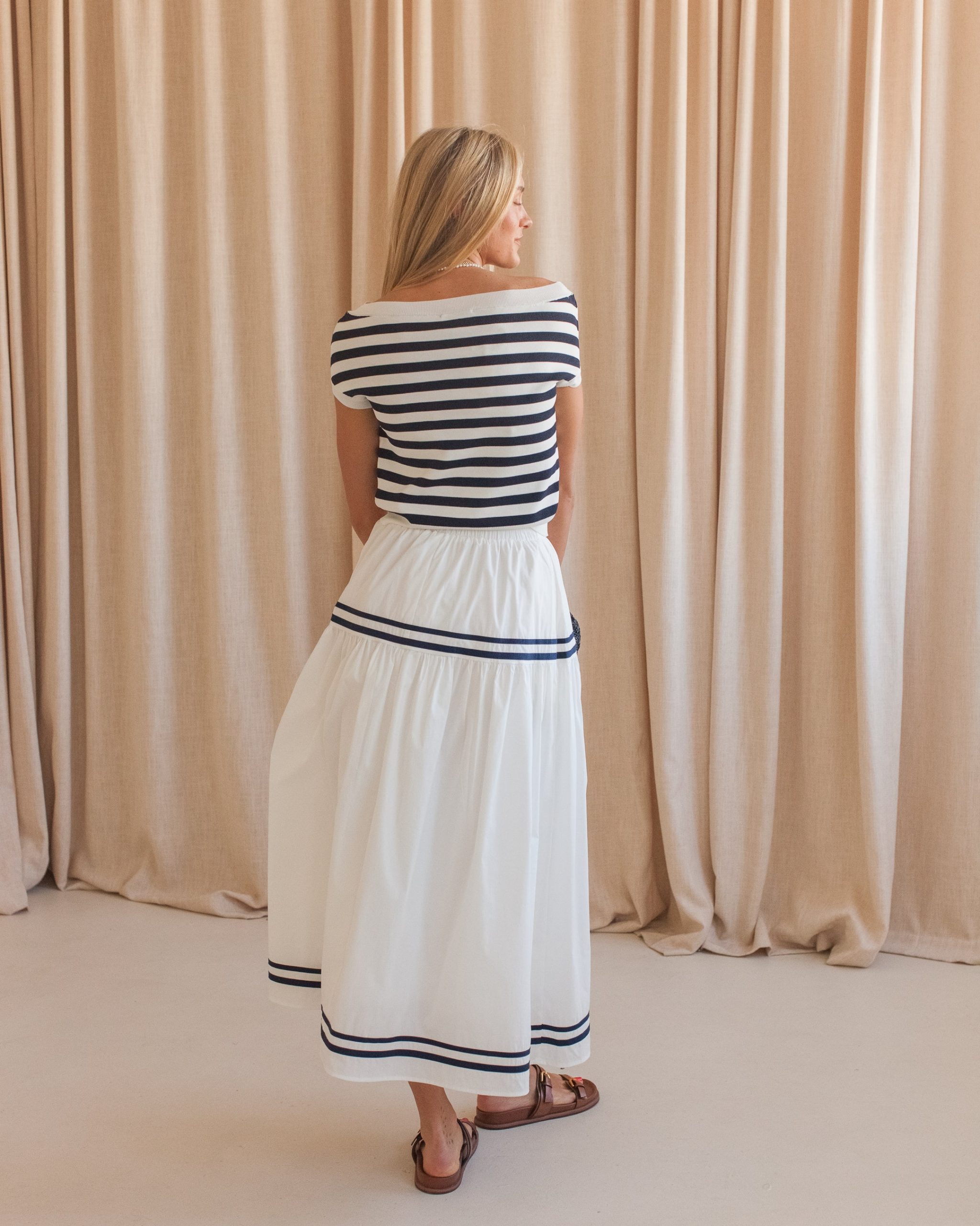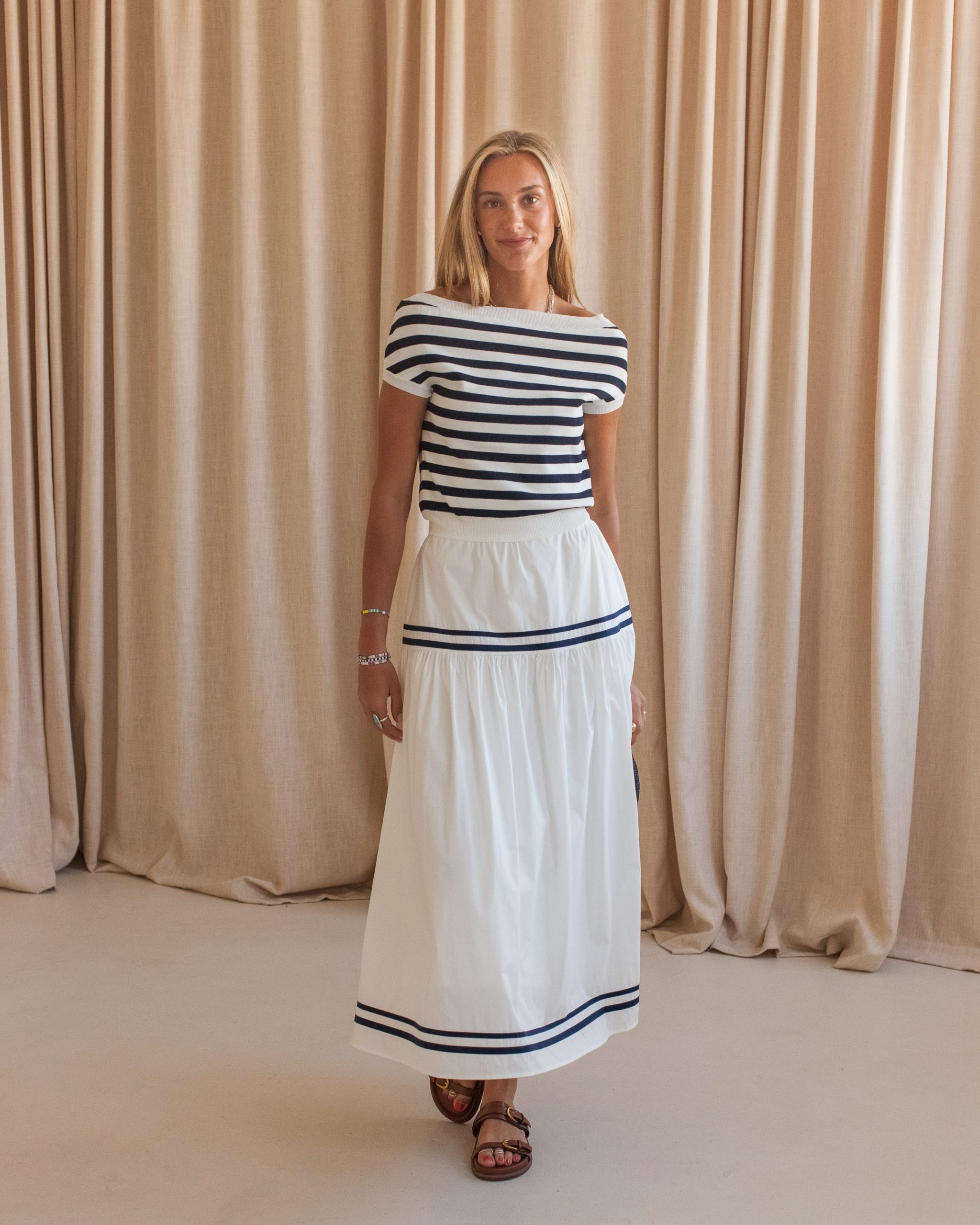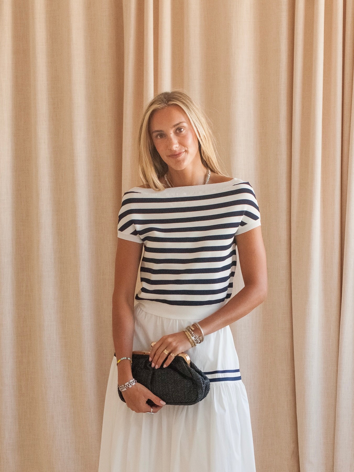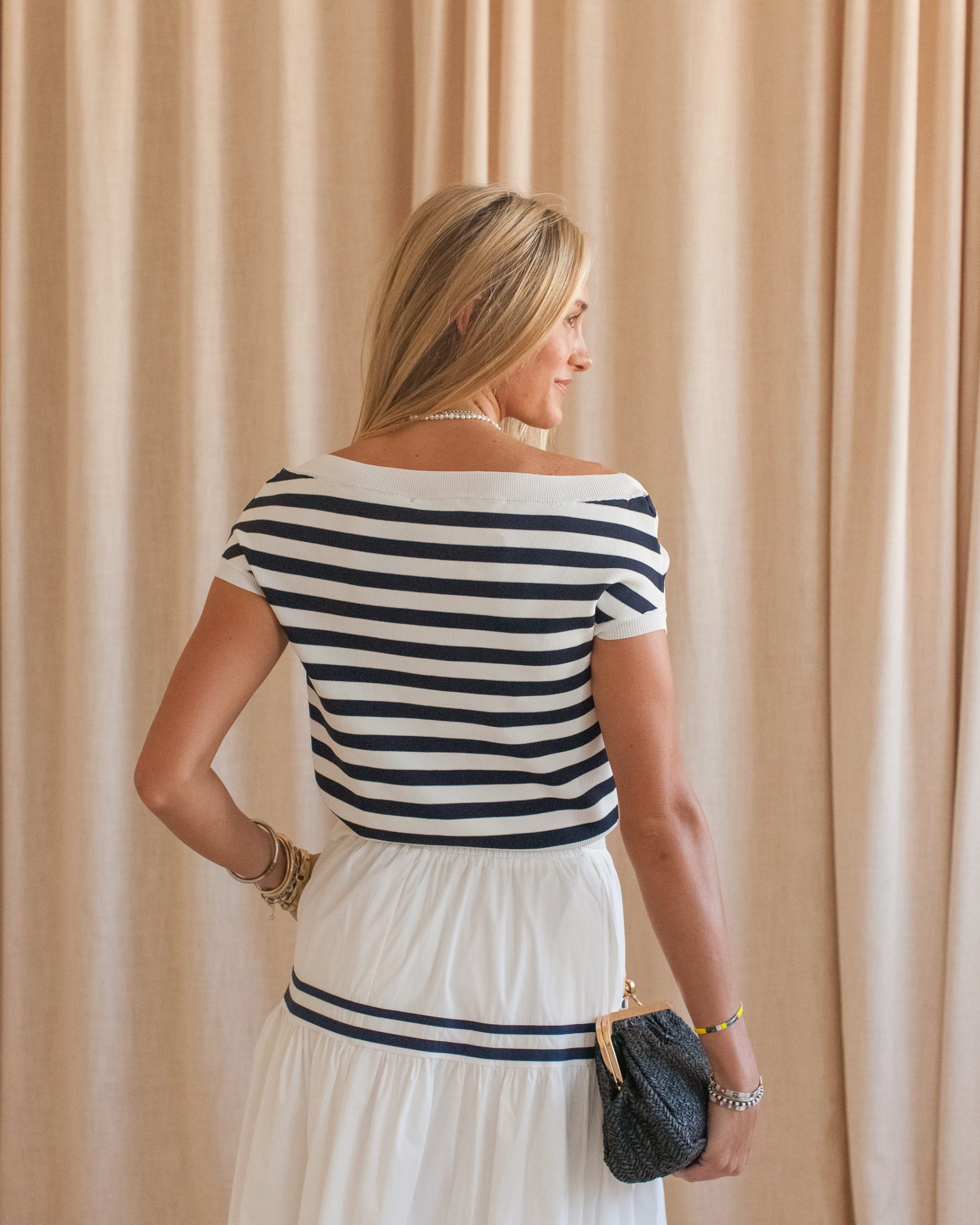 A striped boatneck knit top with cap sleeves and a cropped silhouette. Pair with high rise bottoms such as our Sailor Chambray Pants or Sorrento Tiered skirt for a complete look.