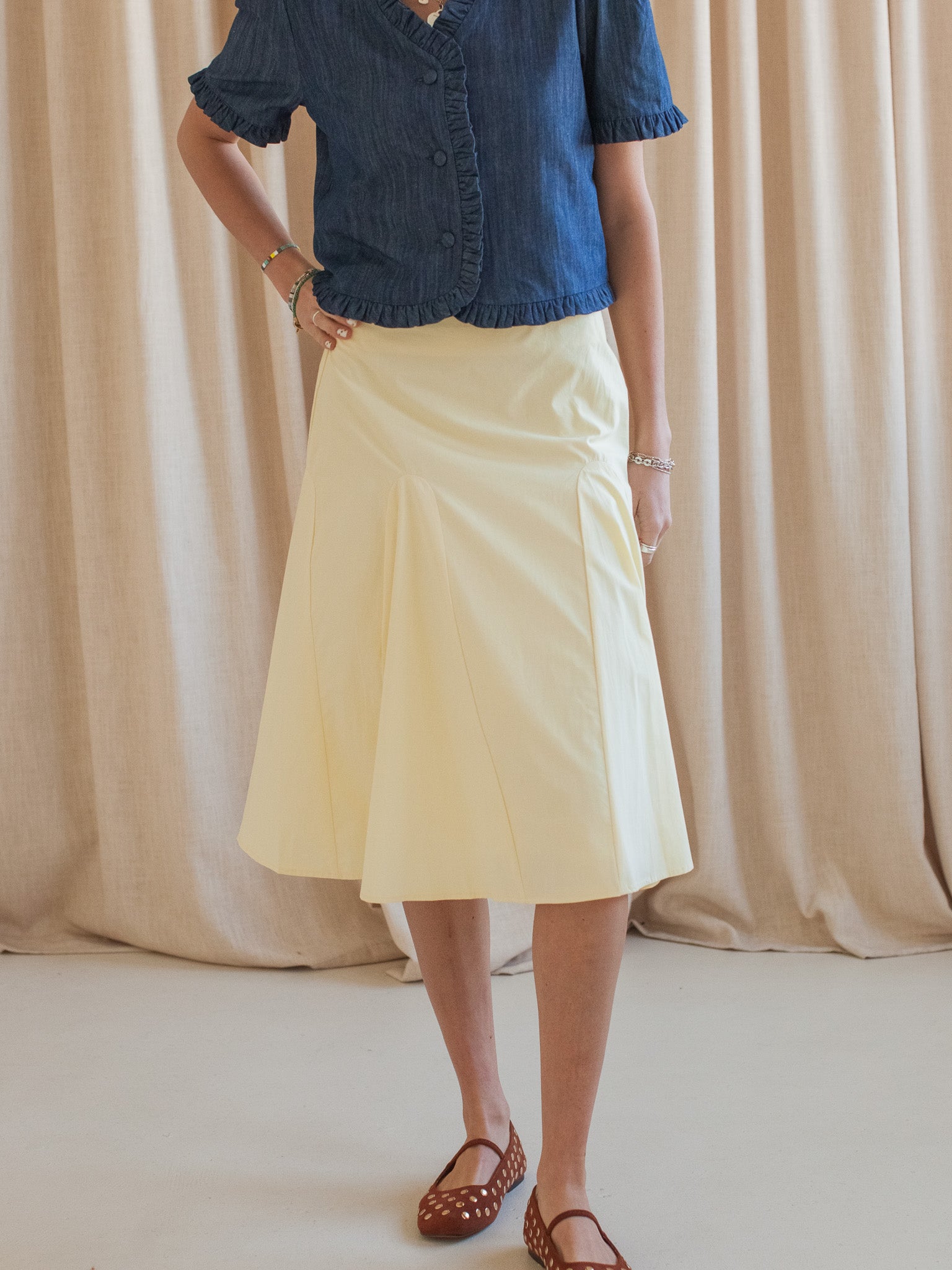This butter yellow knee length poplin skirt features a full silhouette. full lining. and zip closure. Pair with a white tee and sandals.