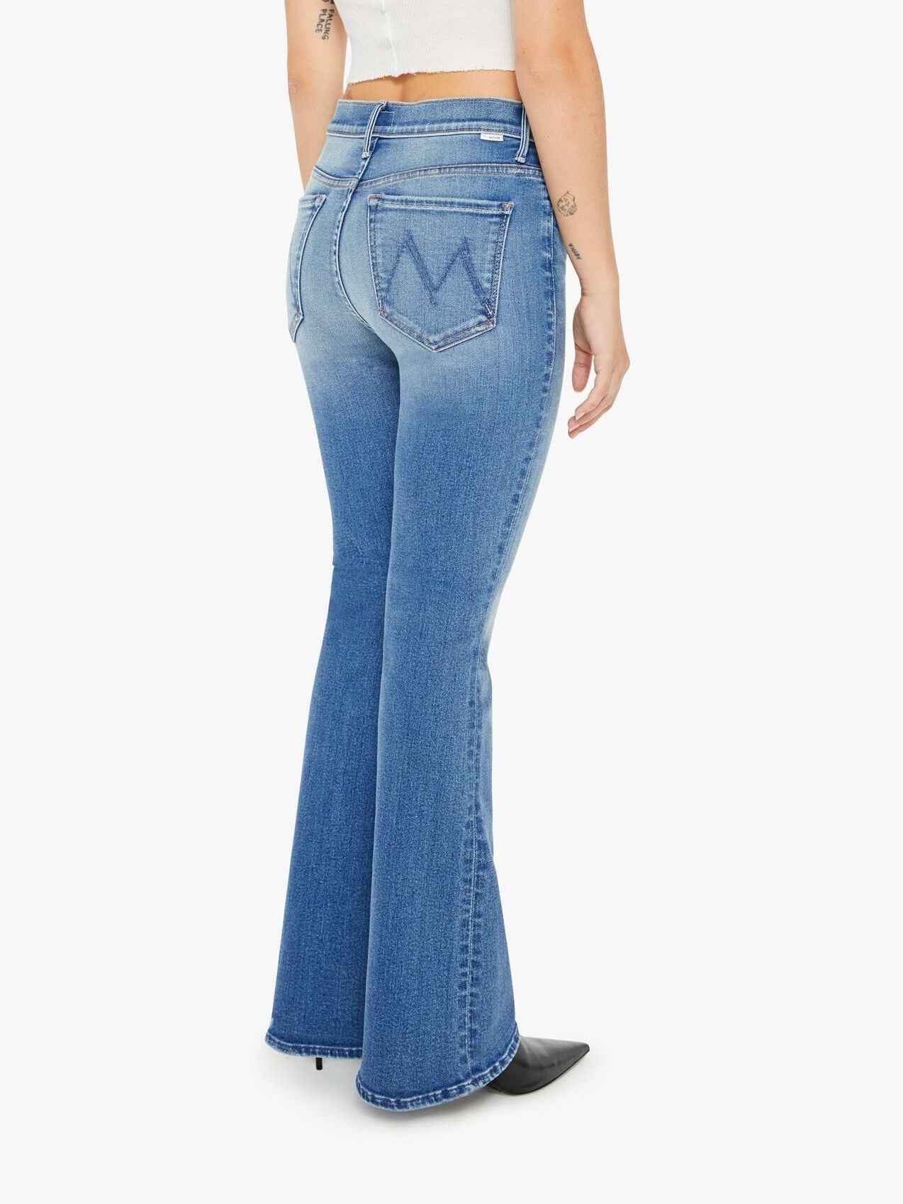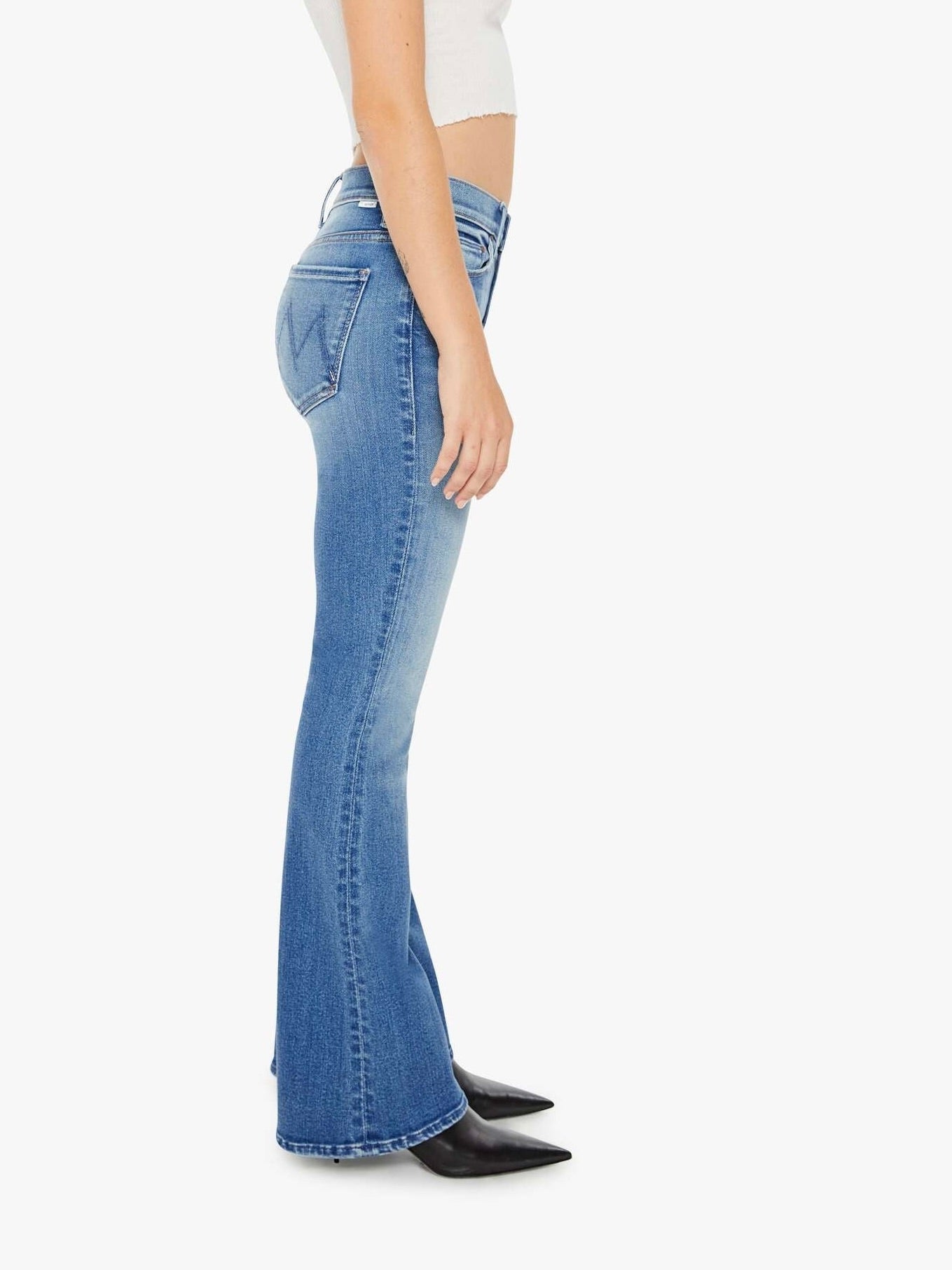 This cult-favorite flare jean has a mid rise with a sneaker-length inseam and a clean hem. Made from stretch denim. Layover is a bright mid-blue wash with whiskering and fading throughout. Pairs well with a spotty Wifi connection and airport snacks.