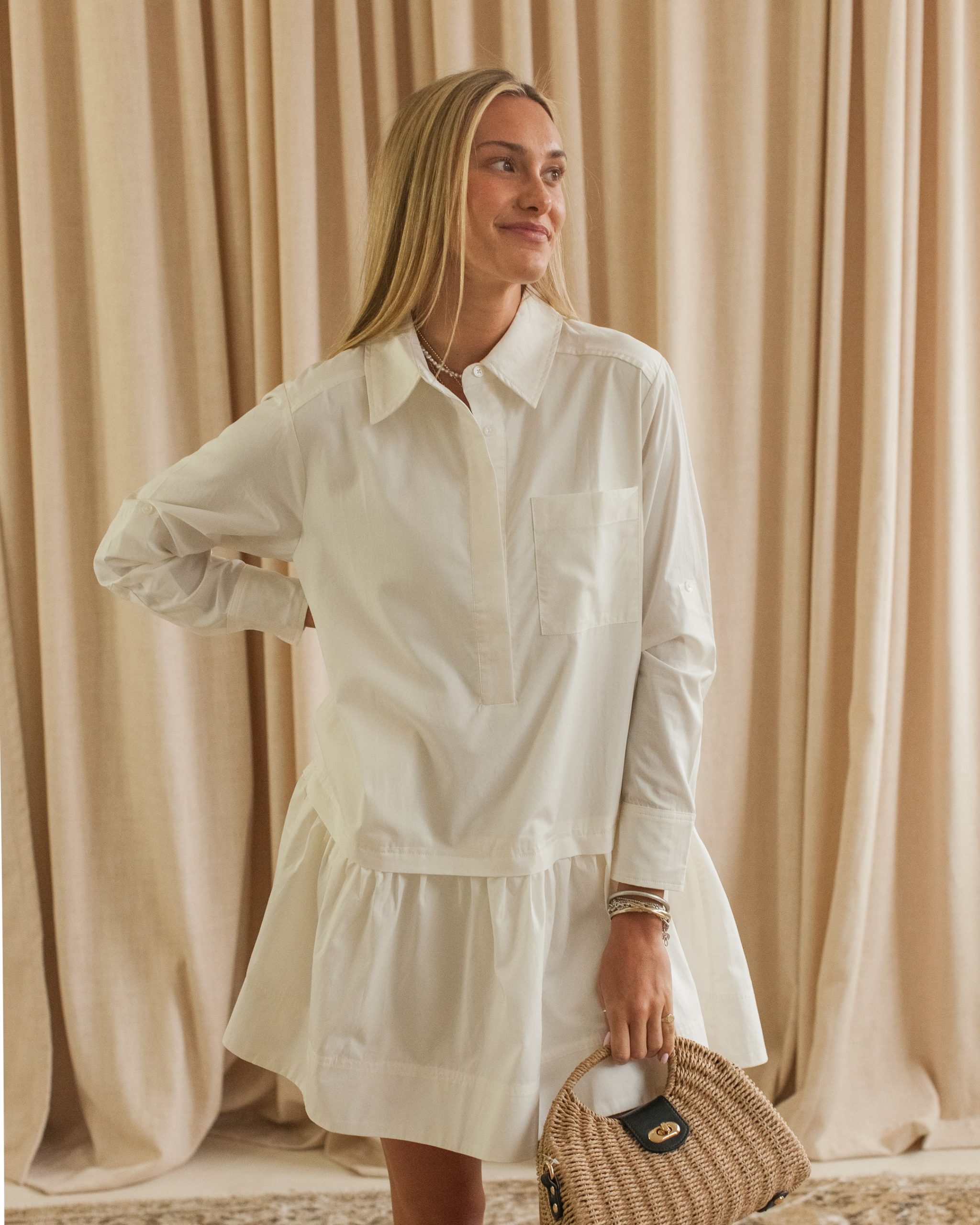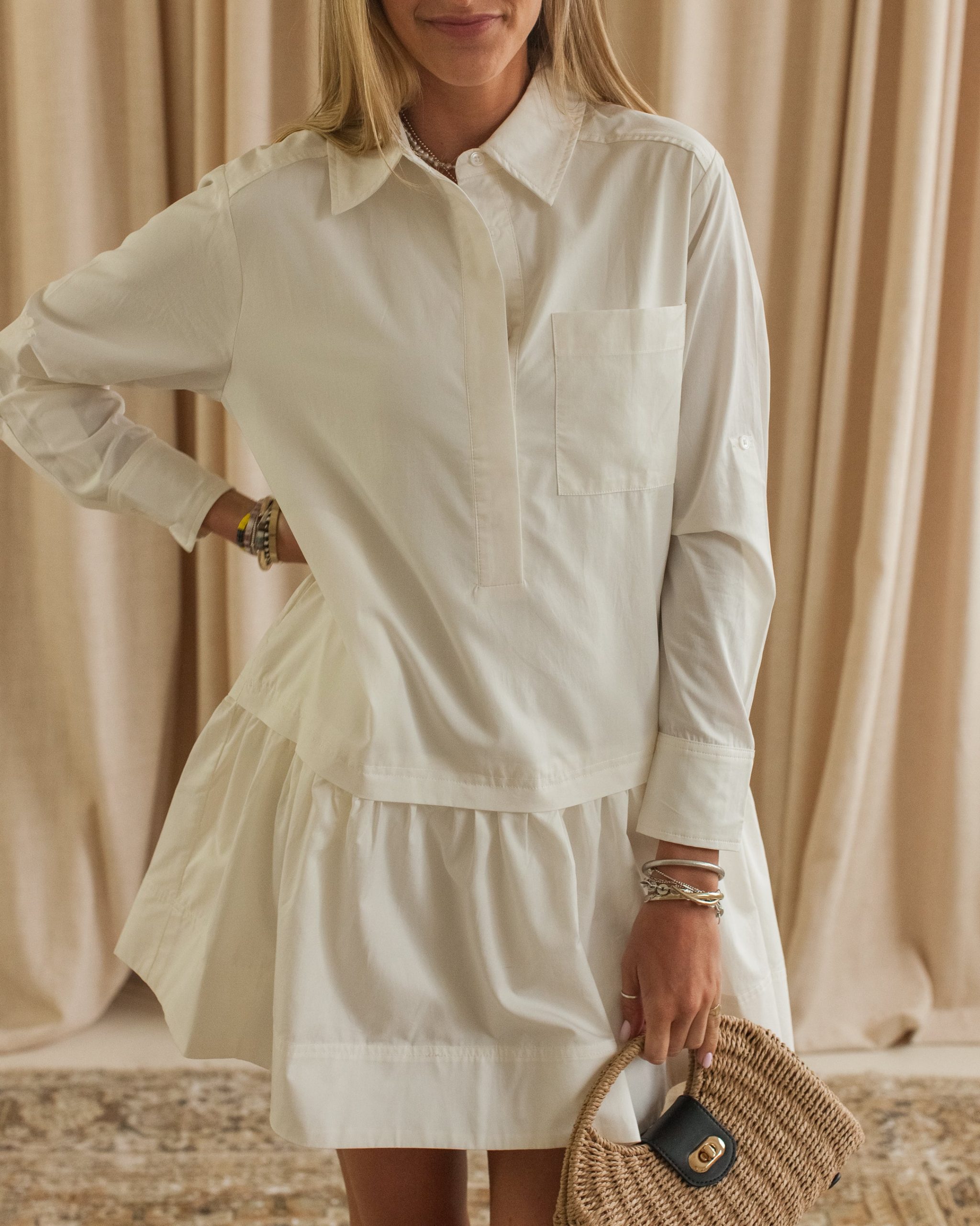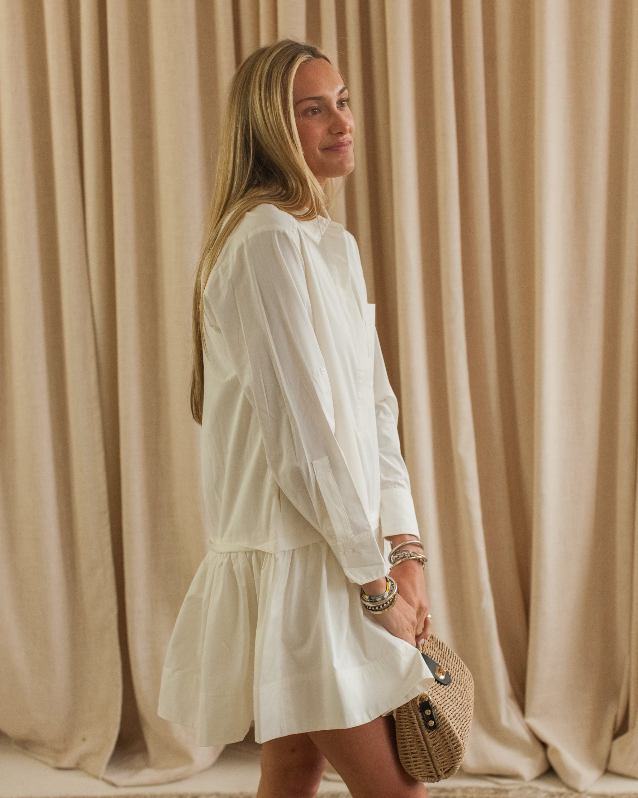 A classic white shirtdress featuring a drop waist. long sleeves. and is complete with two side pockets. Pair with sneakers for a casual look or heels for a night out.