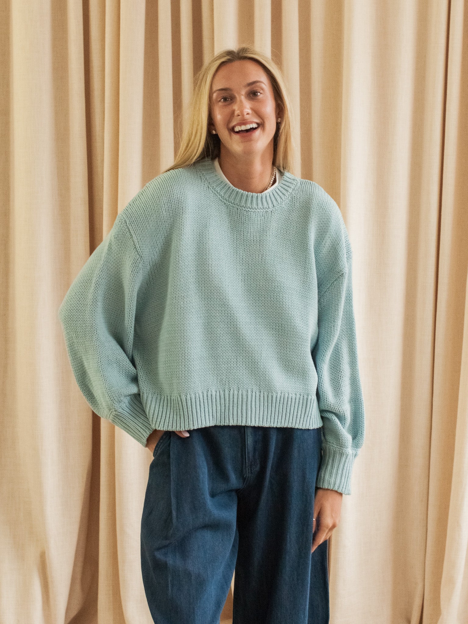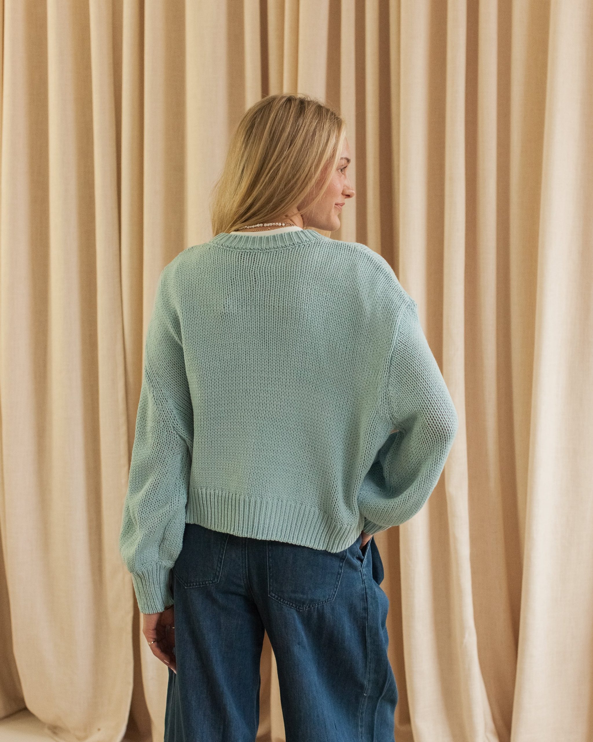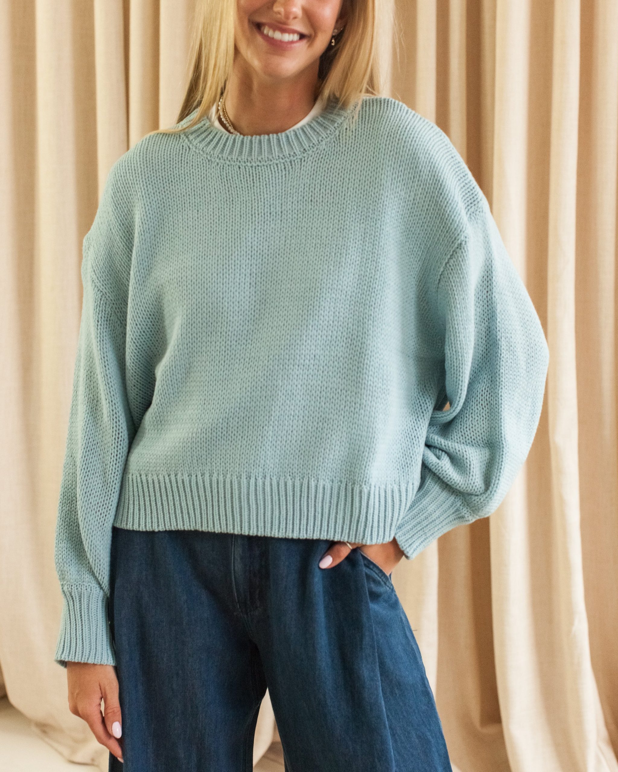 An open knit oversized pullover sweater with a slightly cropped silhouette and ribbed trim along the neckline. cuffs. and waistband. Pair with shorts or over a sundress for spring.