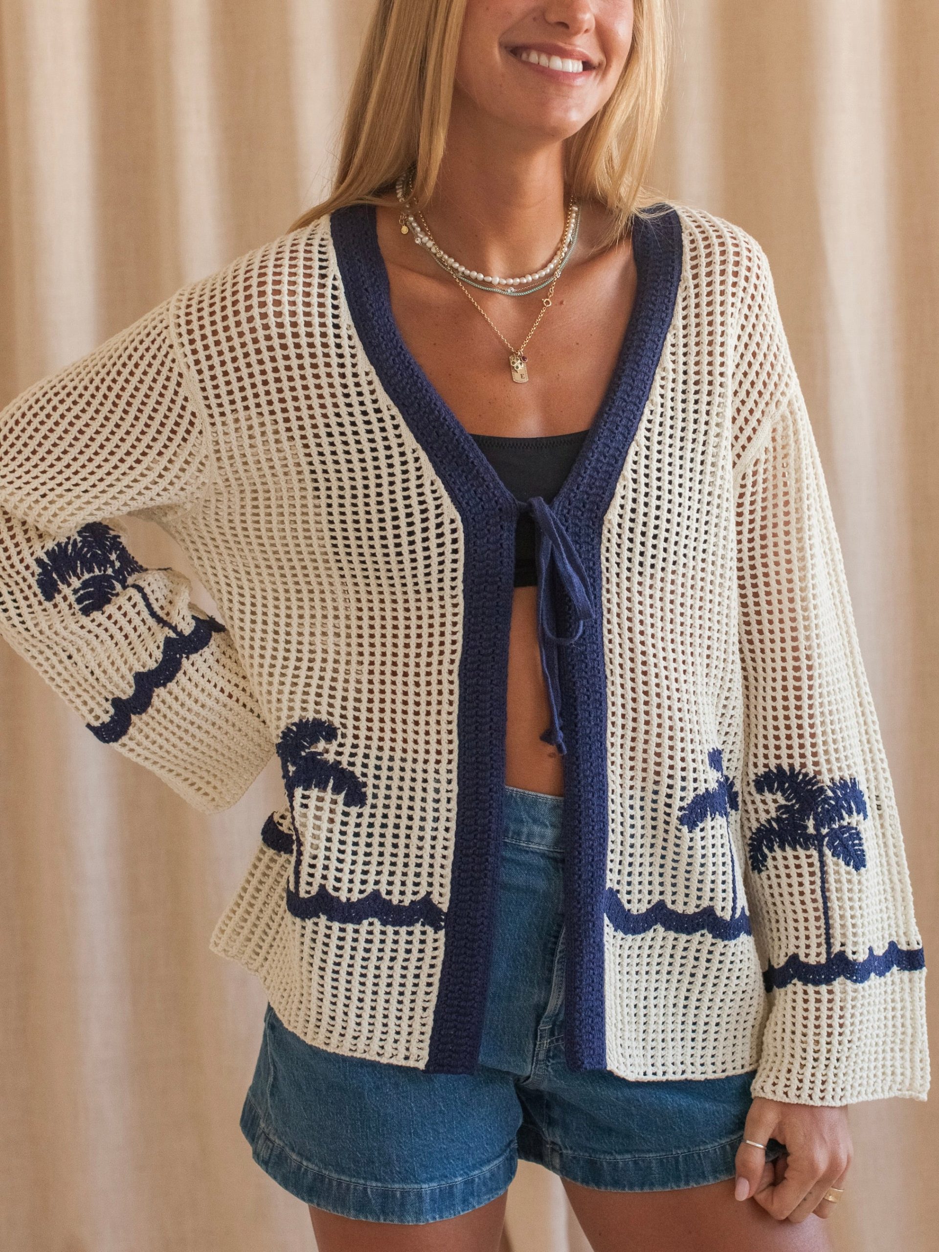 This open knit tie front cardigan features a color blocked palm tree and water motif. Pair over shorts and a one piece swimsuit on your next beach vacation or wear with a white tee and jeans.