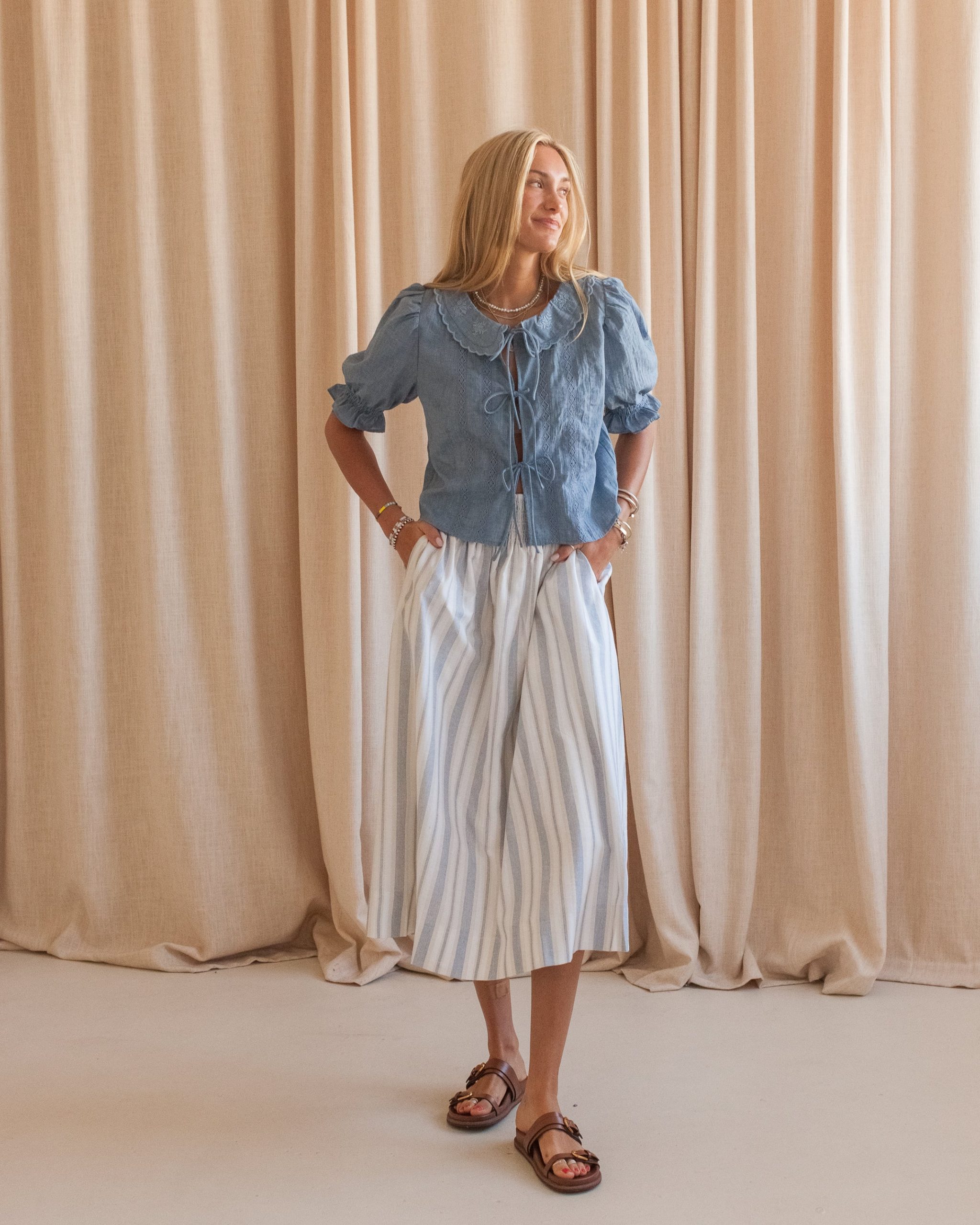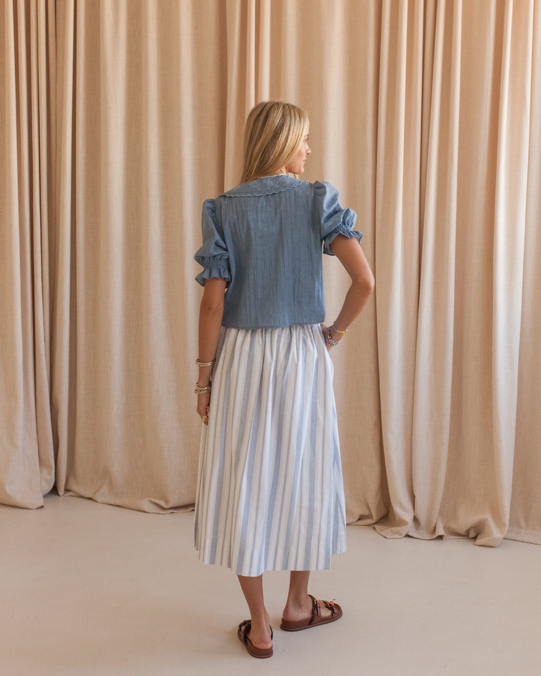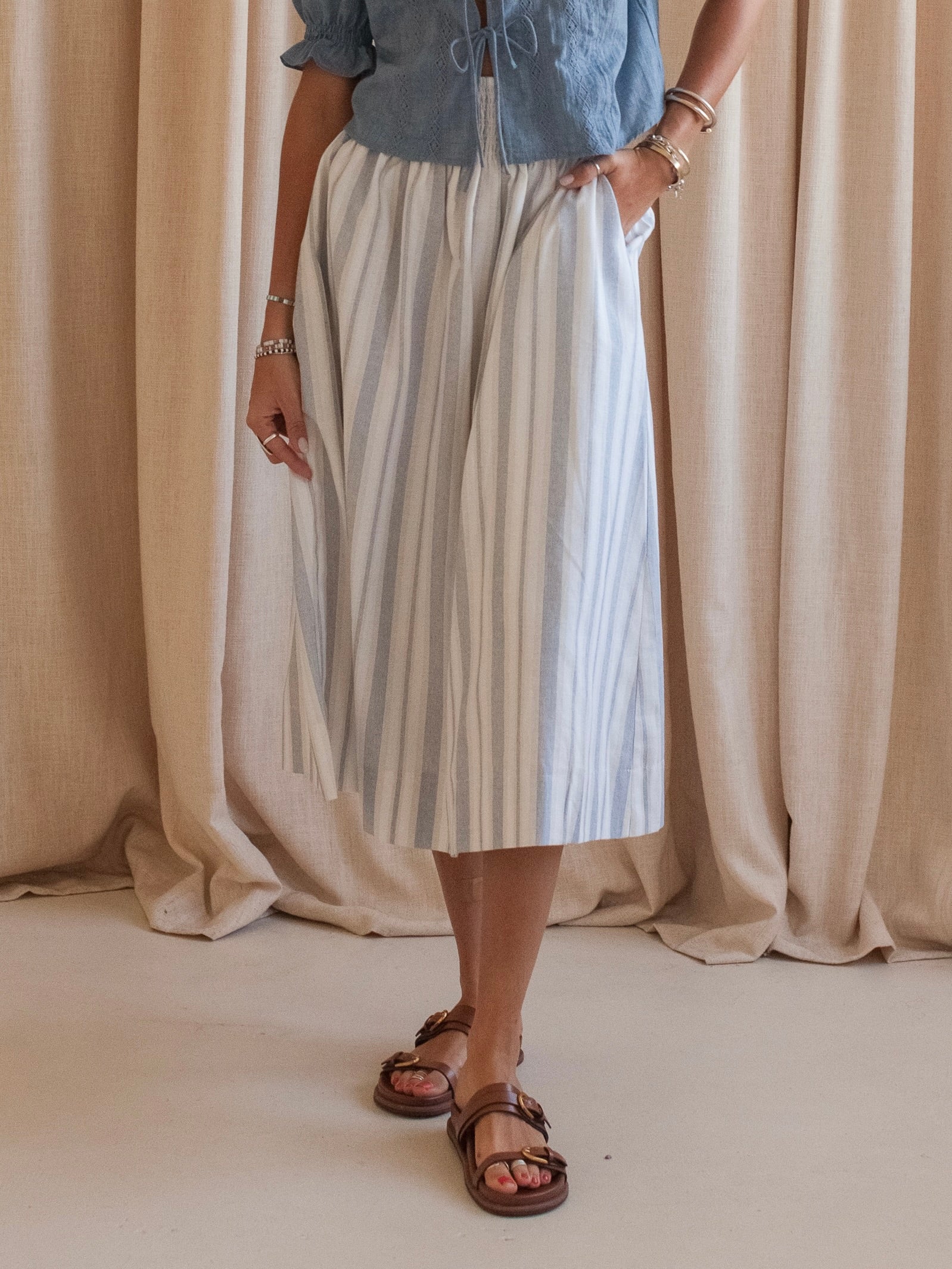 This mid length skirt is constructed from cotton and linen and features a smocked waistband. full lining. and pockets. Pair with a white blouse and sandals.
