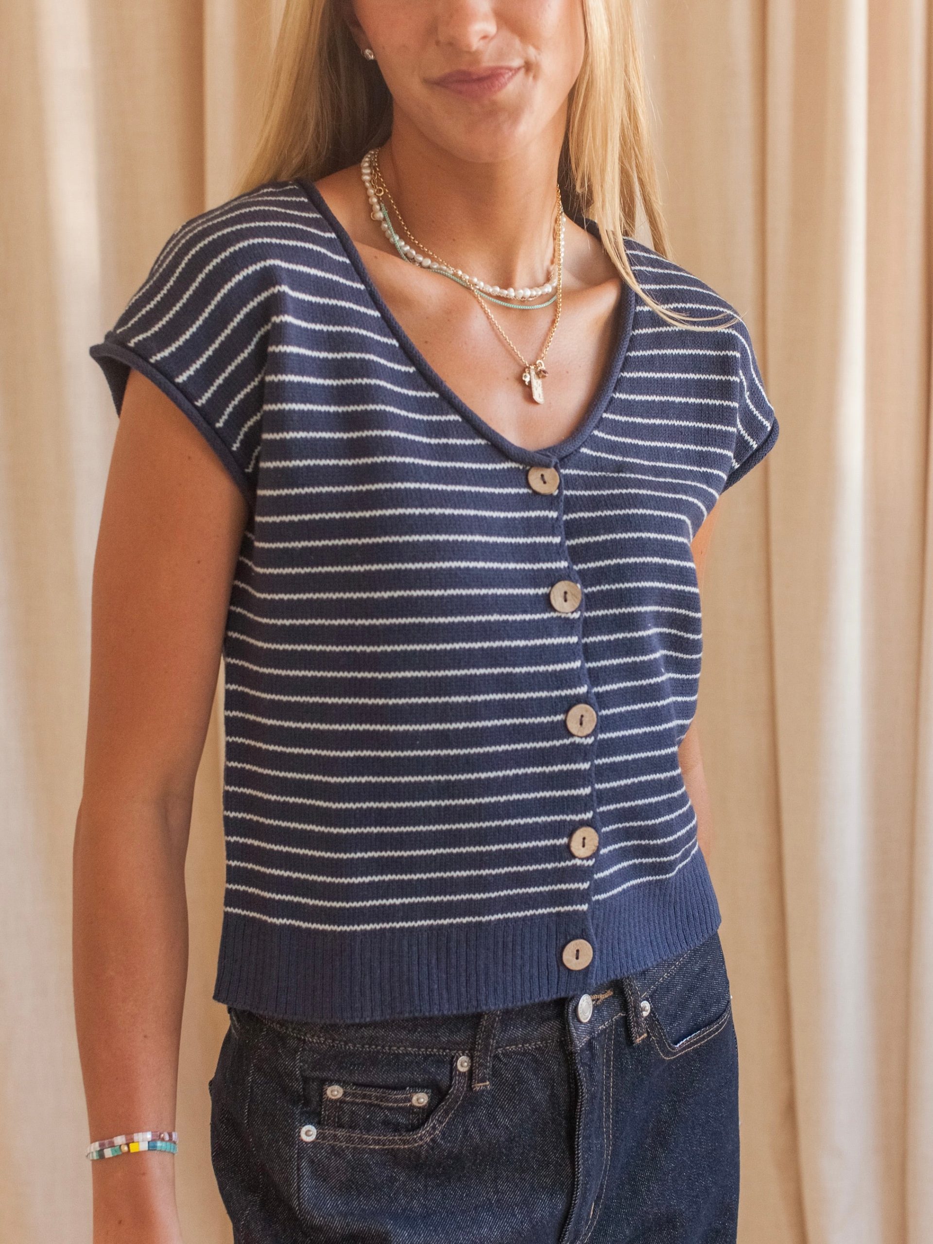 A wardrobe staple piece. this button front striped knit features a scoop neck with raw hems. Pair with denim or trousers.