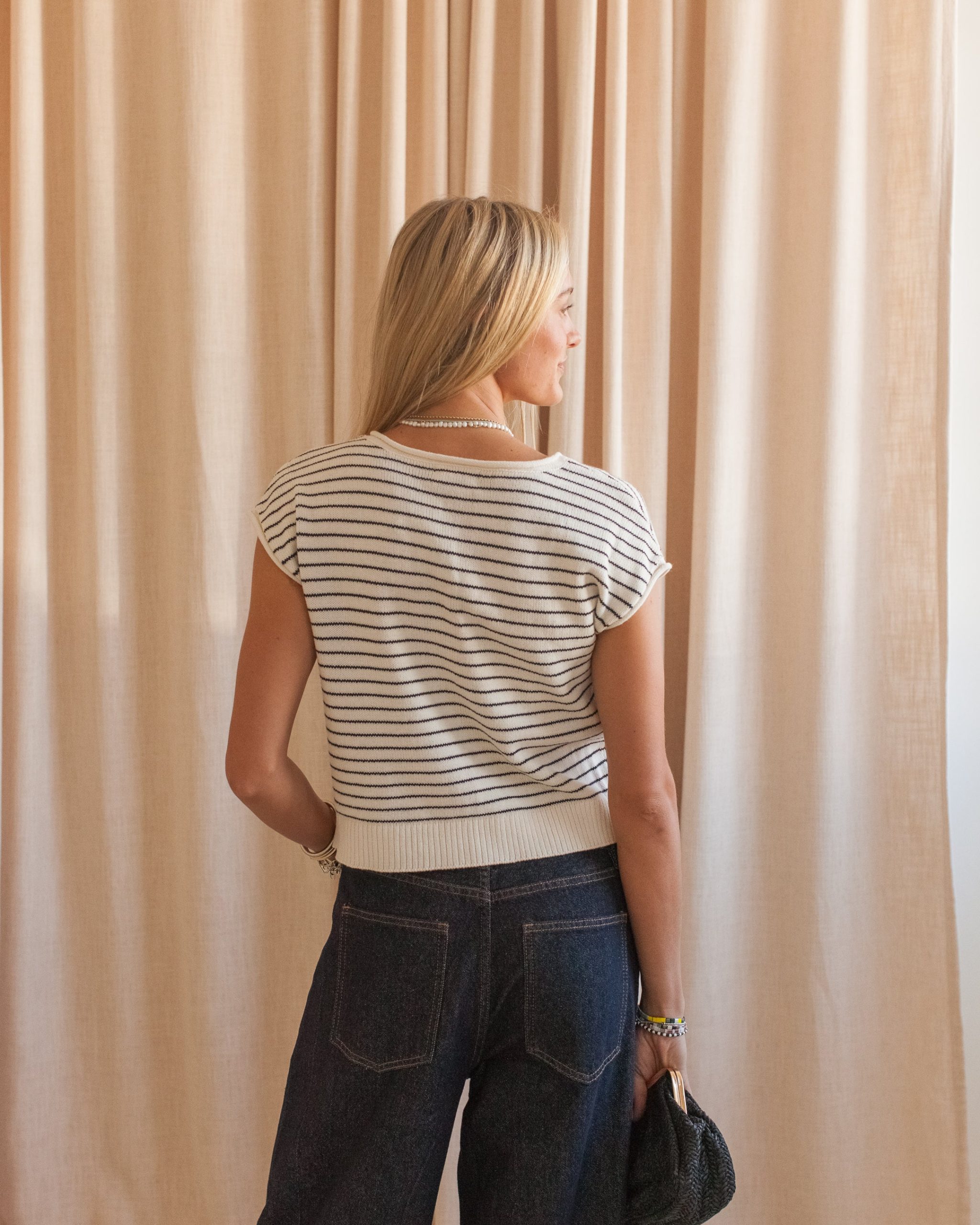 A wardrobe staple piece. this button front striped knit features a scoop neck with raw hems. Pair with denim or trousers.