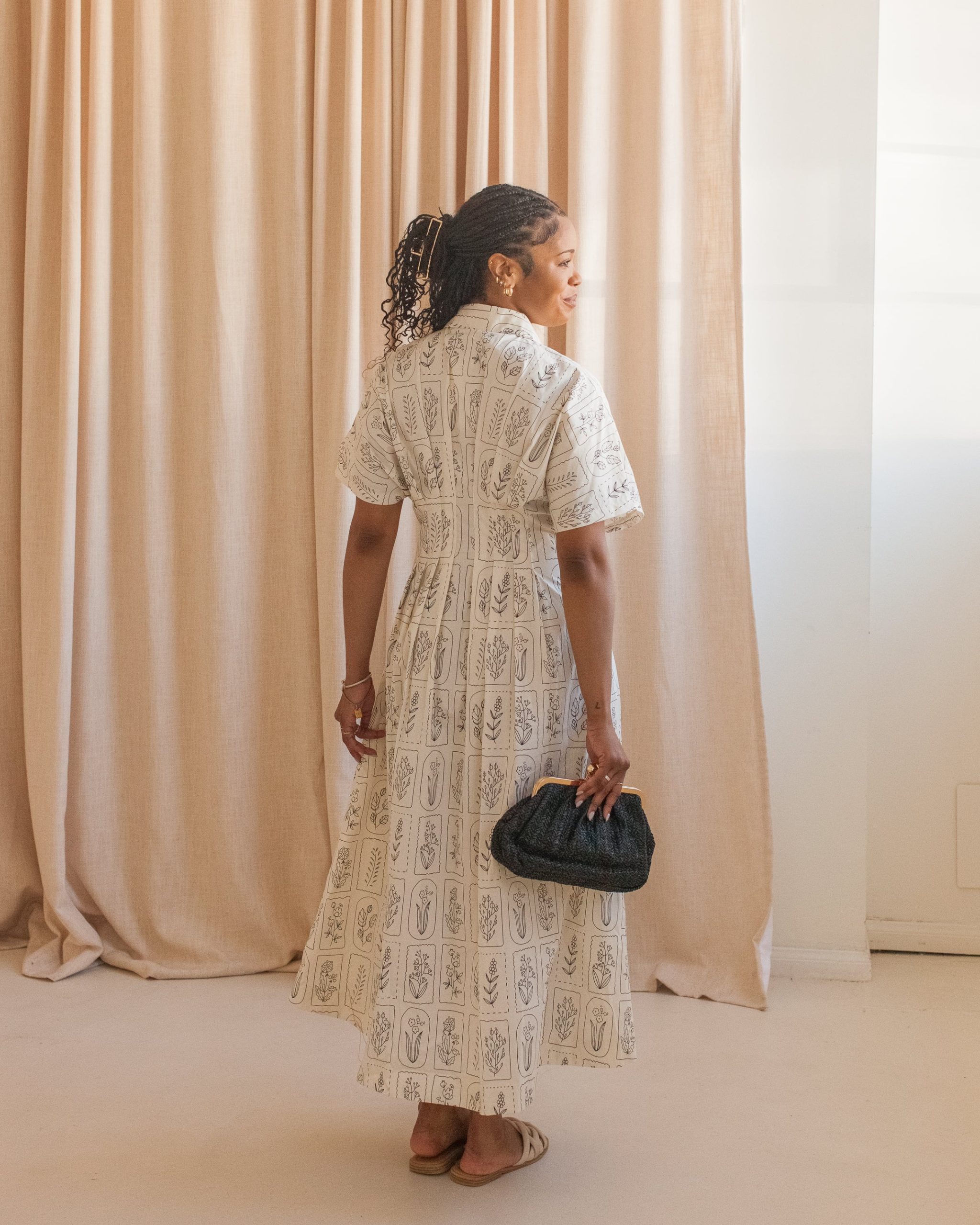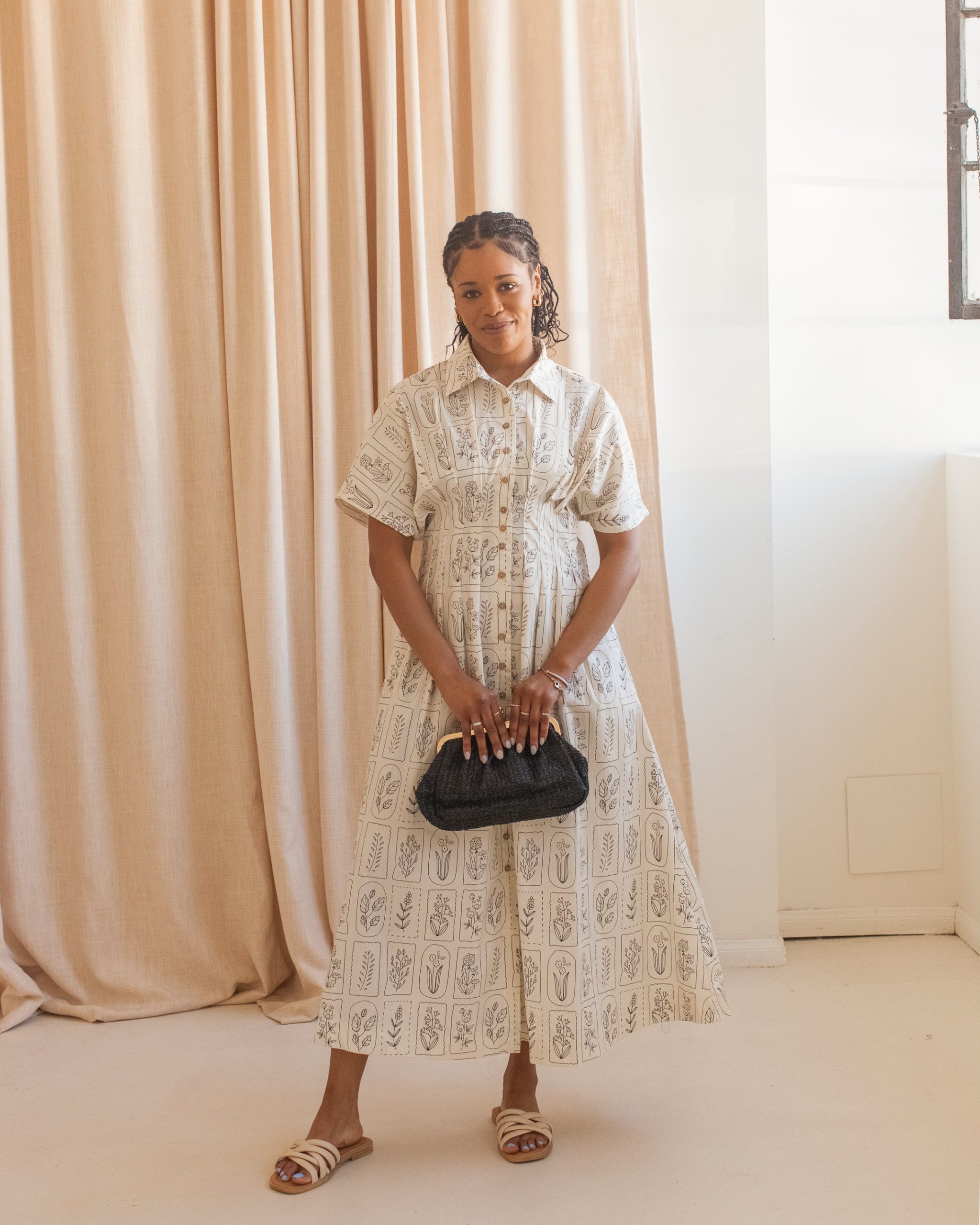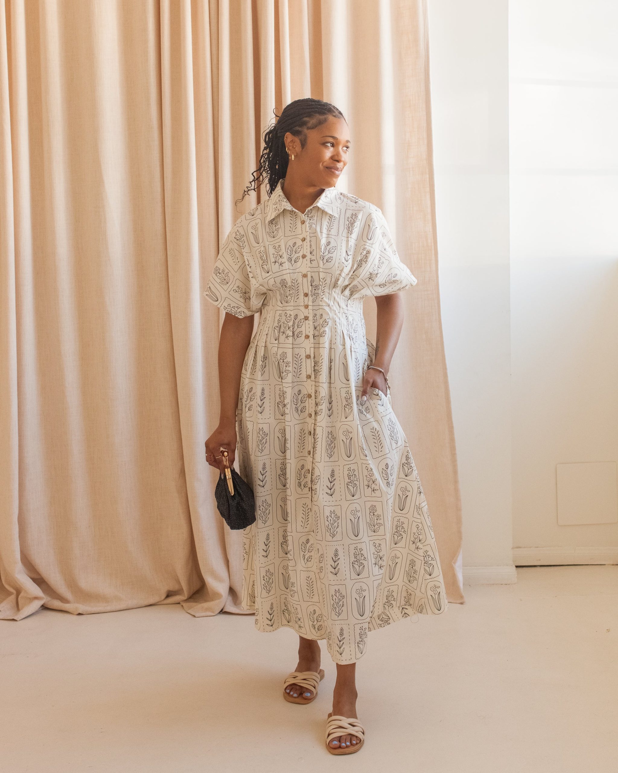 This cotton midi dress features a hand drawn style floral motif with a fitted waist. button front. and pockets. Pair with black sandals and a basket tote for warm weather.