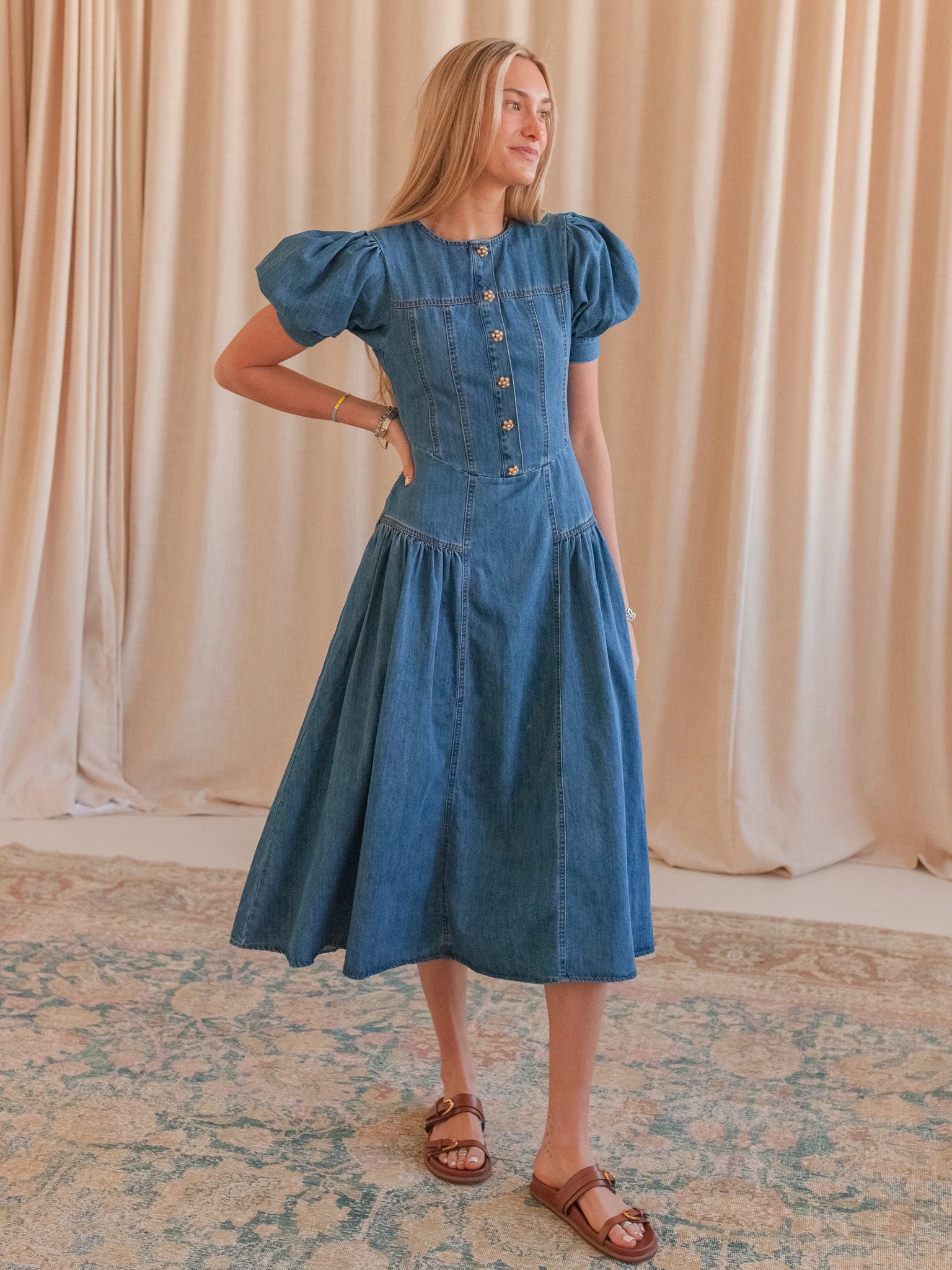 A cotton midi dress with statement floral pearl button detailing on bodice. Features a full skirt with pockets. fitted waist with shirring details. and short puff sleeves.