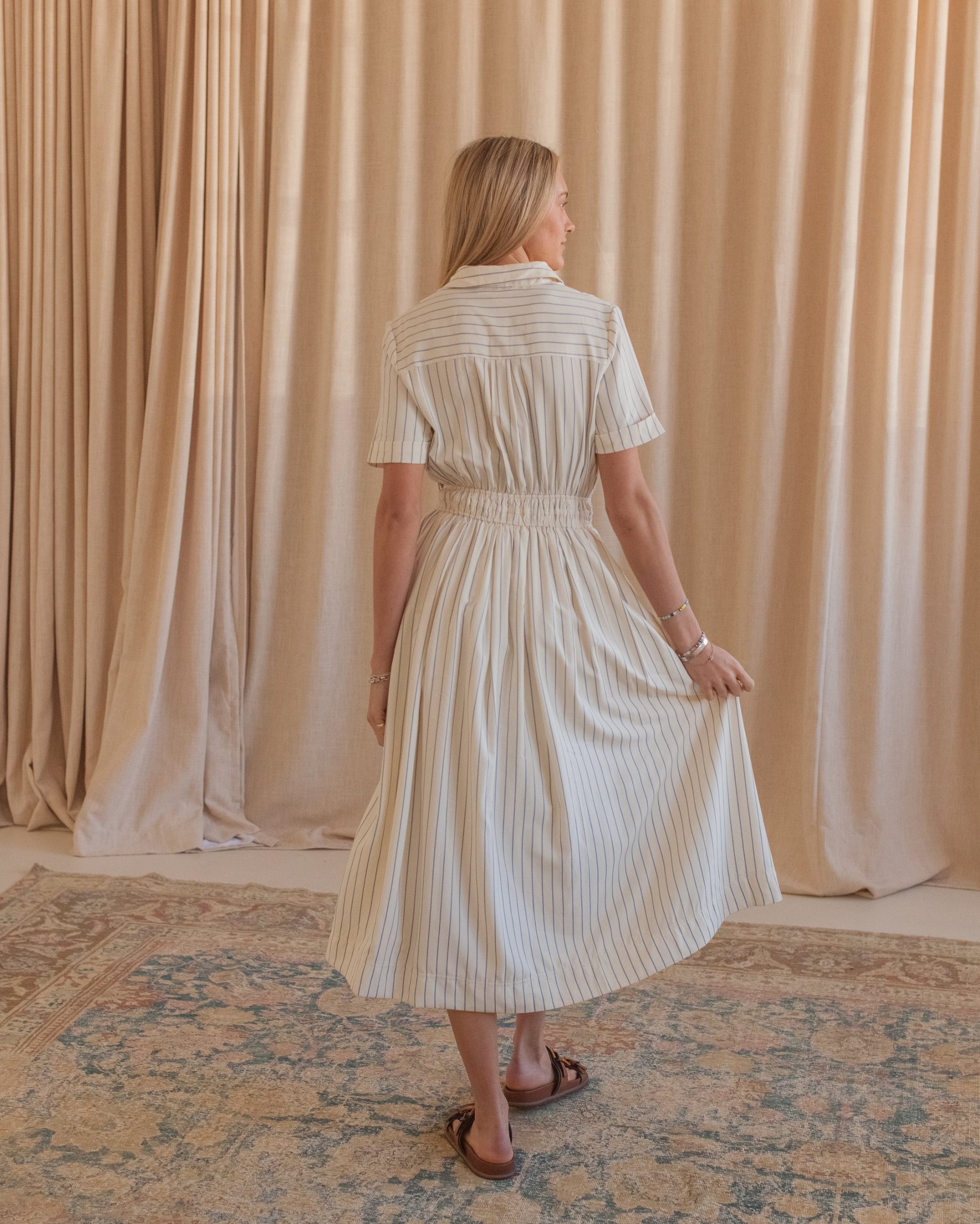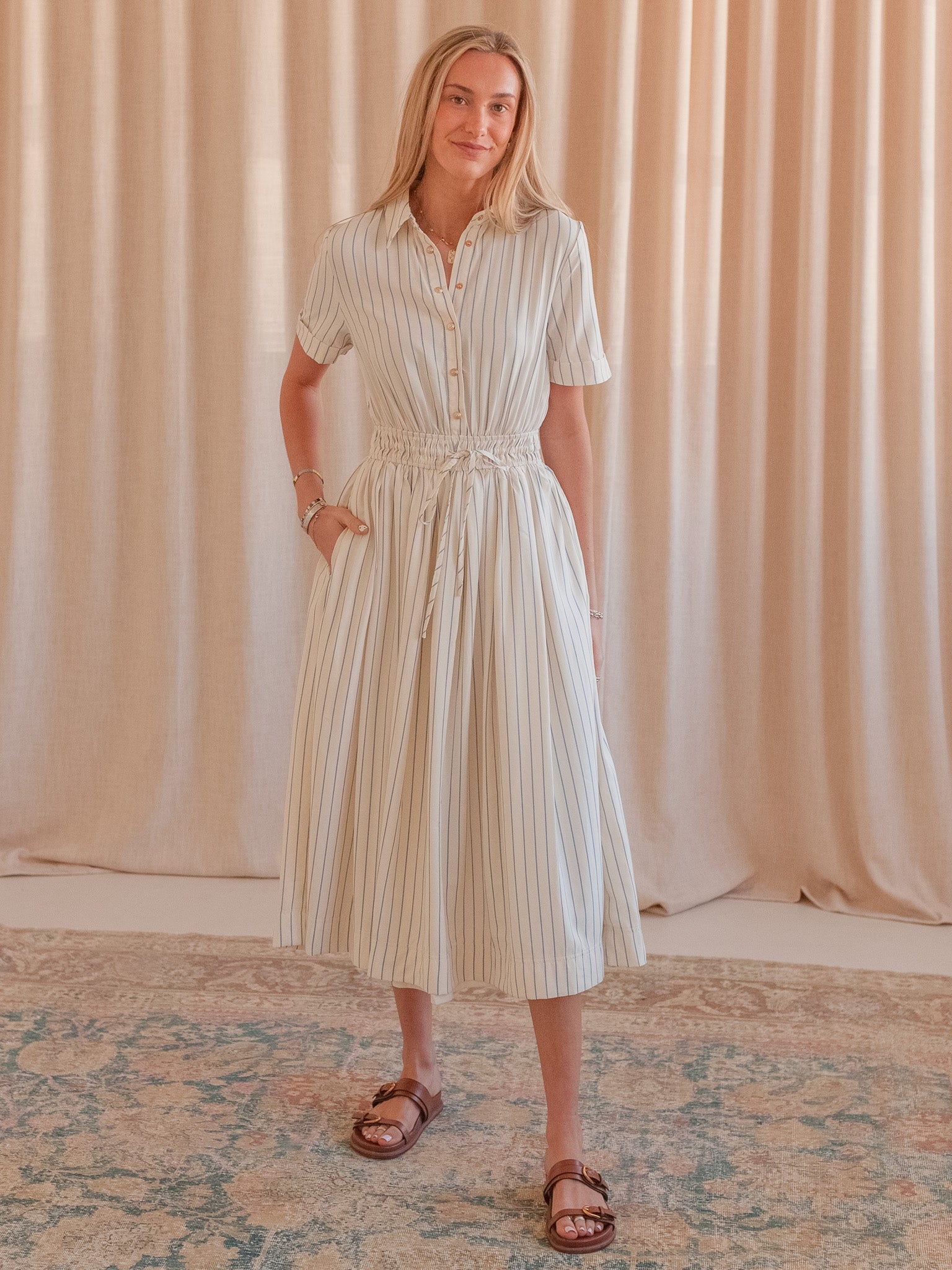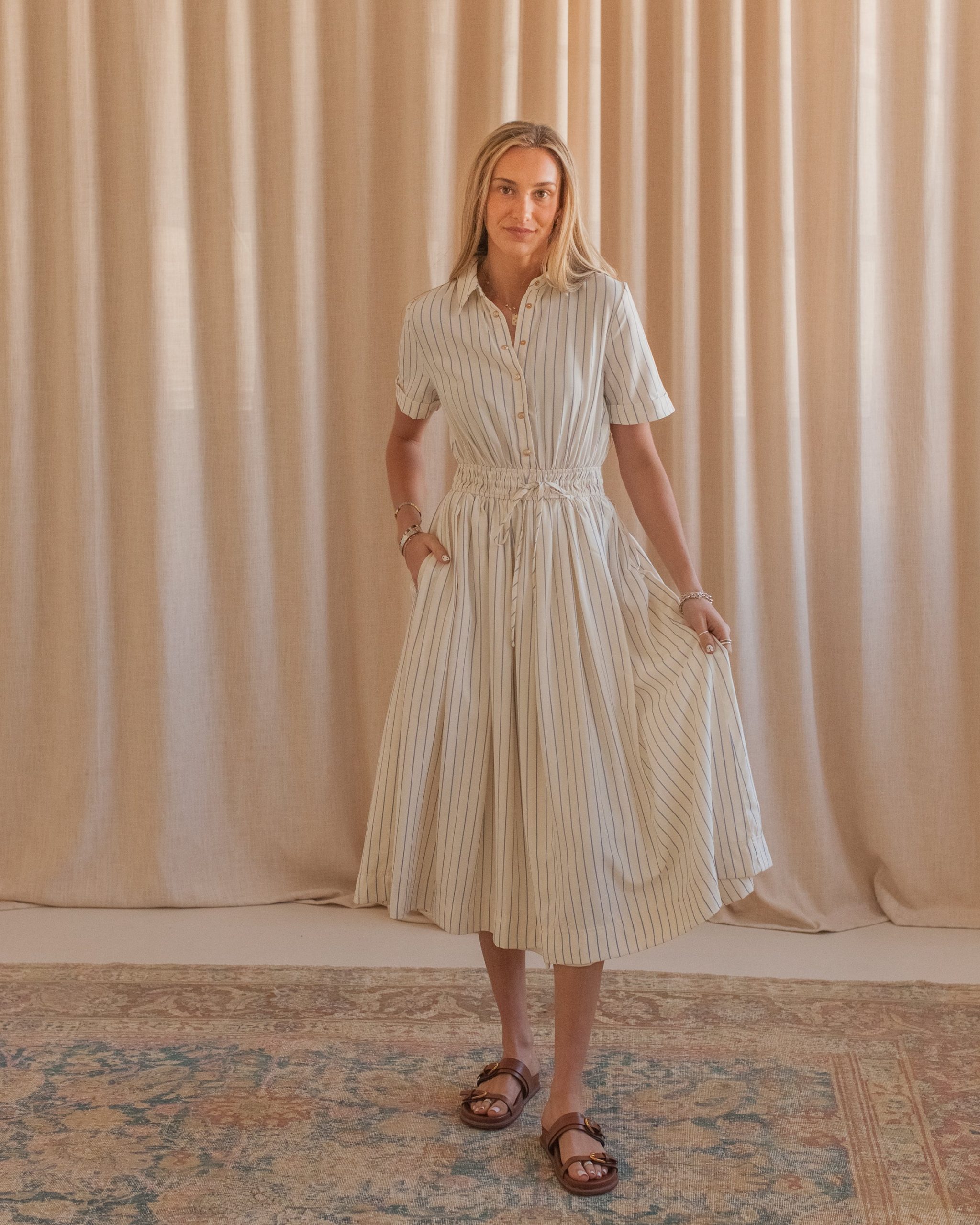 This striped midi shirtdress is constructed from a flowy. lightweight cotton and features an adjustable fitted waist. pockets. gold buttons. and a collar. Pair with sandals and a leather tote for warm days.