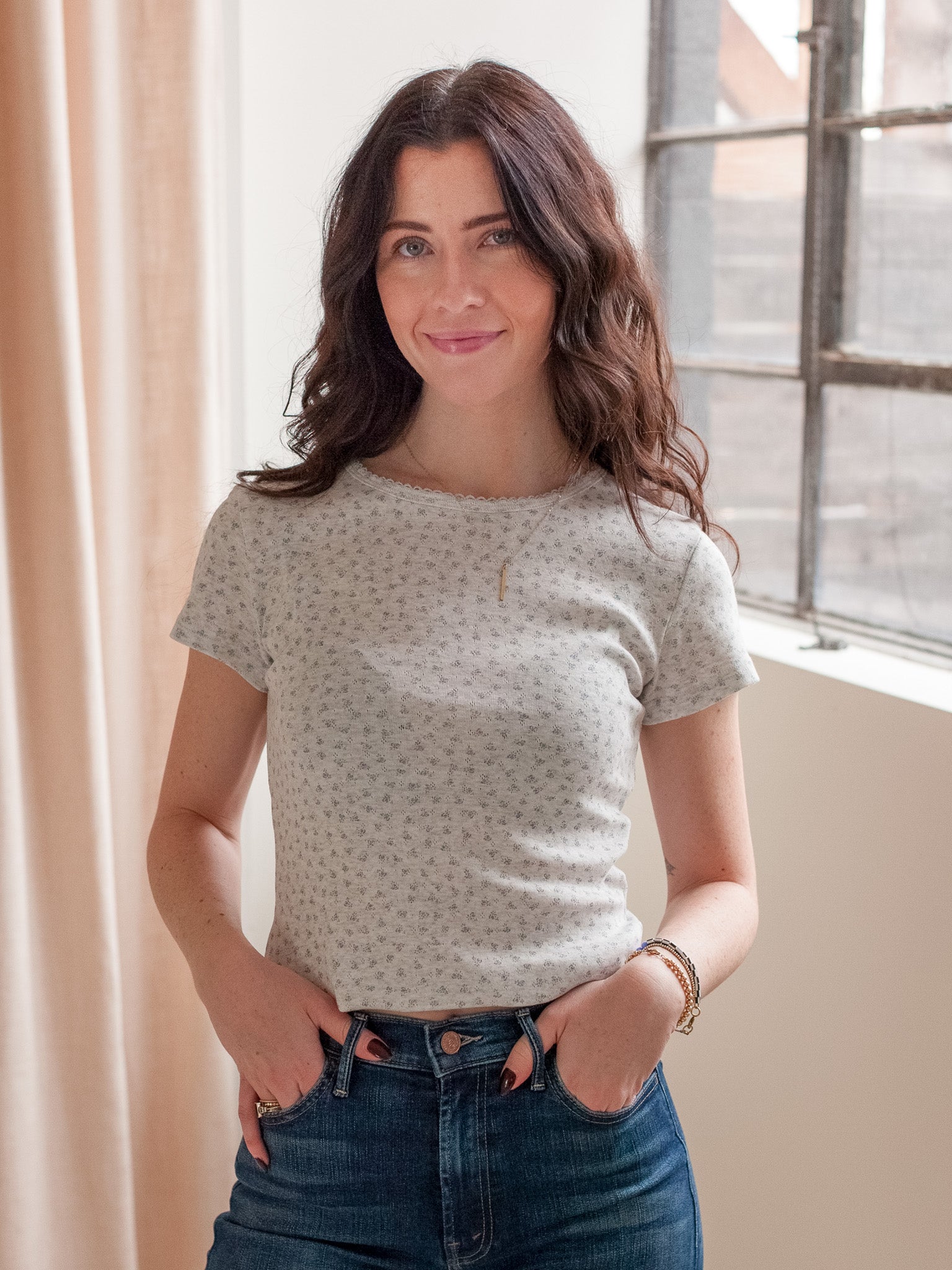 The perfect spring layering piece. this pointelle crewneck tee features a delicate floral pattern and lace trim at the neckline.